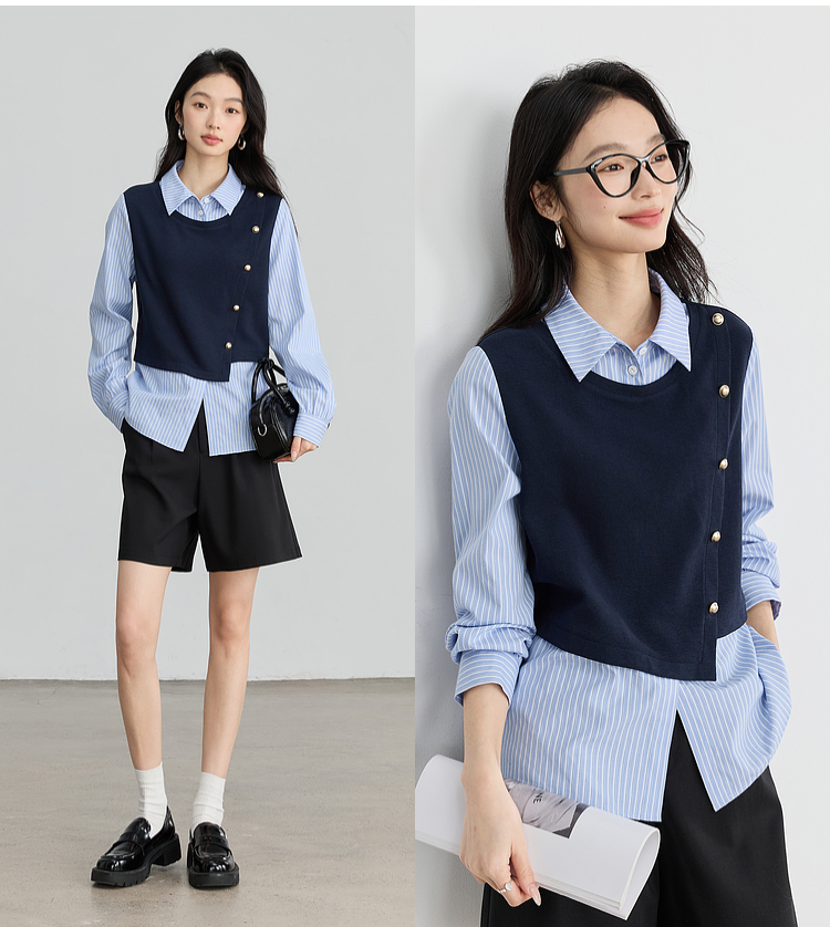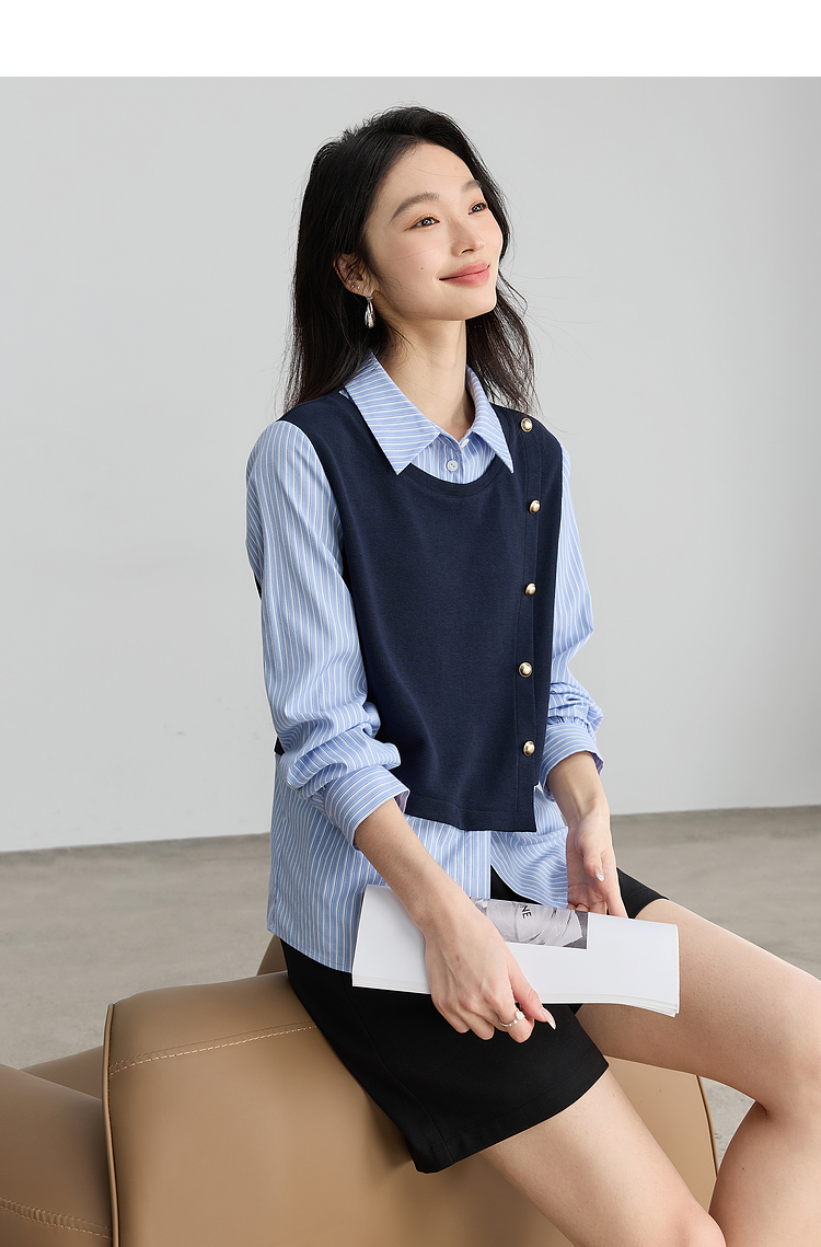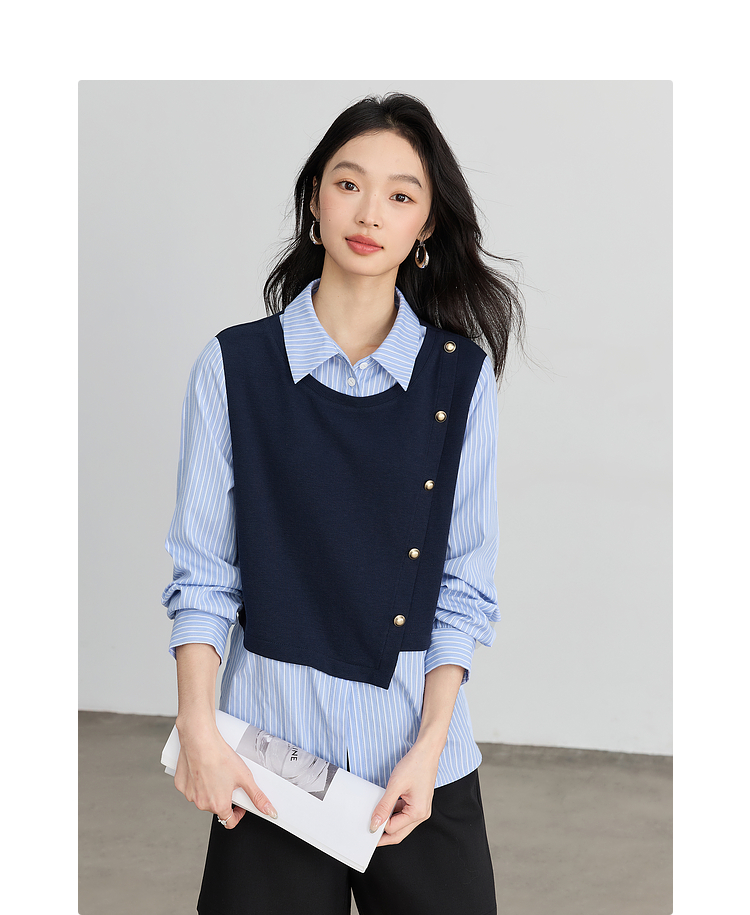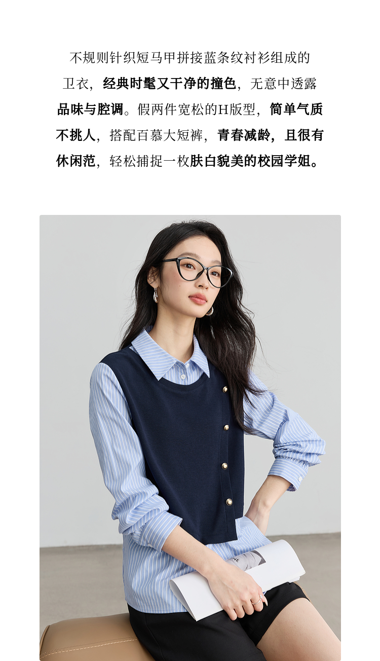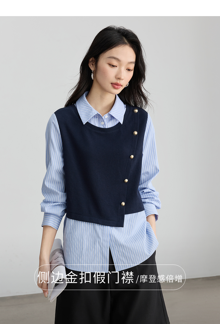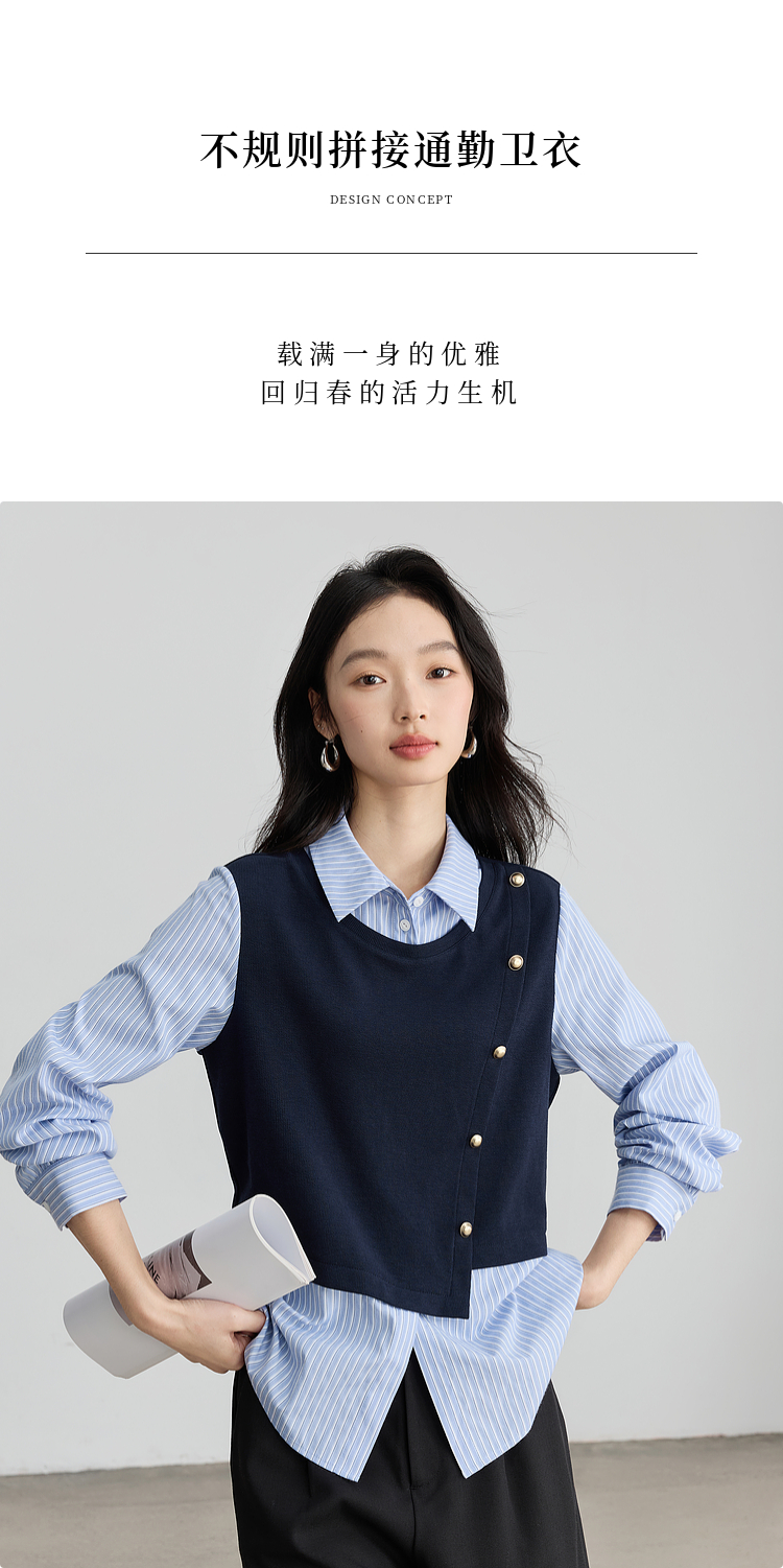 【1件75折】熙世界不规则条纹衬衫领假两件卫衣女设计感别致上衣2025春秋新款