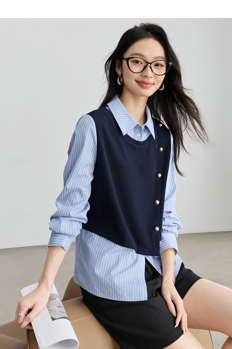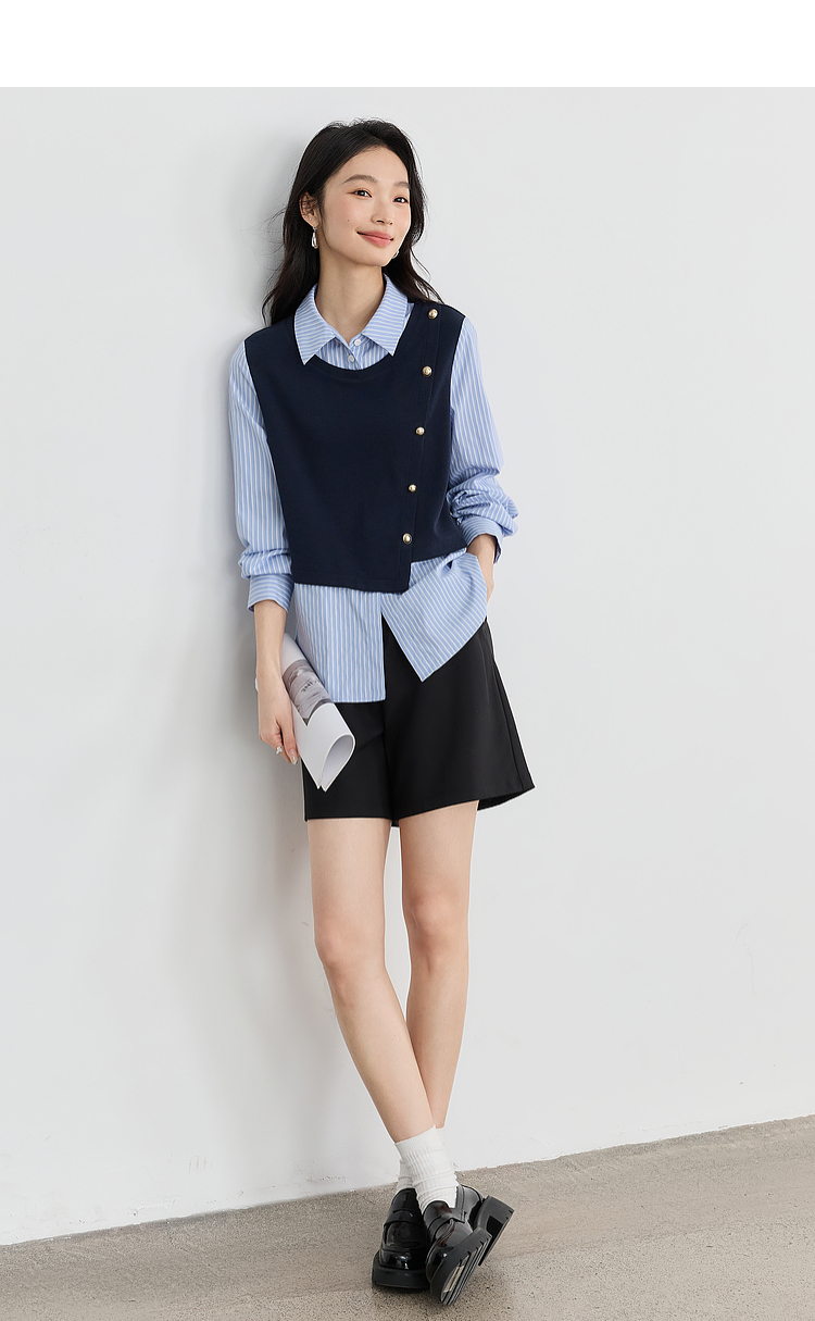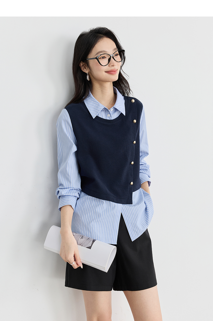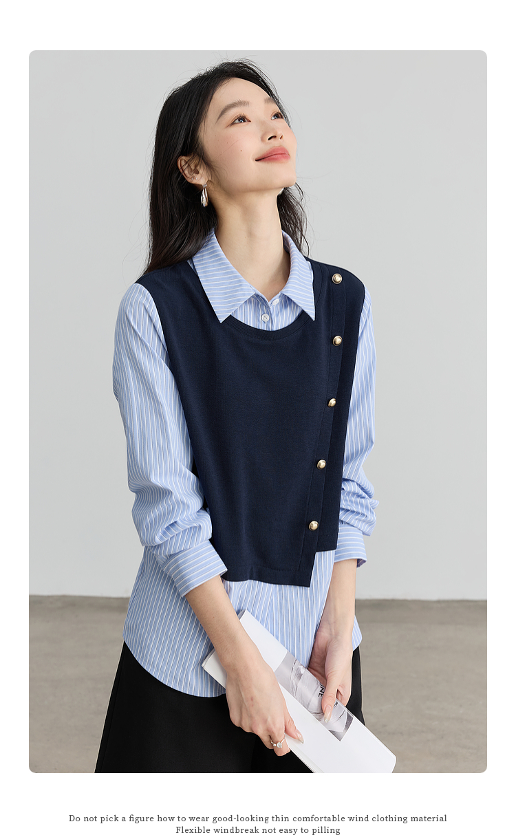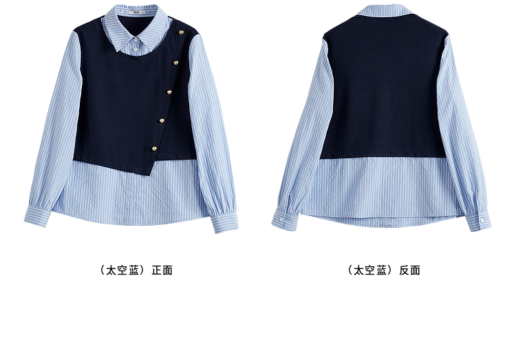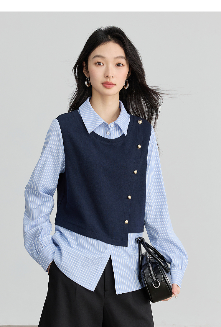 【1件75折】熙世界不规则条纹衬衫领假两件卫衣女设计感别致上衣2025春秋新款