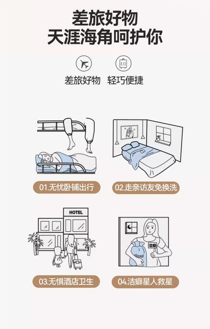 睡在里面,无论是脸、脖子、胳膊等各种部位都不用接触酒店的被子。