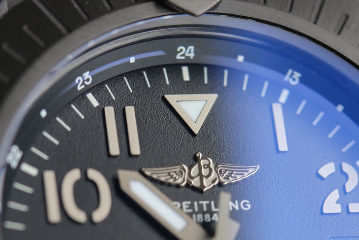 百年灵复仇者黑鸟V4版本采用了简洁的大三针设计,醒目的大时标和指针都覆盖了夜光涂层,在秒针上是红色的菱形,在日历显示窗口上则是红色的边框,以确保最佳的可读性和清晰度。