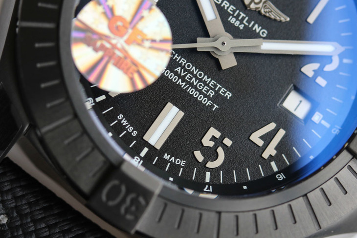 单向旋转表圈配合表圈指示器,操作更方便,保证了飞行和潜水时间的精确。与此同时,外圈刻字的底纹处理更精细,这也是值得一提的。外圈夜光点所镶嵌蓝宝石玻璃与原装一致带“鱼眼”效果(侧看),制作难度极高,这也是作为鉴定是否GF出品的重要依据!