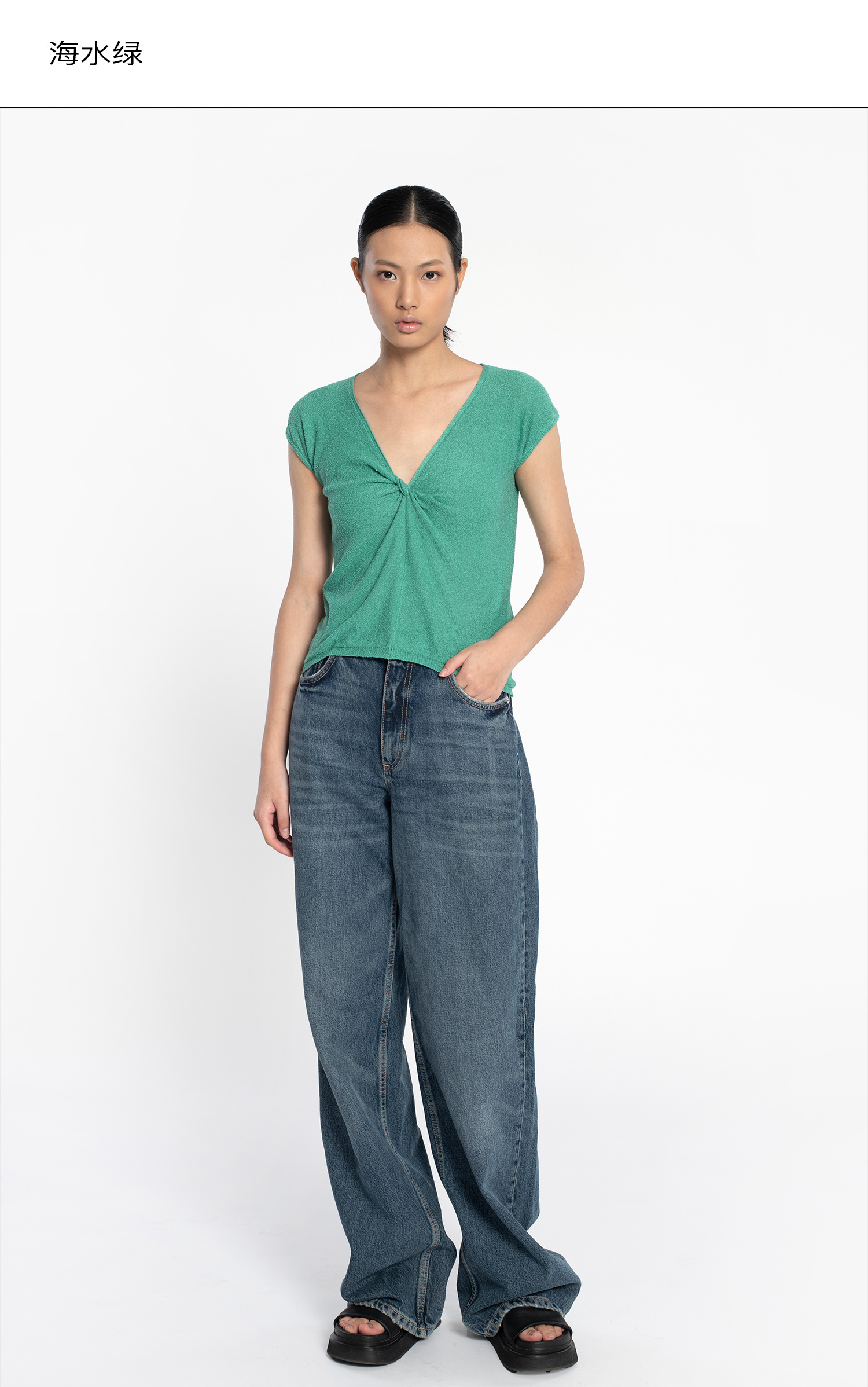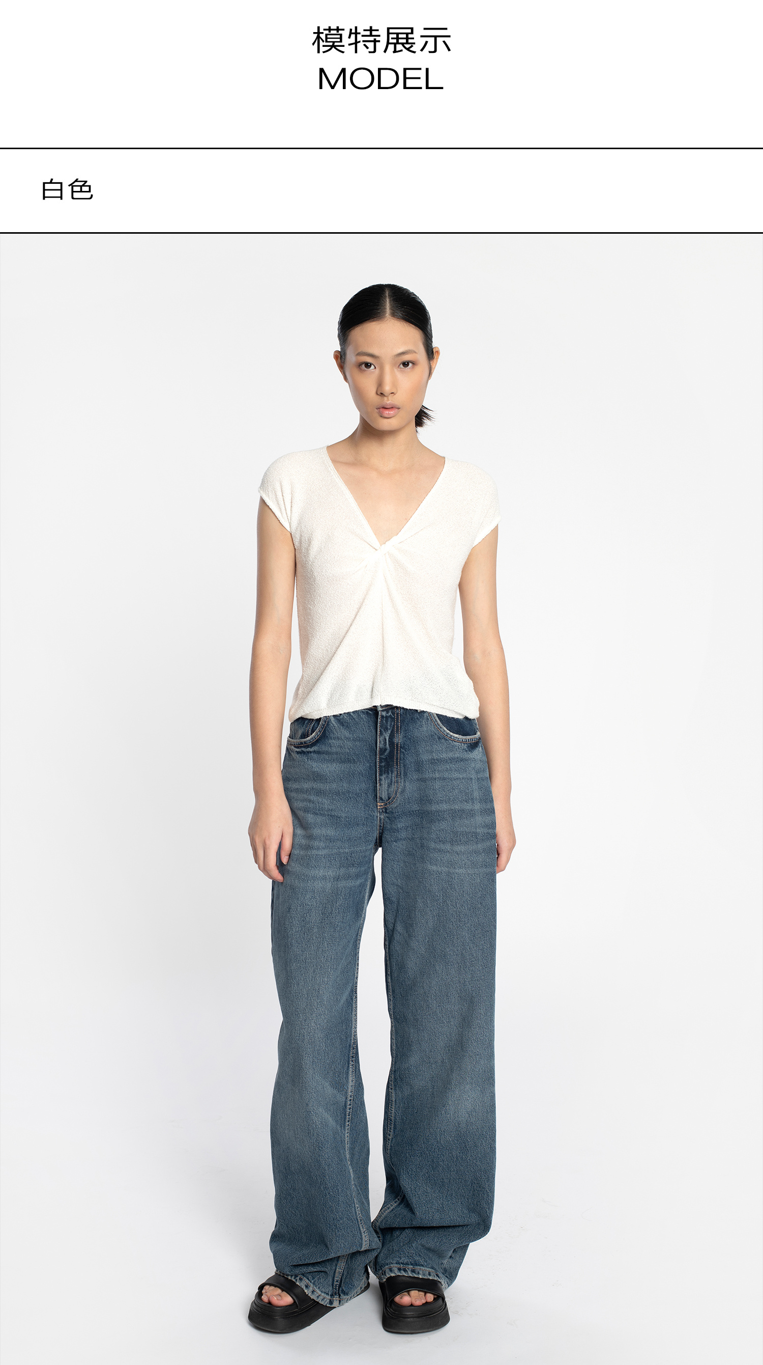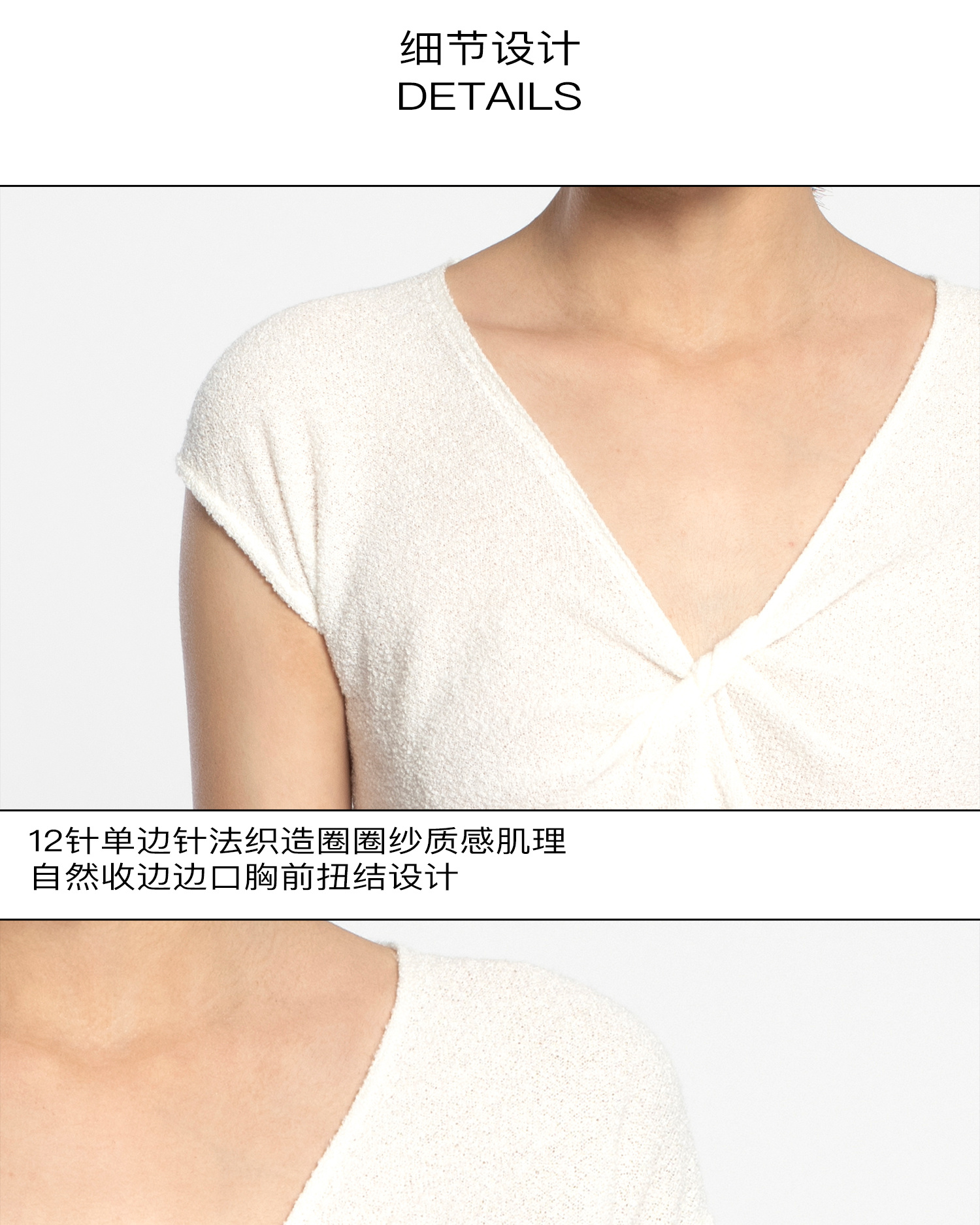 女士2022年12针单边针法绢丝混纺特种纱扭结针织T恤