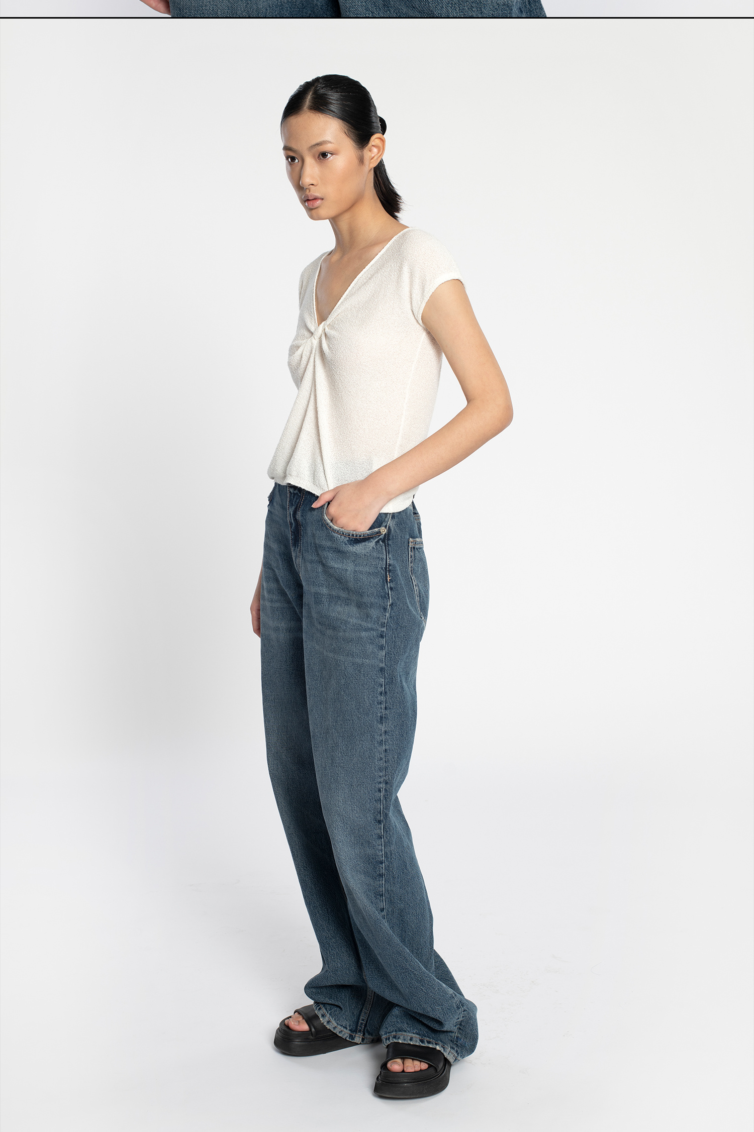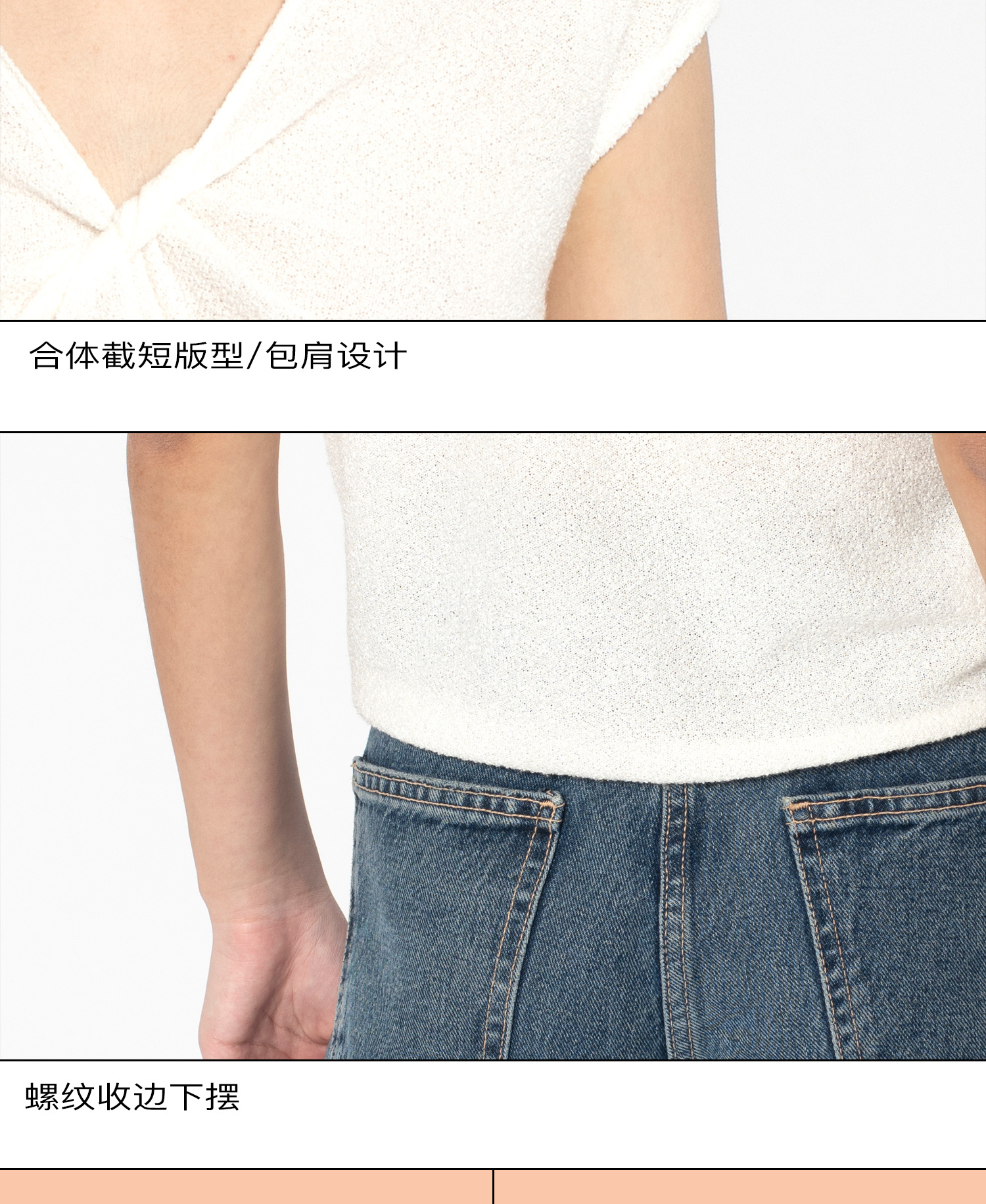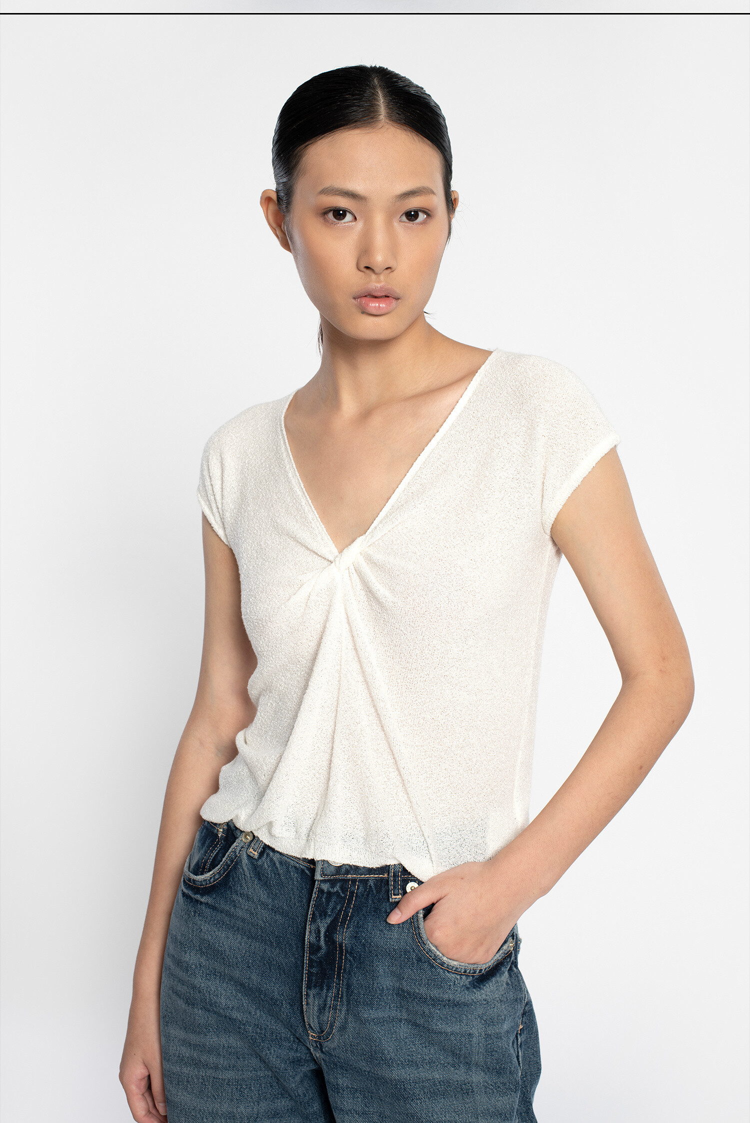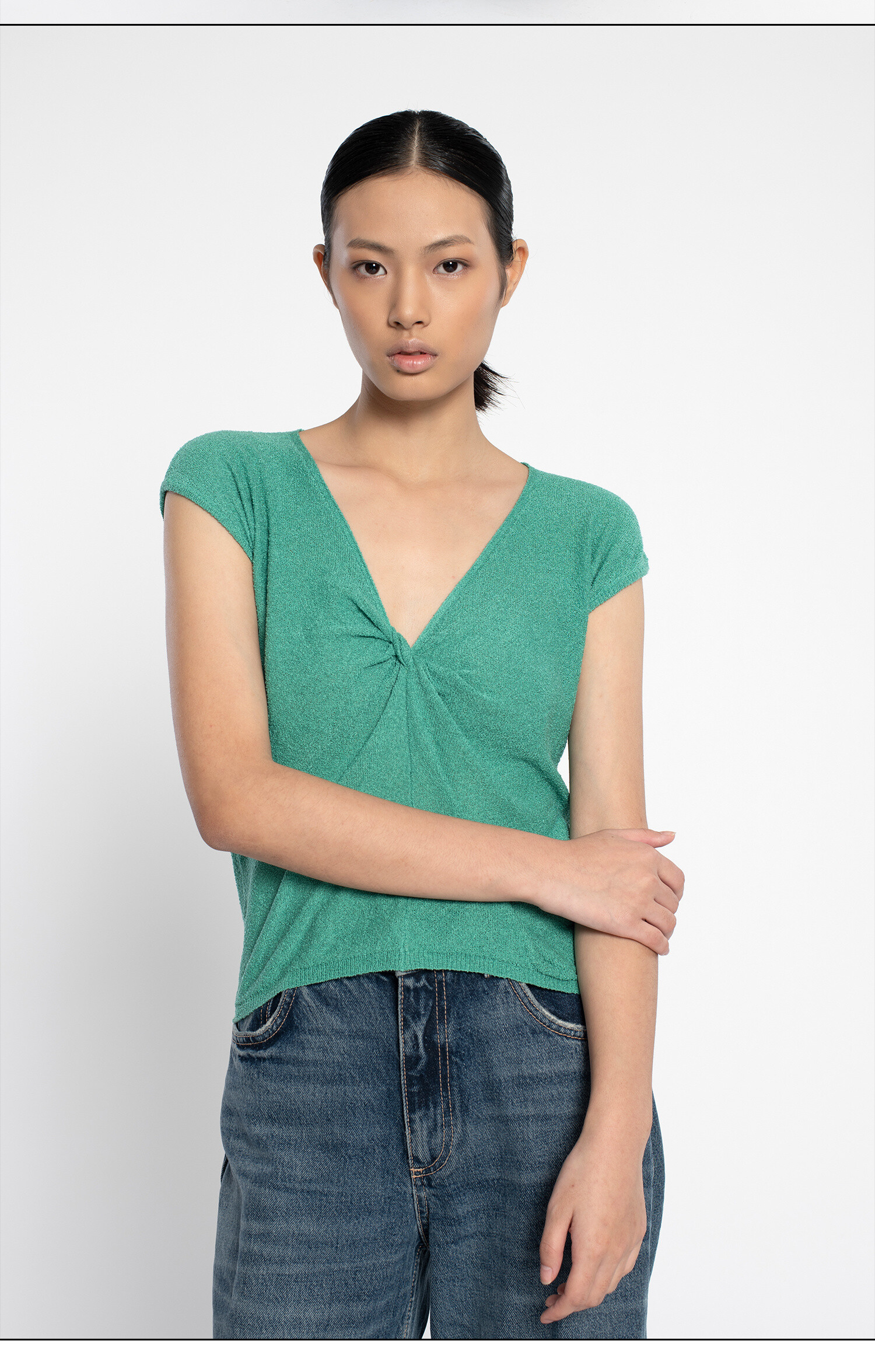 女士2022年12针单边针法绢丝混纺特种纱扭结针织T恤