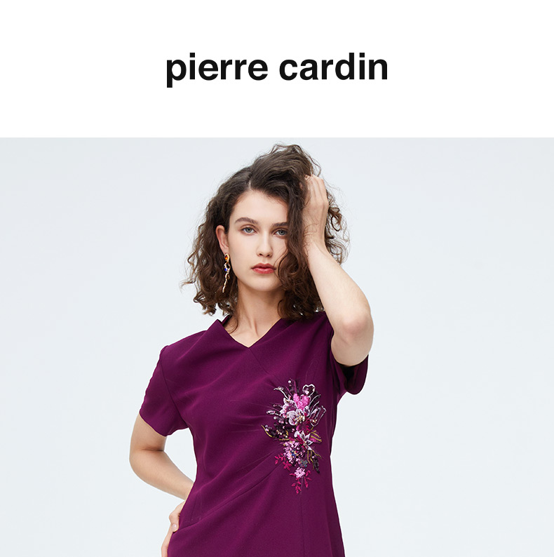 皮尔卡丹女装夏玫红色网纱袖V领短袖连衣裙A字裙P0200DS48D3