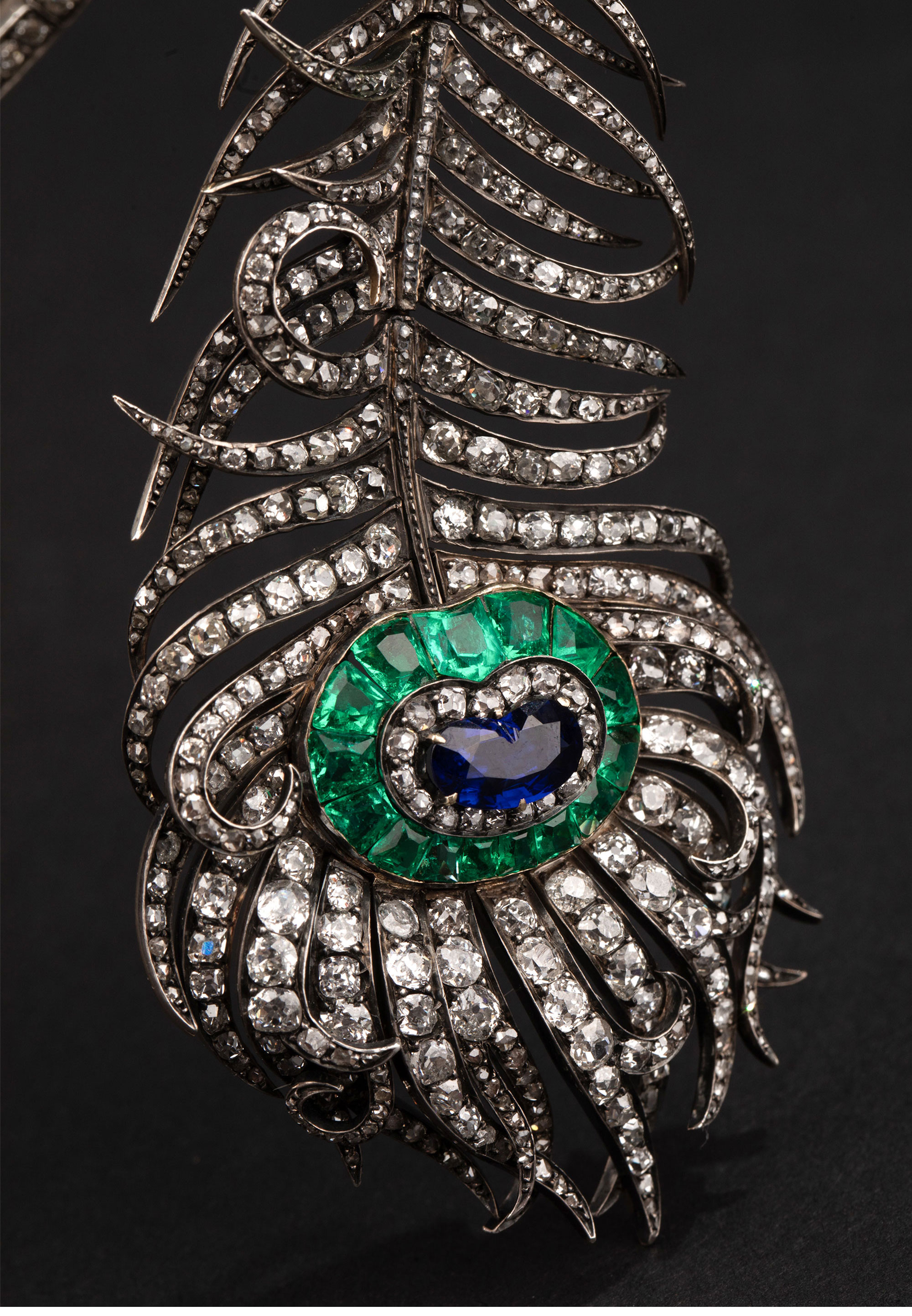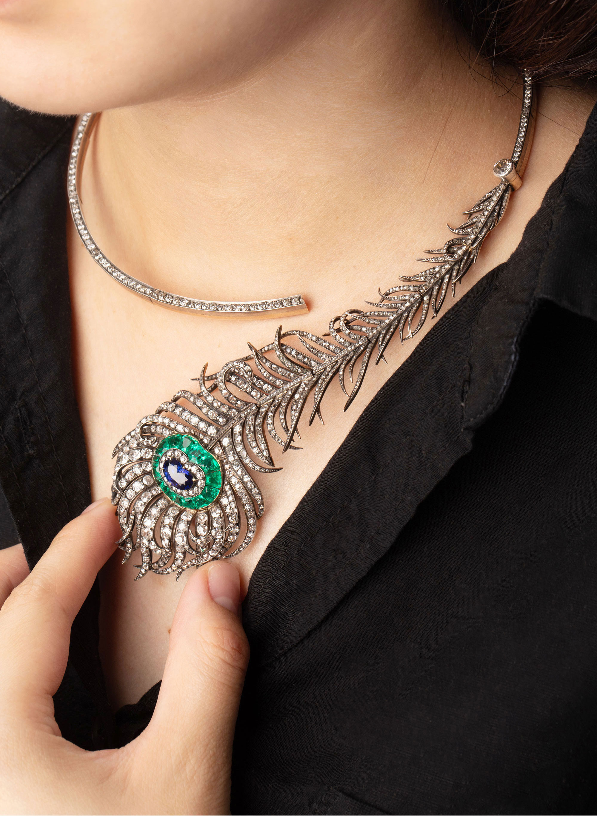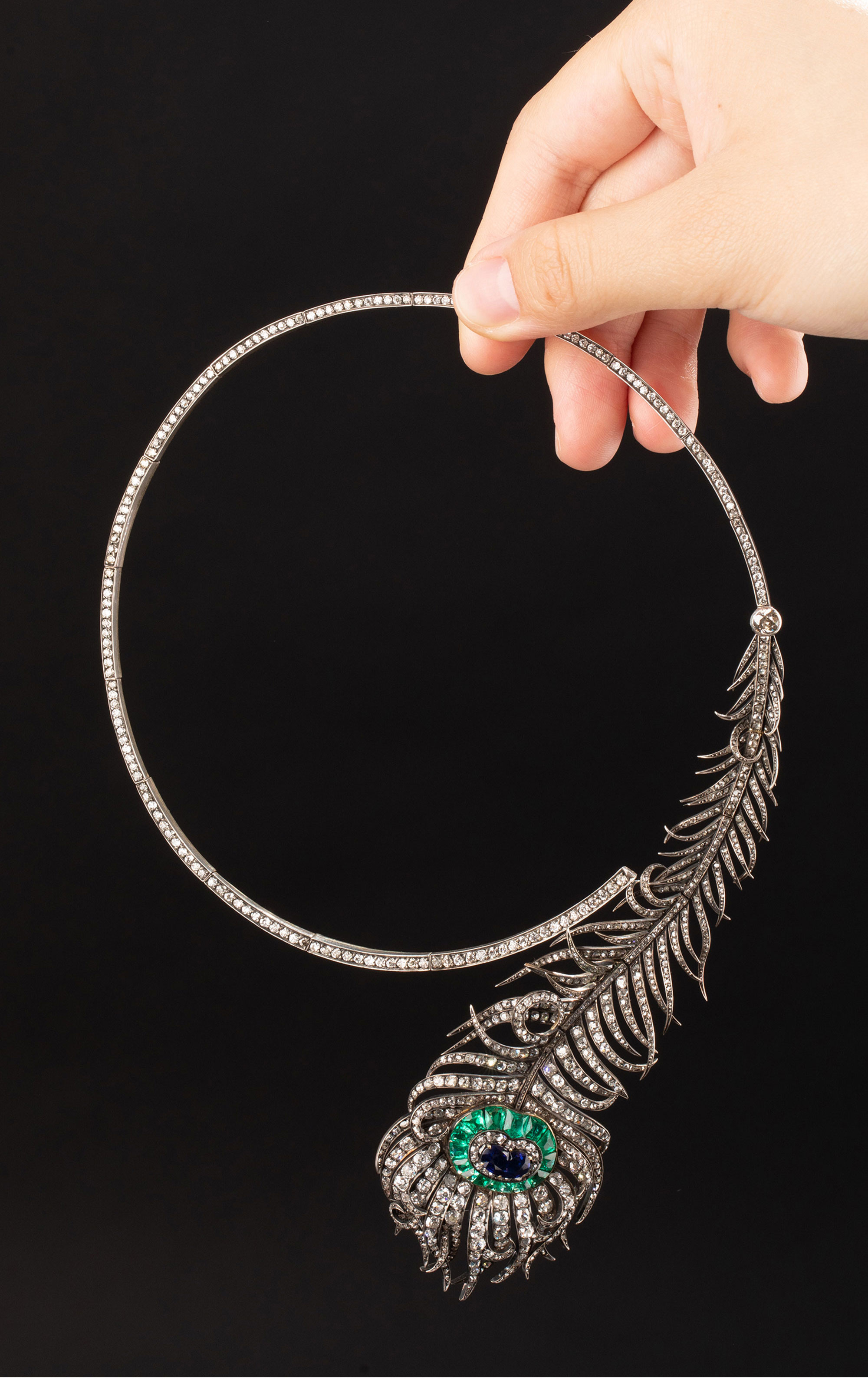 独角鹿西洋古董 1883法国设计出品俄罗斯大公定制款金银叠打镶嵌蓝宝石祖母绿及钻石「孔雀羽毛」项链