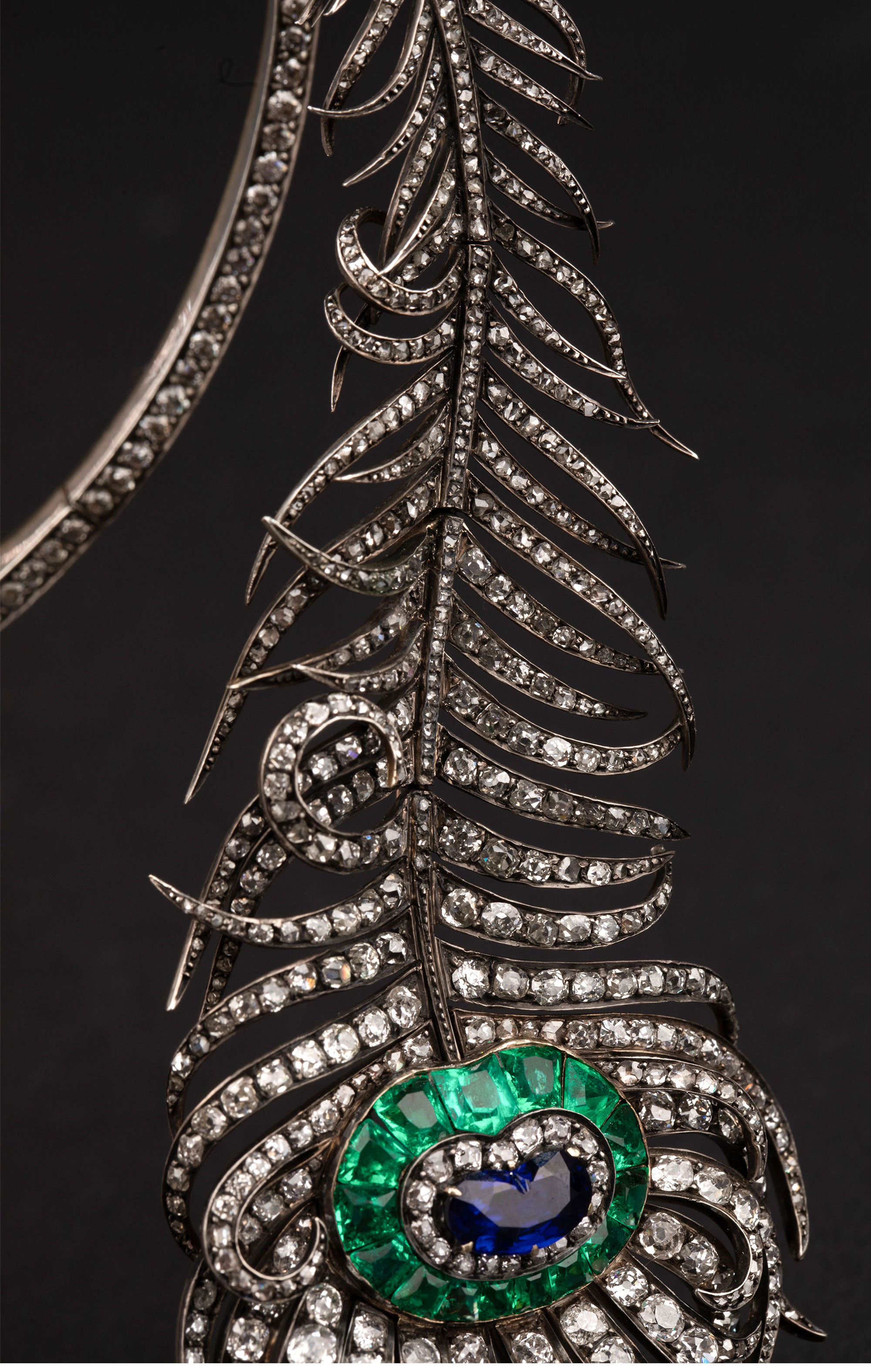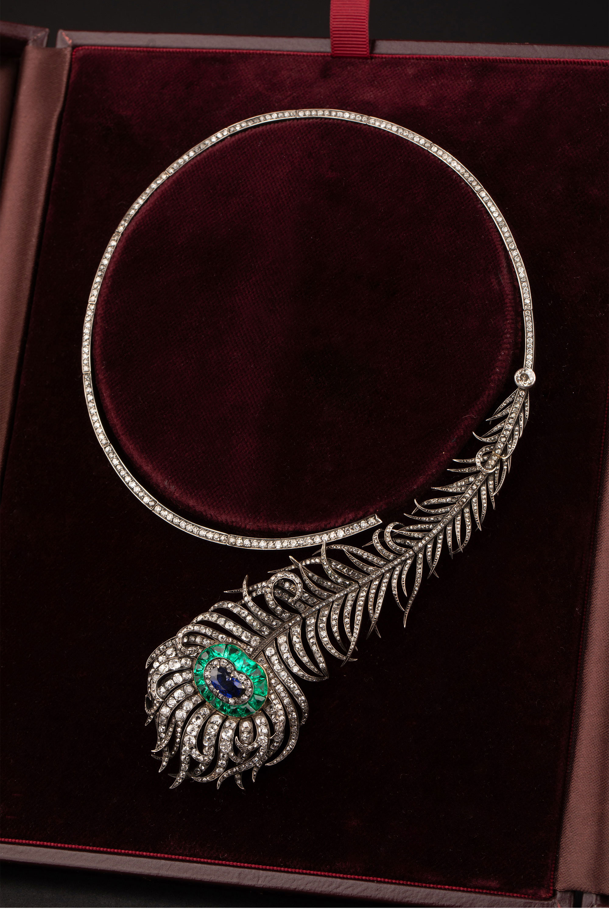 1883年法国设计出品俄罗斯大公定制款金银叠打镶嵌蓝宝石祖母绿及钻石「孔雀羽毛」项链