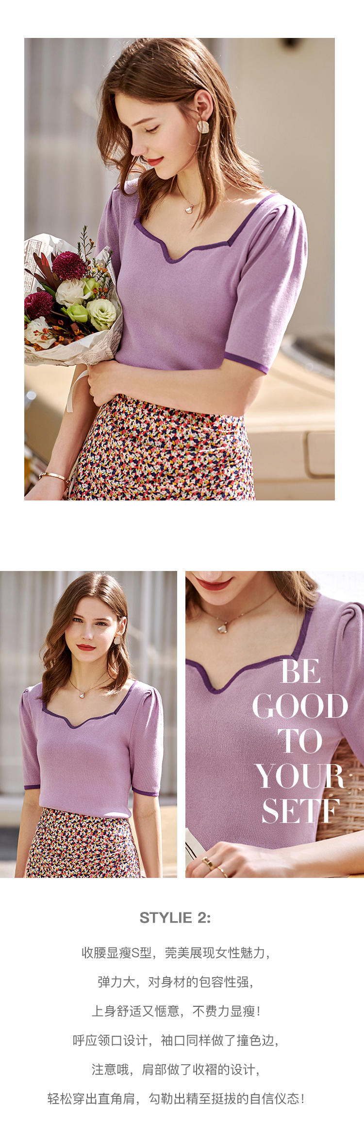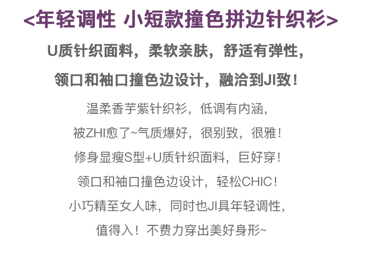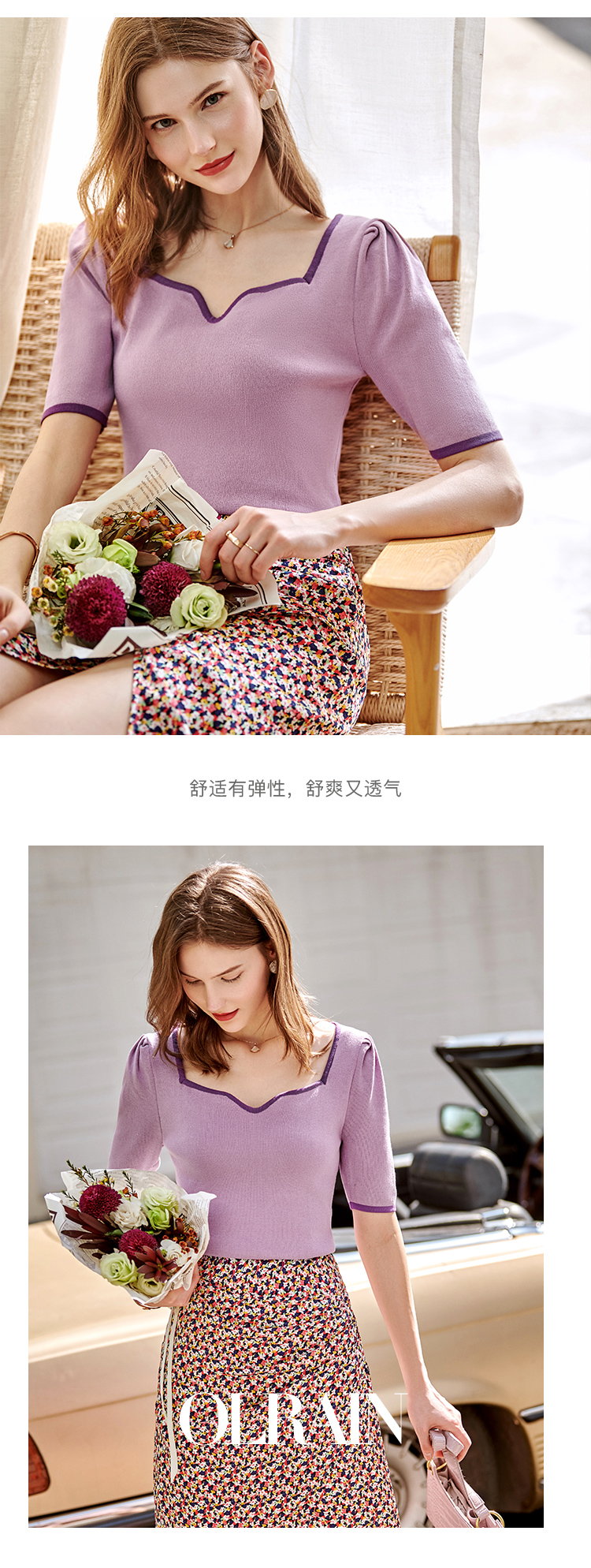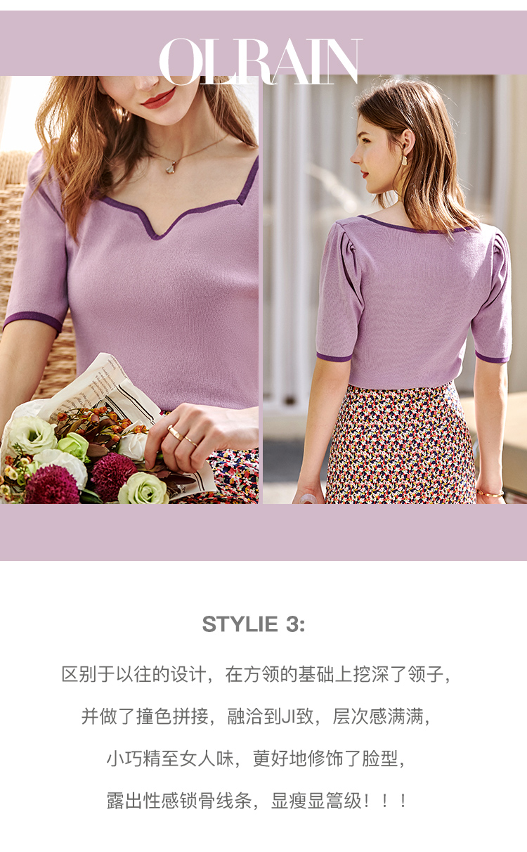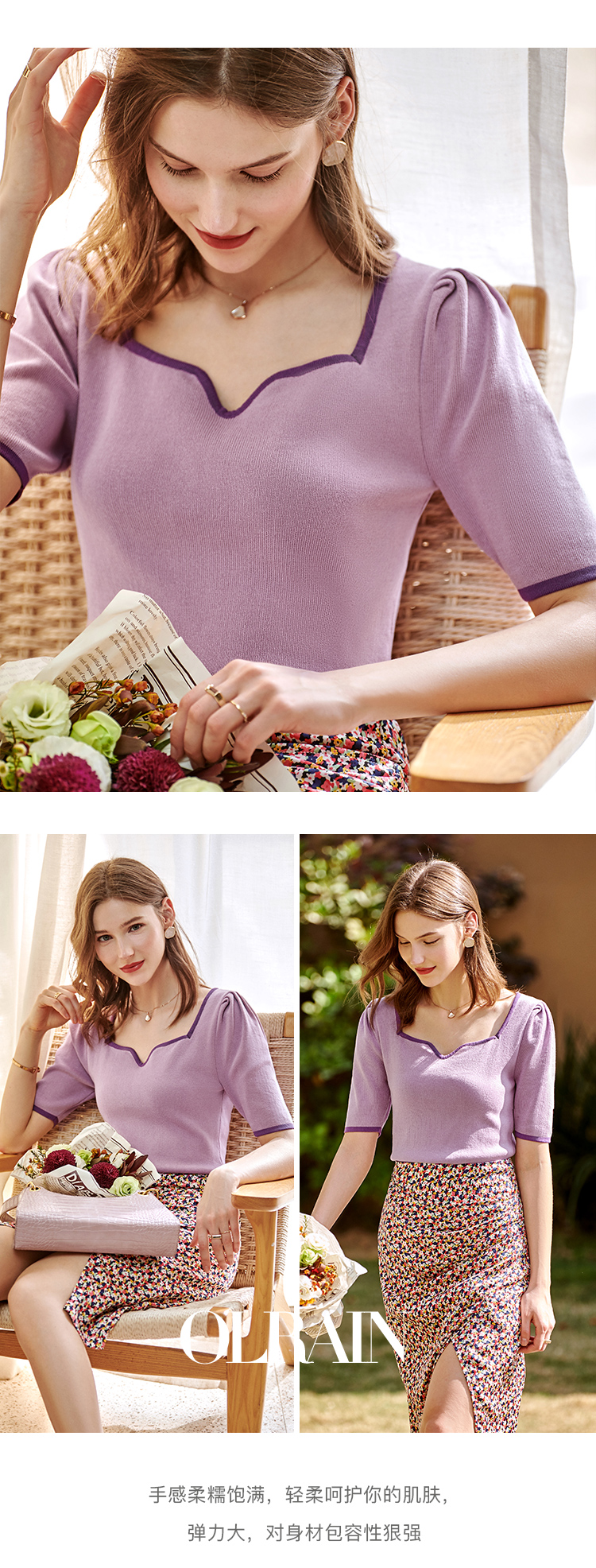 欧芮儿紫色针织衫薄款女夏2021新修身显瘦撞色拼边短款套头衫上衣