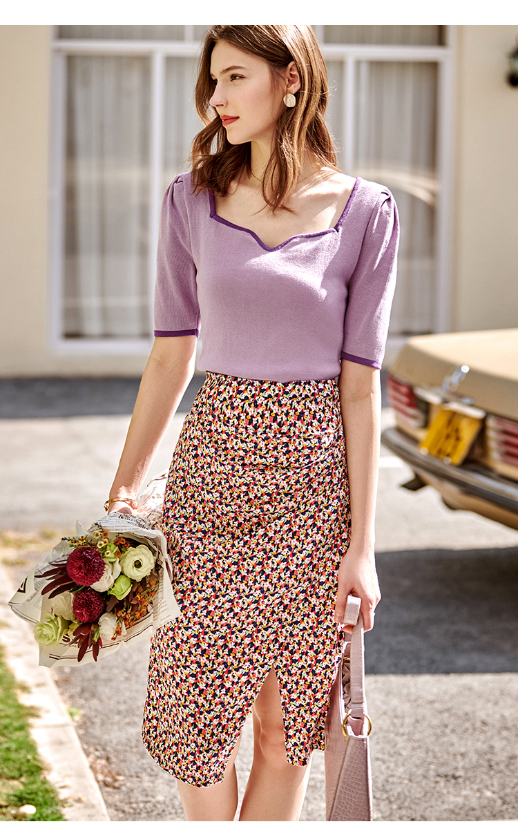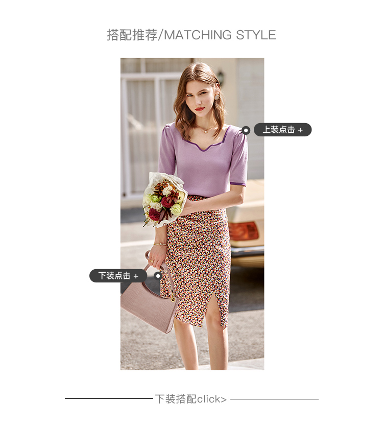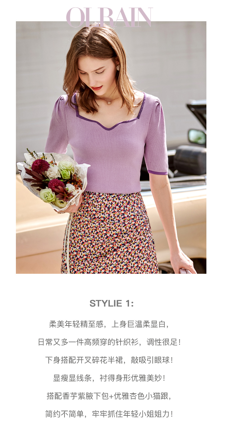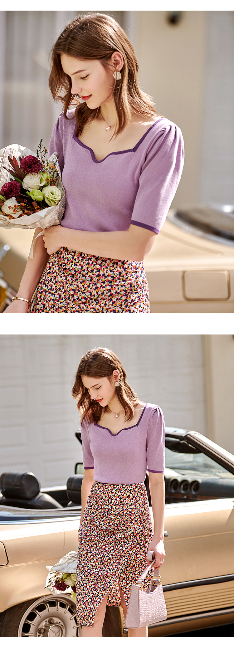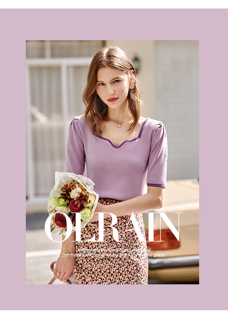 欧芮儿紫色针织衫薄款女夏2021新修身显瘦撞色拼边短款套头衫上衣