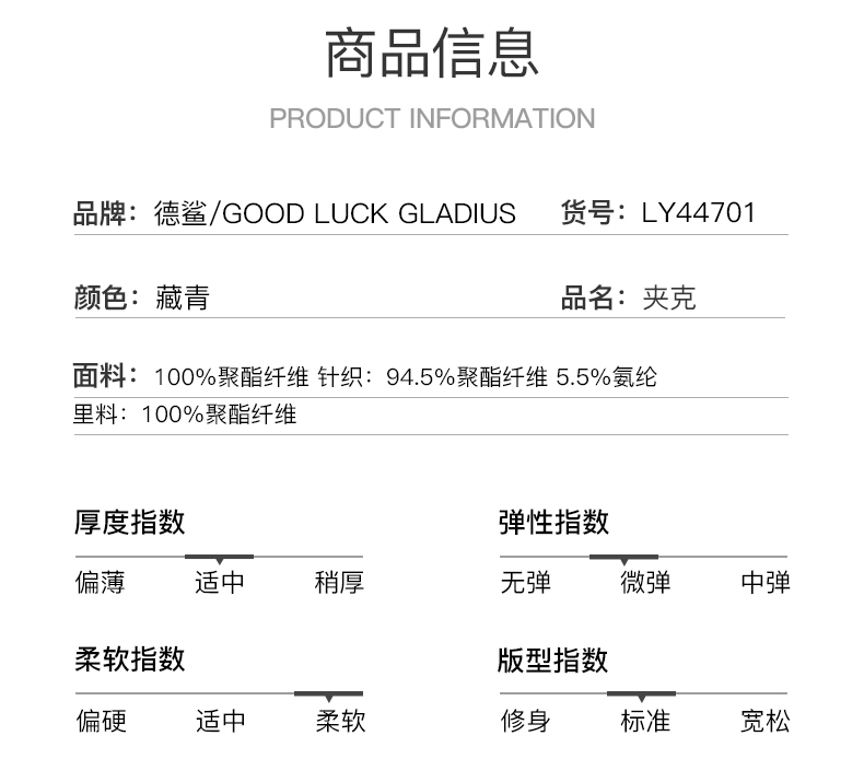 GOOD LUCK GLADIUS品牌由“浙江德鲨服饰有限公司”引进中国市场,经过多年发展,凭借完善的终端形象,规范化的销售管理,迅速赢得消费者的认可,引领国内消费流行,是成功人士首选男装品牌。