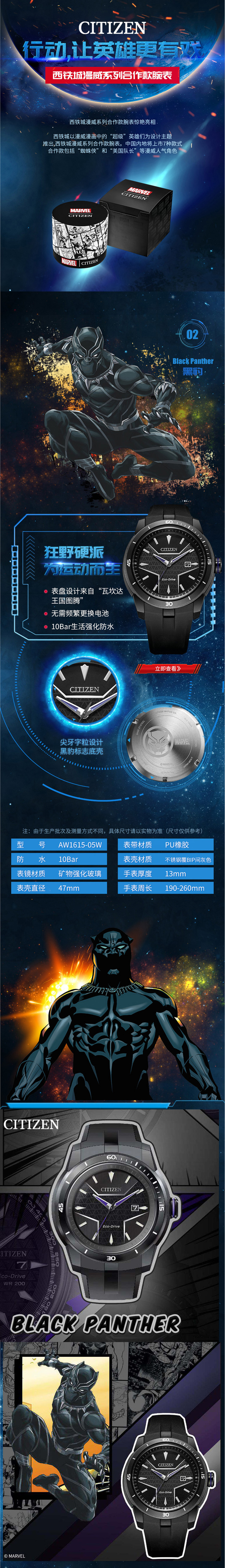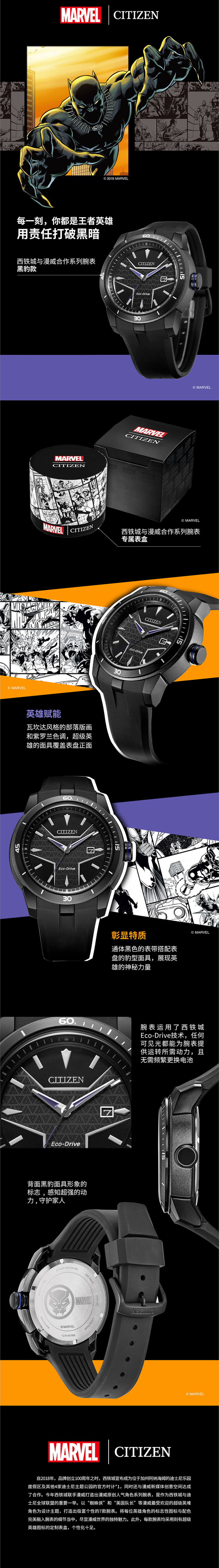 漫威正式7合1西铁城日本官方光动能漫威款男表AW1615-05W黑豹