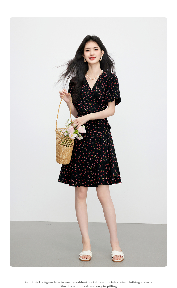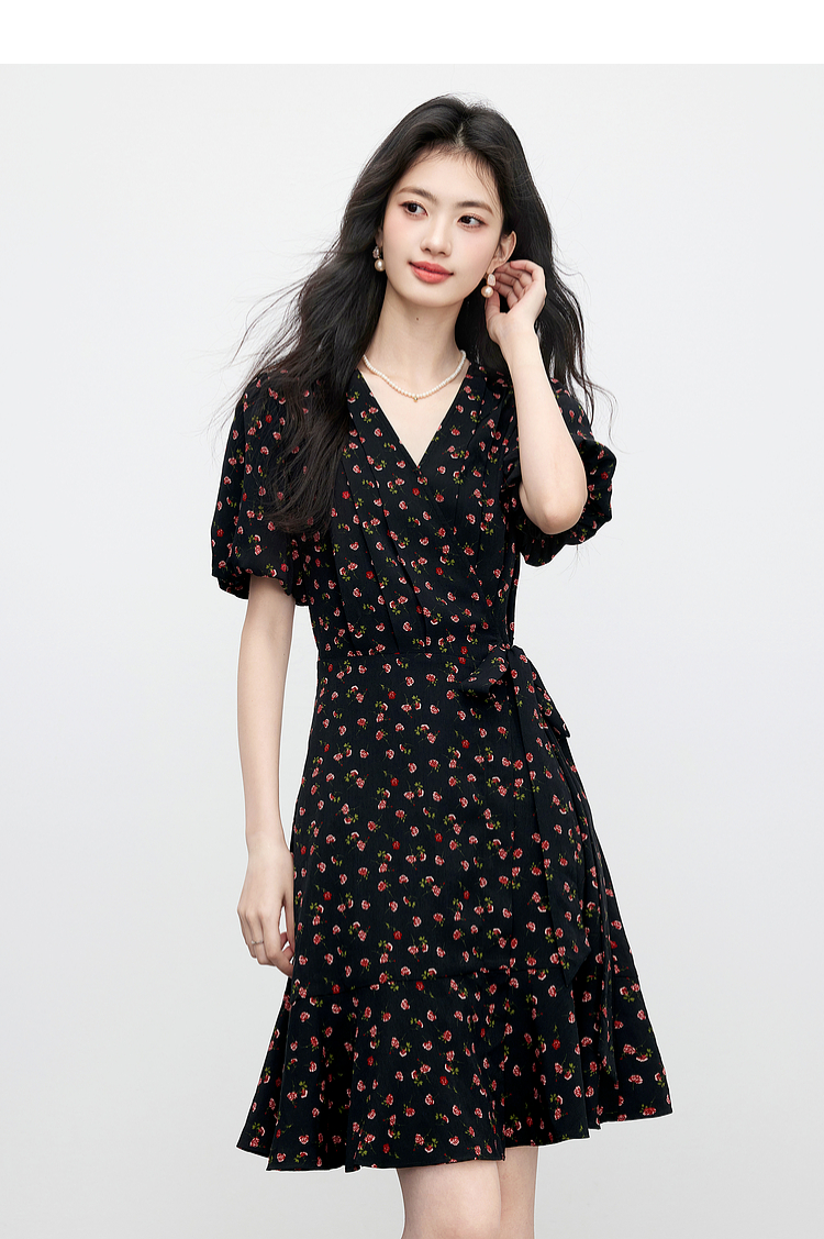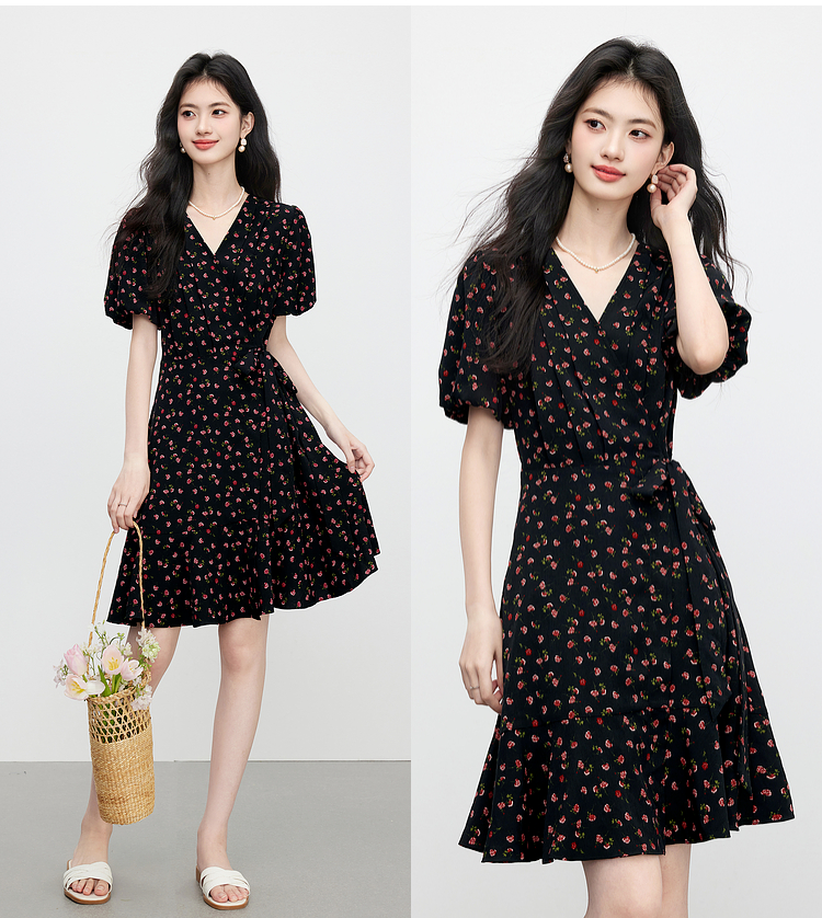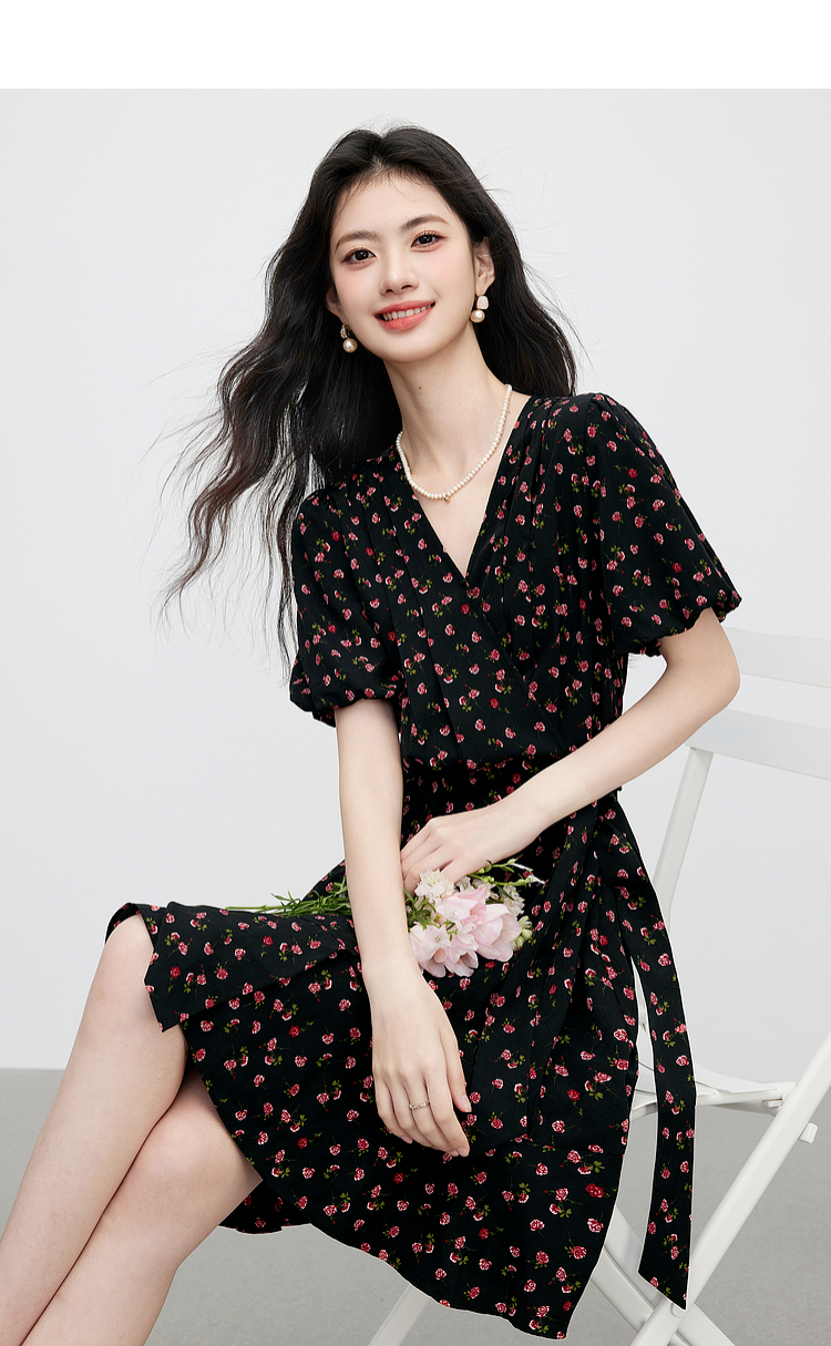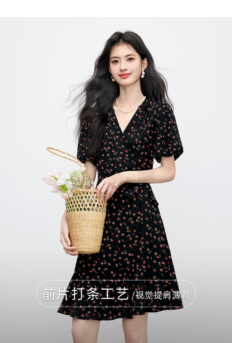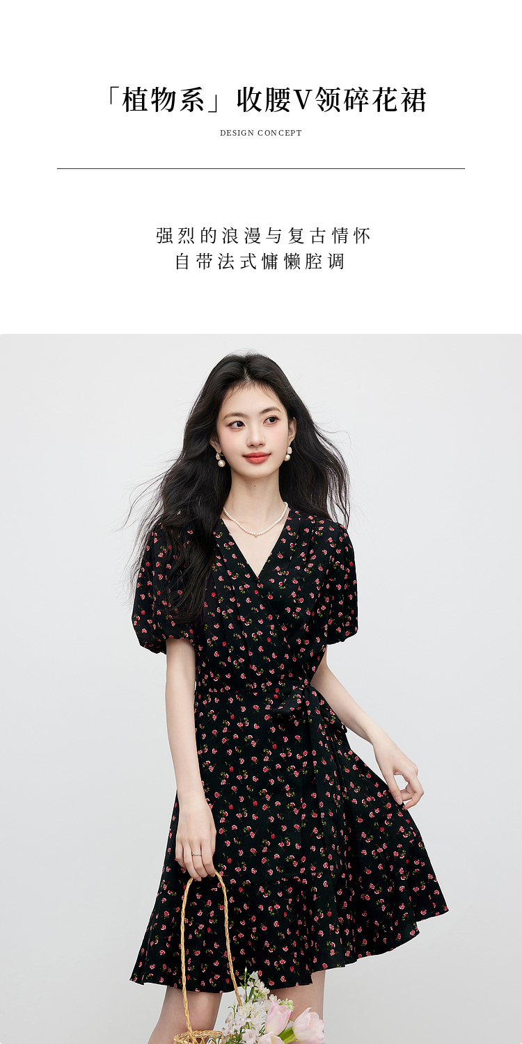 【07/16新品】熙世界法式碎花V领连衣裙女夏新款小个子围裹式系带收腰茶歇裙子