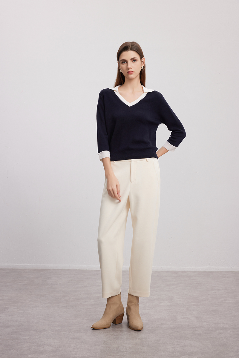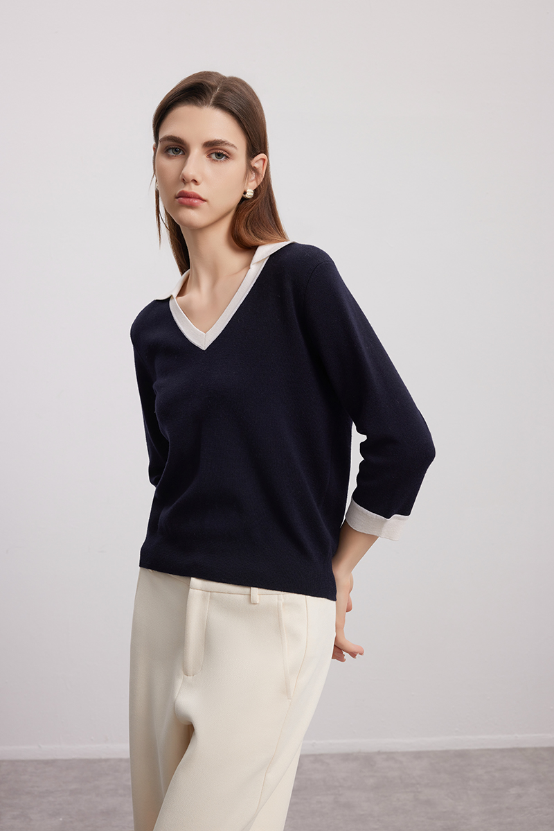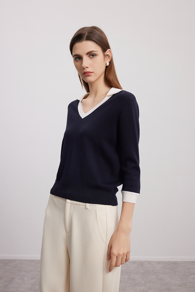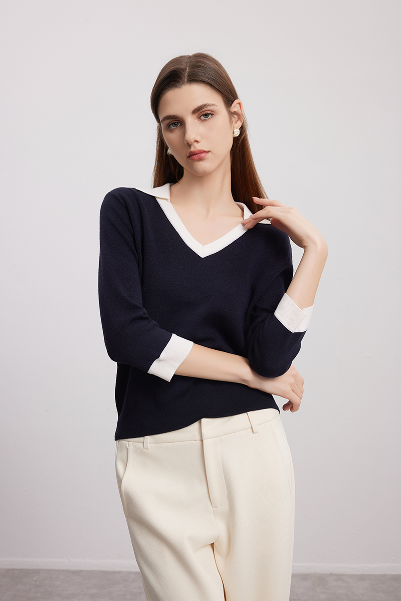 【七分袖V领针织衫】24年秋冬女士新品100%绵羊毛黑白撞色针织套衫