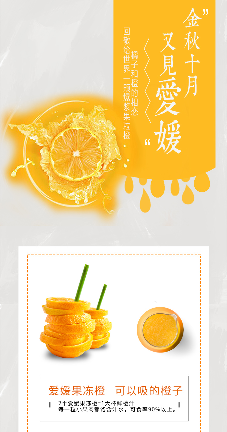 爱媛果冻橙,它似橙非橙、又似橘非橘口感与味道甩一般橙子几条街。普通橙子在吃的时候,总有一丝丝纤维让人觉得有那么一点遗憾。而但爱媛38号,是被称为“果冻橙” 的橘橙果肉无纤维感,细嫩化渣爆汁,分量十足果肉嫩滑,每一颗果粒汁水都饱满充盈出汁,当你从中间切开,仿佛可以直接拿吸管来吸食。