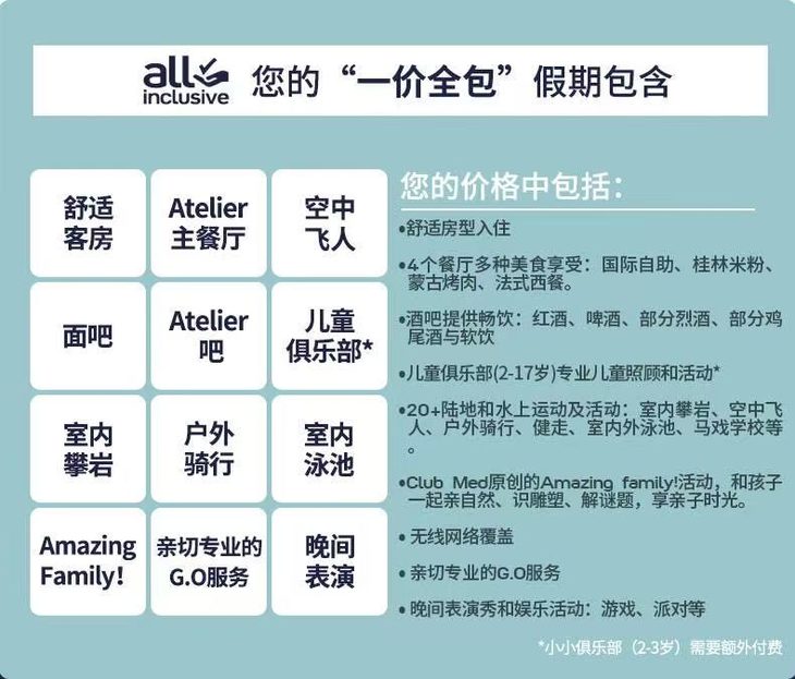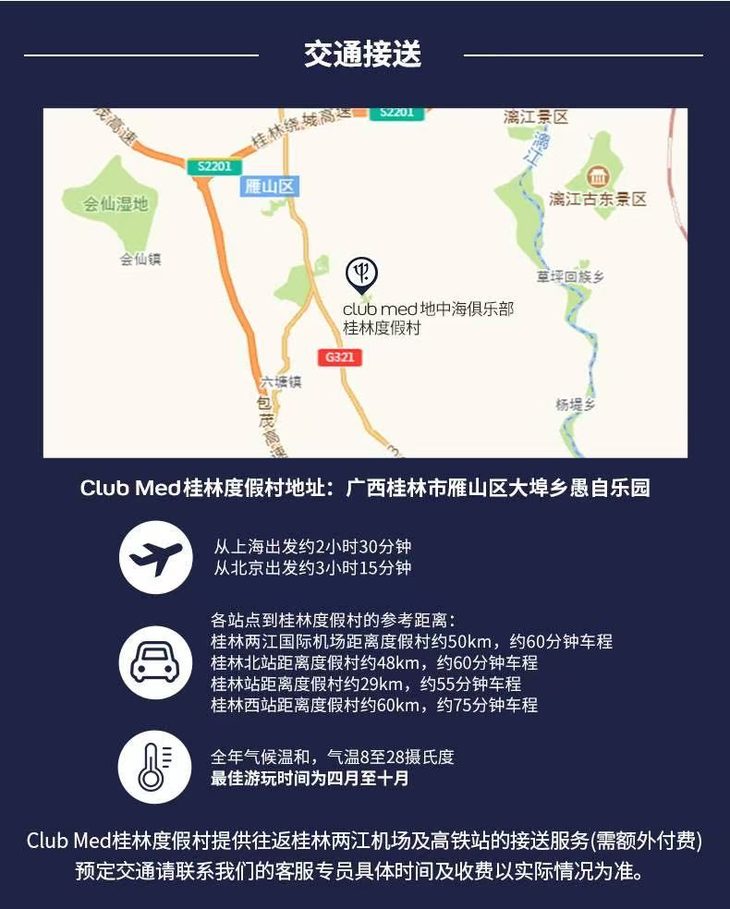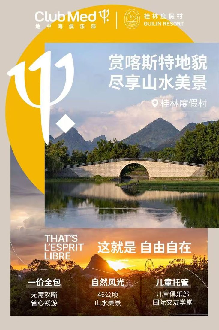2~3晚【桂林ClubMed度假村】一价全包!每日三餐、酒水畅饮,丰富的娱乐活动,攀岩、山地骑行、自然徒步等,享受桂林独特的自然风光~