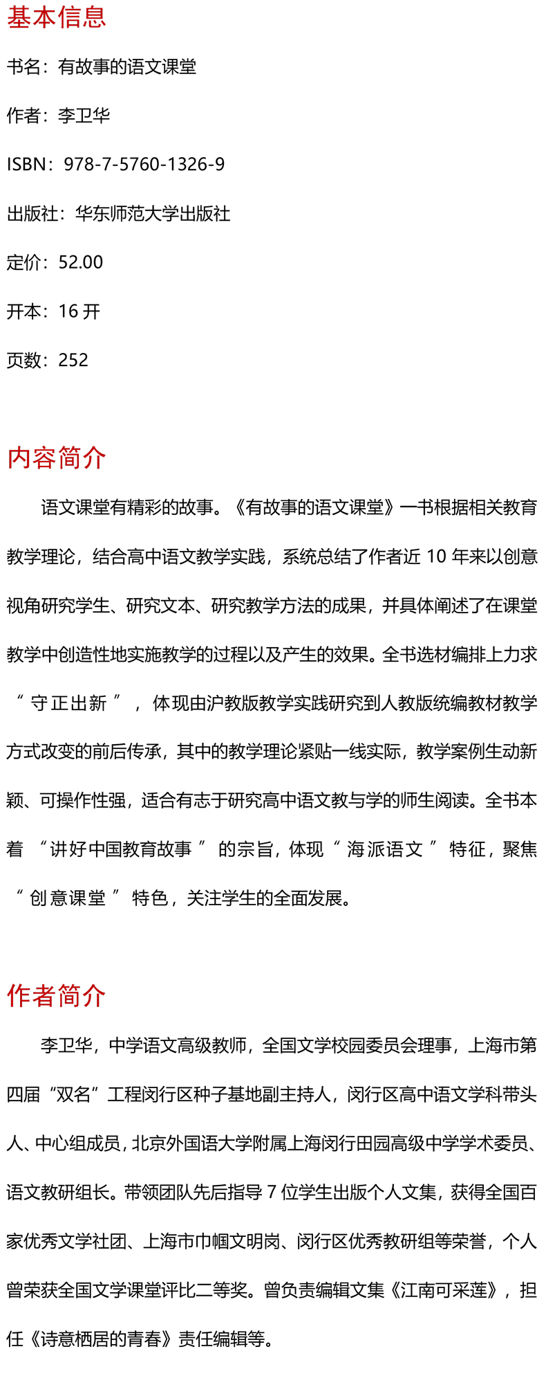 语文课堂有精彩的故事。《有故事的语文课堂》一书根据相关教育教学理论,结合高中语文教学实践,系统总结了作者近10年来以创意视角研究学生、研究文本、研究教学方法的成果,并具体阐述了在课堂教学中创造性地实施教学的过程以及产生的效果。全书选材编排上力求“守正出新”,体现由沪教版教学实践研究到人教版统编教材教学方式改变的前后传承,其中的教学理论紧贴一线实际,教学案例生动新颖、可操作性强,适合有志于研究高中语文教与学的师生阅读。全书本着“讲好中国教育故事”的宗旨,体现“海派语文”特征,聚焦“创意课堂”特色,关注学生的全面发展。
