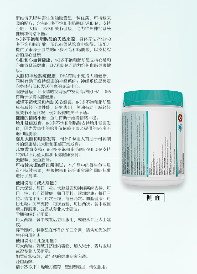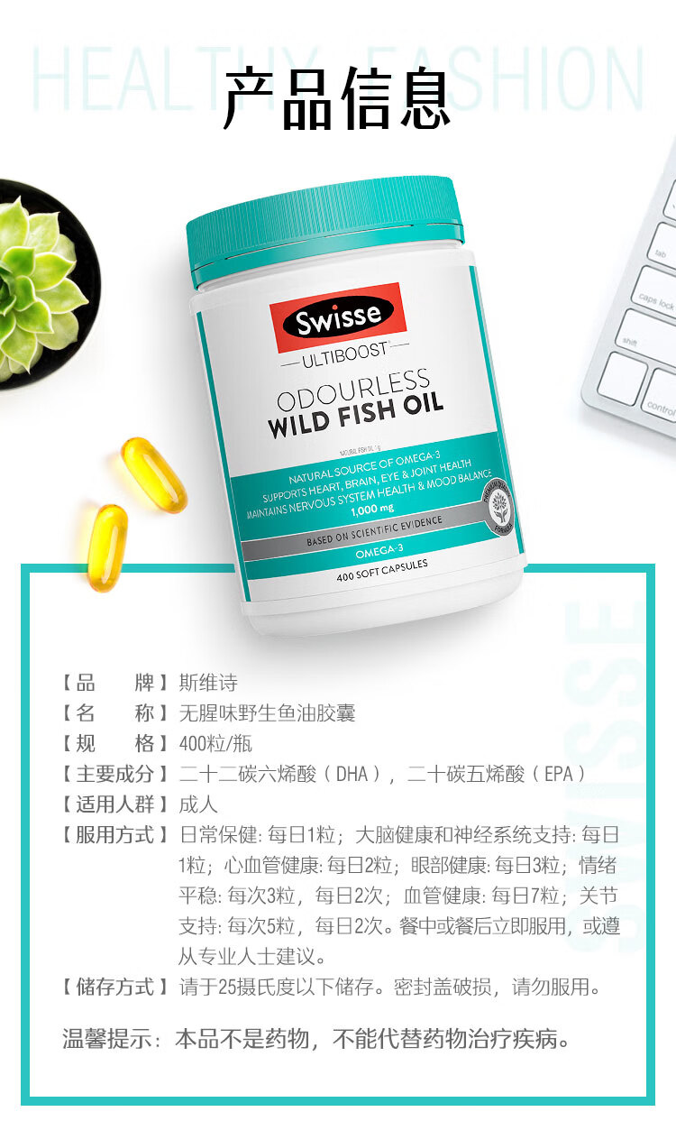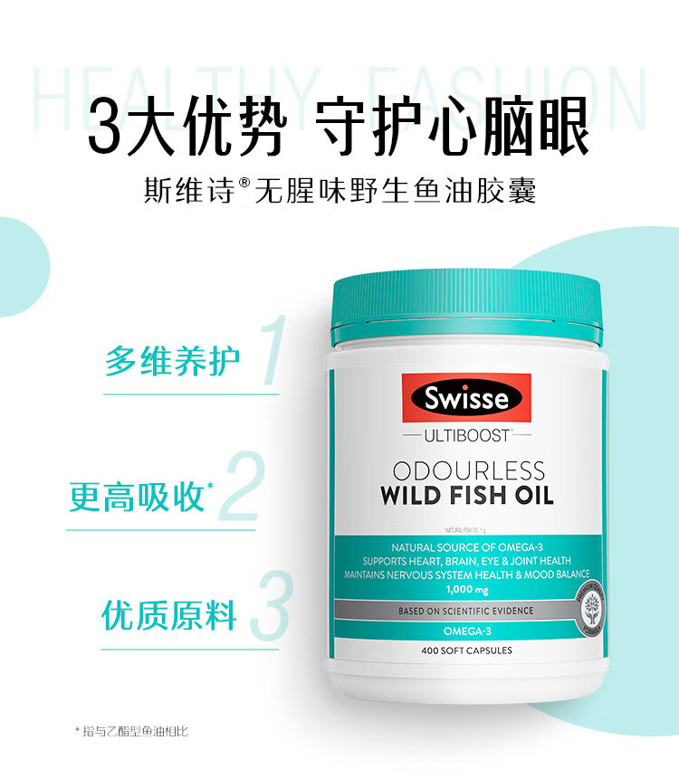 Swisse斯维诗 无腥味野生鱼油软胶囊1000mg omega-3 DHA+EPA 400粒/ 瓶