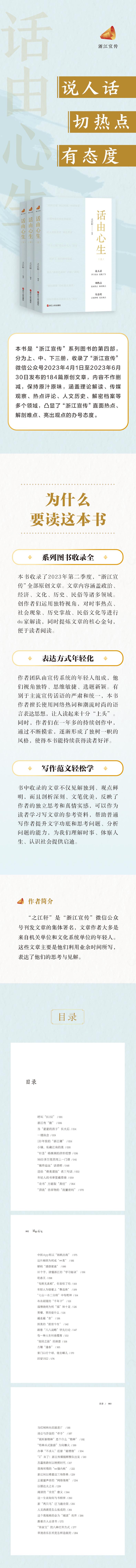 系列图书收录全。本书收录了2023年第二季度,“浙江宣传”全部原创文章。文章内容涵盖政治、经济、文化、历史、民俗等诸多领域。创作者们运用独特视角,对时事热点、社会现象、历史掌故、民俗文化等进行独家解读,同时提炼文章的核心金句,便于读者阅读。 表达方式年轻化。作者团队由宣传系统的年轻人组成,他们视角独特、思维敏捷、选题新颖。有别于主流宣传话语的严肃和统一,本书作者擅长使用网络热词和潮流时尚的语言表达思想,让人读起来十分“上头”。同时,作者们在一年多的持续创作中,通过不断摸索,逐渐形成了独树一帜的风格,使得本书能持续获得读者好评。 写作范文轻松学。书中收录的文章不仅见解独到、观点鲜明,而且剖析深刻、文笔优美,反映了作者的独立思考和真情实感,可以作为读者学习写文章的参考资料,帮助普通写作者提升文字功底和思考问题、分析问题的能力,为我们理解时事、体察人生、认识社会提供启迪。