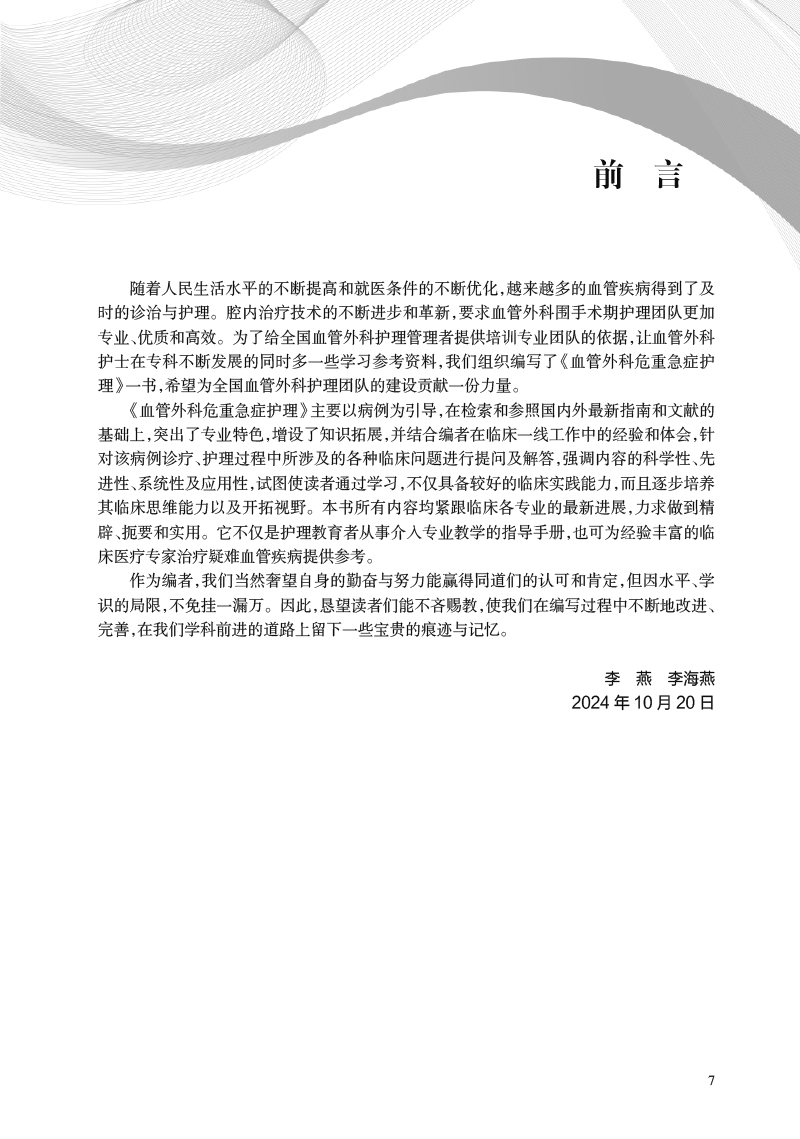 由于血管外科很多患者基础疾病较多,患者病情重、病情变化快,为了保障临床安全,较多医院血管外科病区都设立了重症监护病房。相对应的,科室对血管外科专科护理模式也不断改进优化,对专科护士的要求也逐渐提高。而针对血管外科危急重症疾病专科特色的《血管外科危重急症护理》完美符合了目前的临床需求,护理重点、难点突出,值得在临床推广,适合科室组织护士共同学习,扩宽视野,以"不变"的护理思路应"万变"的复杂病情。 该册书主要包括血管外科常见的各种危重急症和血管相关疾病的危重急症的相关知识,从疾病的定义、病因、临床表现到治疗和护理,完整的讲述疾病的知识,帮助读者掌握必备的知识。并结合目前的临床最新进展,丰富读者的视野,拓展读者知识面,达到事半功倍的效果。不断提高血管外科专科护士的临床实践能力和理论水平。