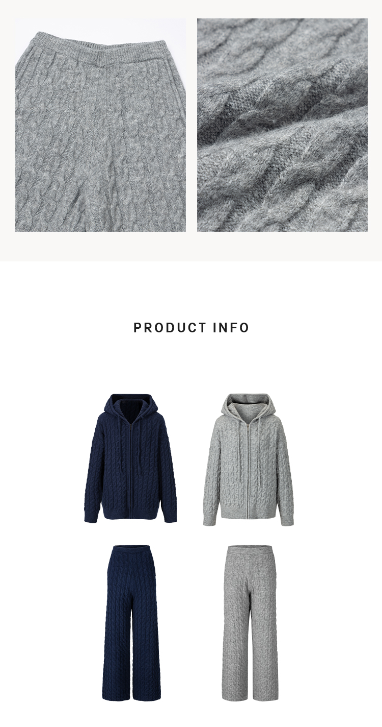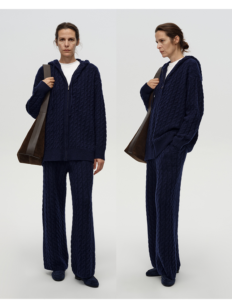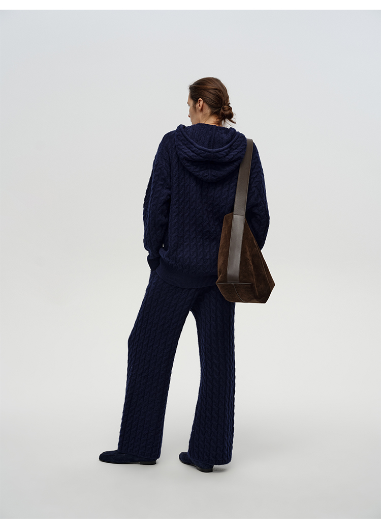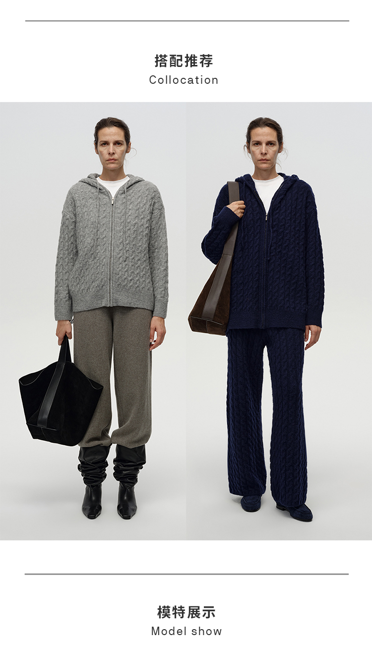 HIDEMI 【赵露思同款】进口澳洲美利奴羊毛绞花麻花花纱厚款宽松式连帽拉链毛衣外套长裤套装 藏蓝色/中灰色 帽衫\阔腿裤