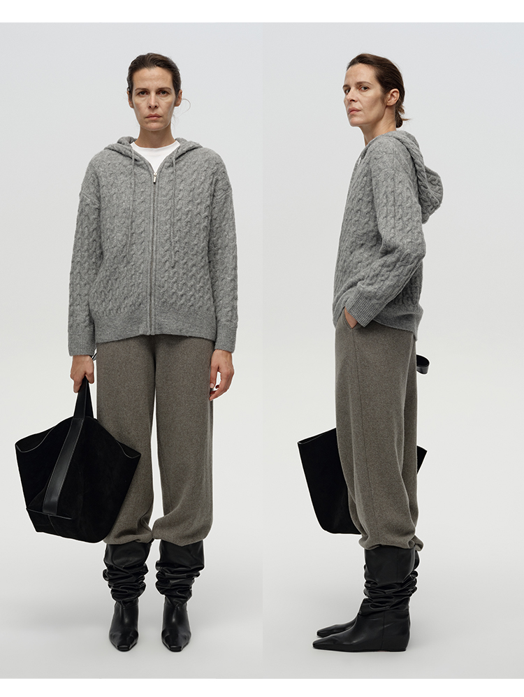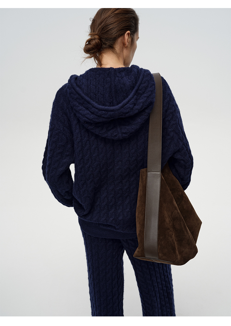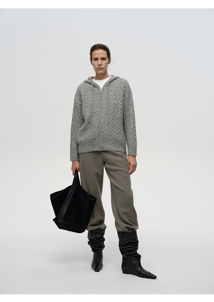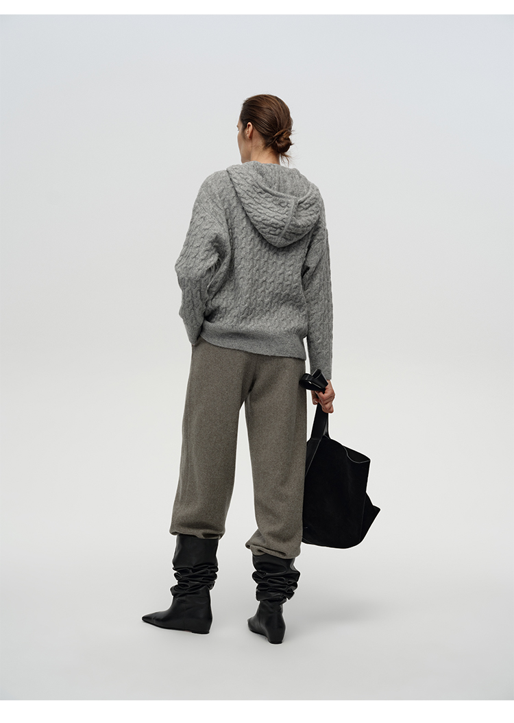 HIDEMI 【赵露思同款】进口澳洲美利奴羊毛绞花麻花花纱厚款宽松式连帽拉链毛衣外套长裤套装 藏蓝色/中灰色 帽衫\阔腿裤