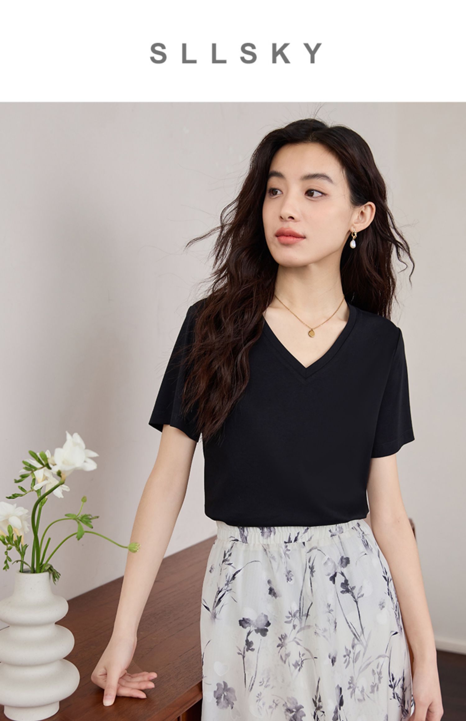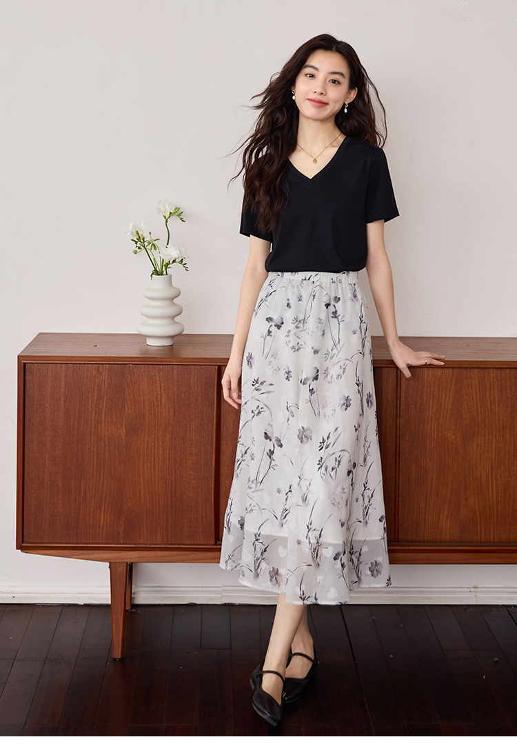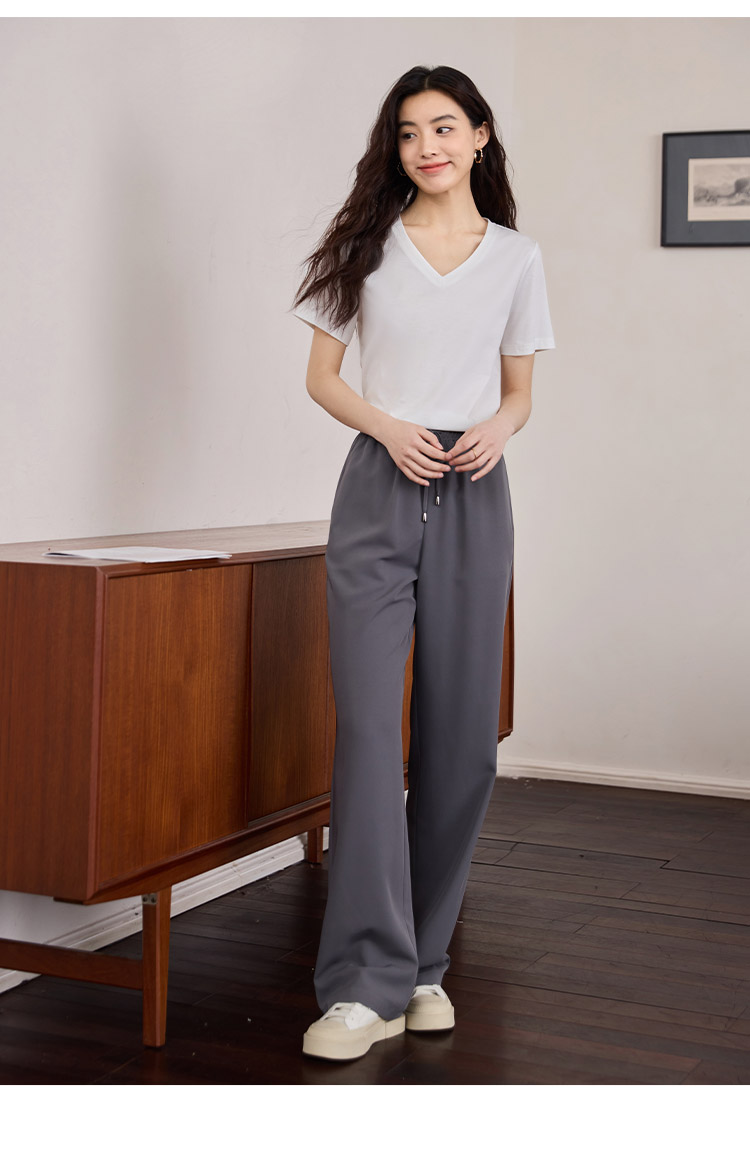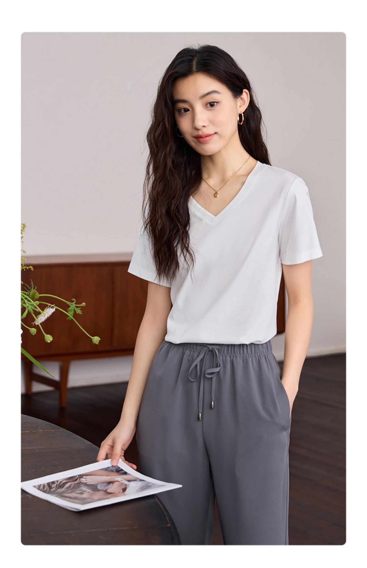 【专属特价】熙世界重磅70s丝光棉t恤女短袖夏简约纯色V领体恤上衣