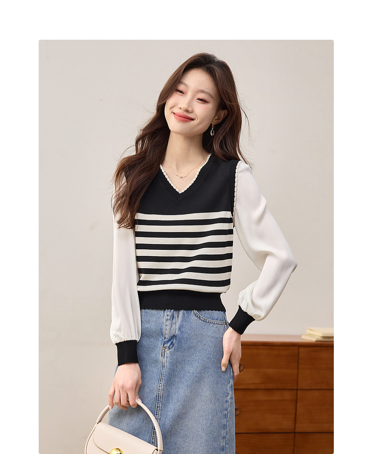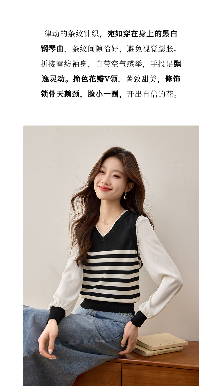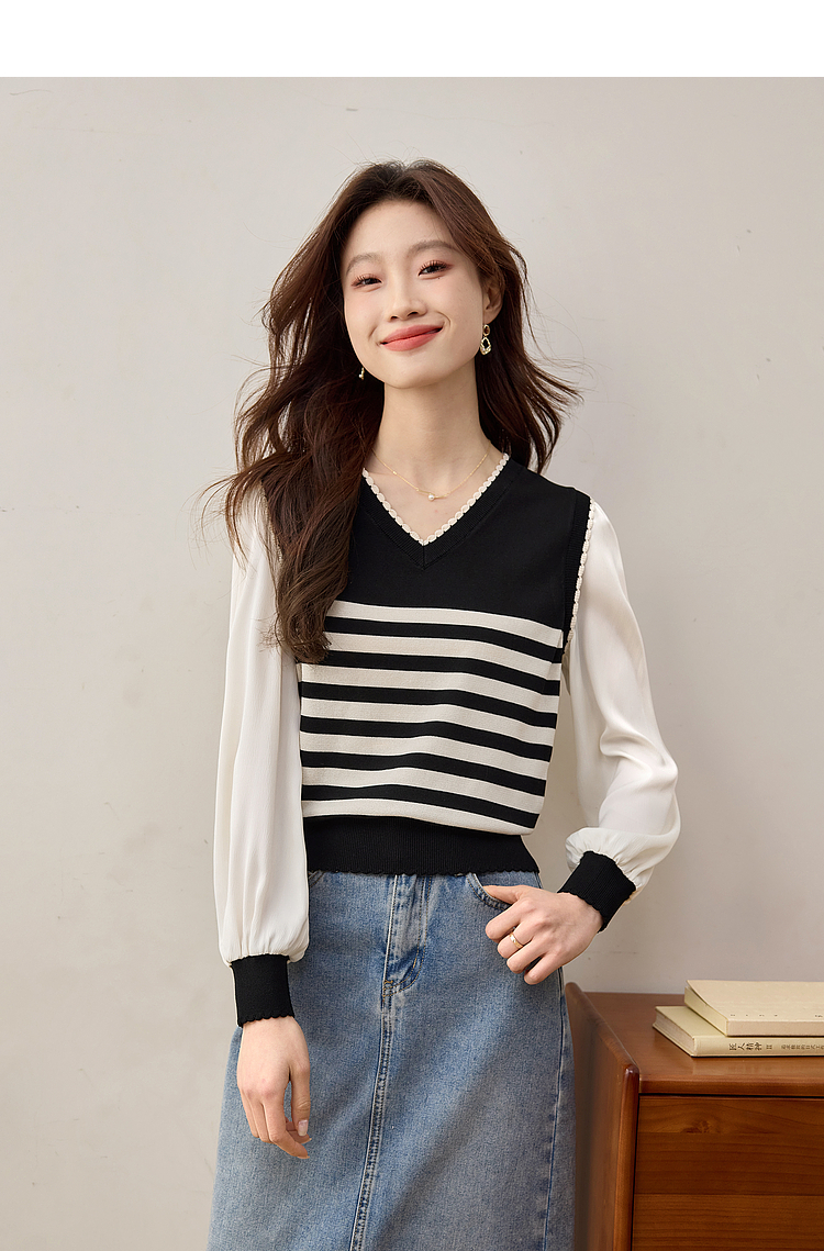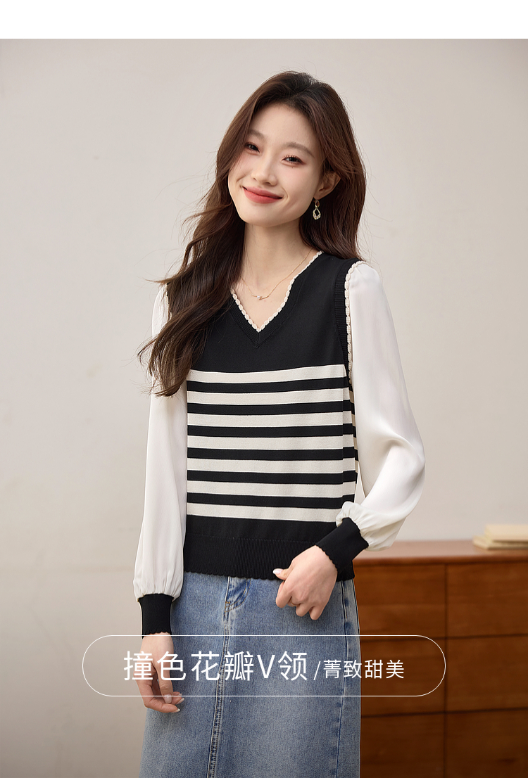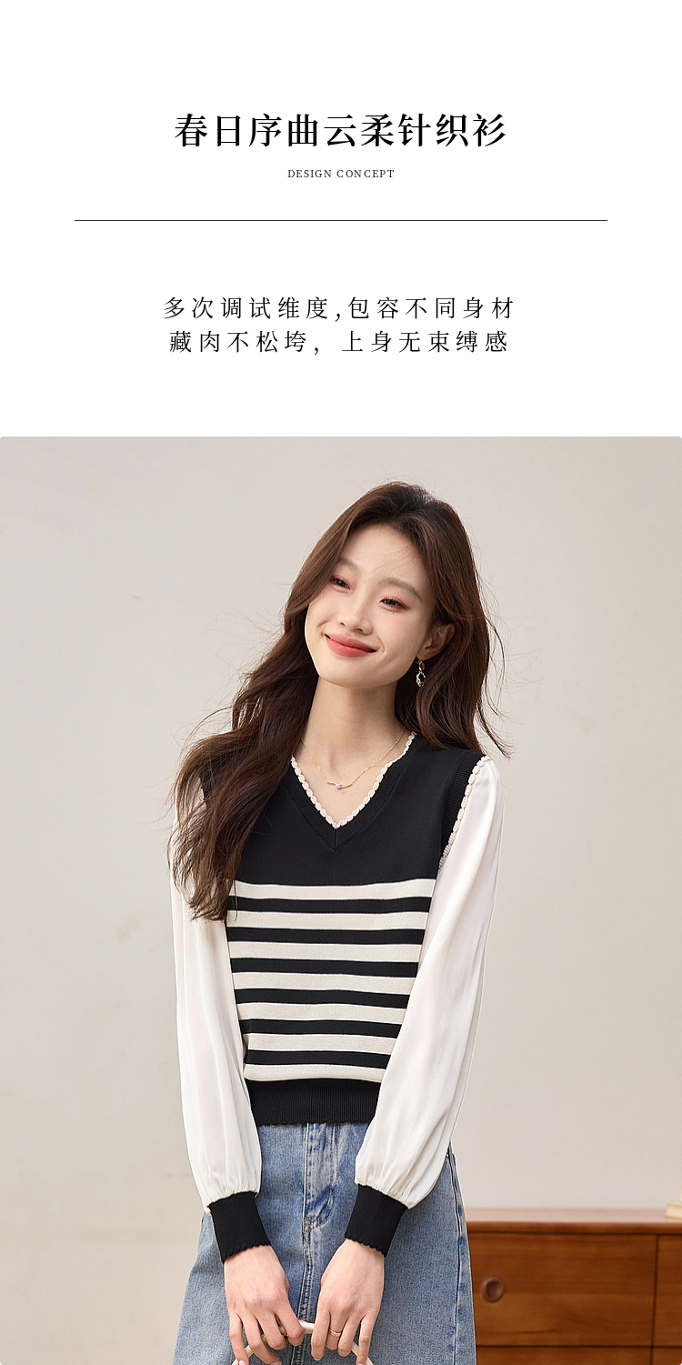 【专属特价】熙世界2025春新款假两件长袖拼接条纹针织衫女设计感套头V领上衣
