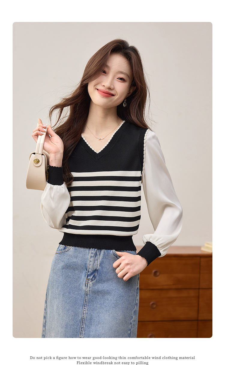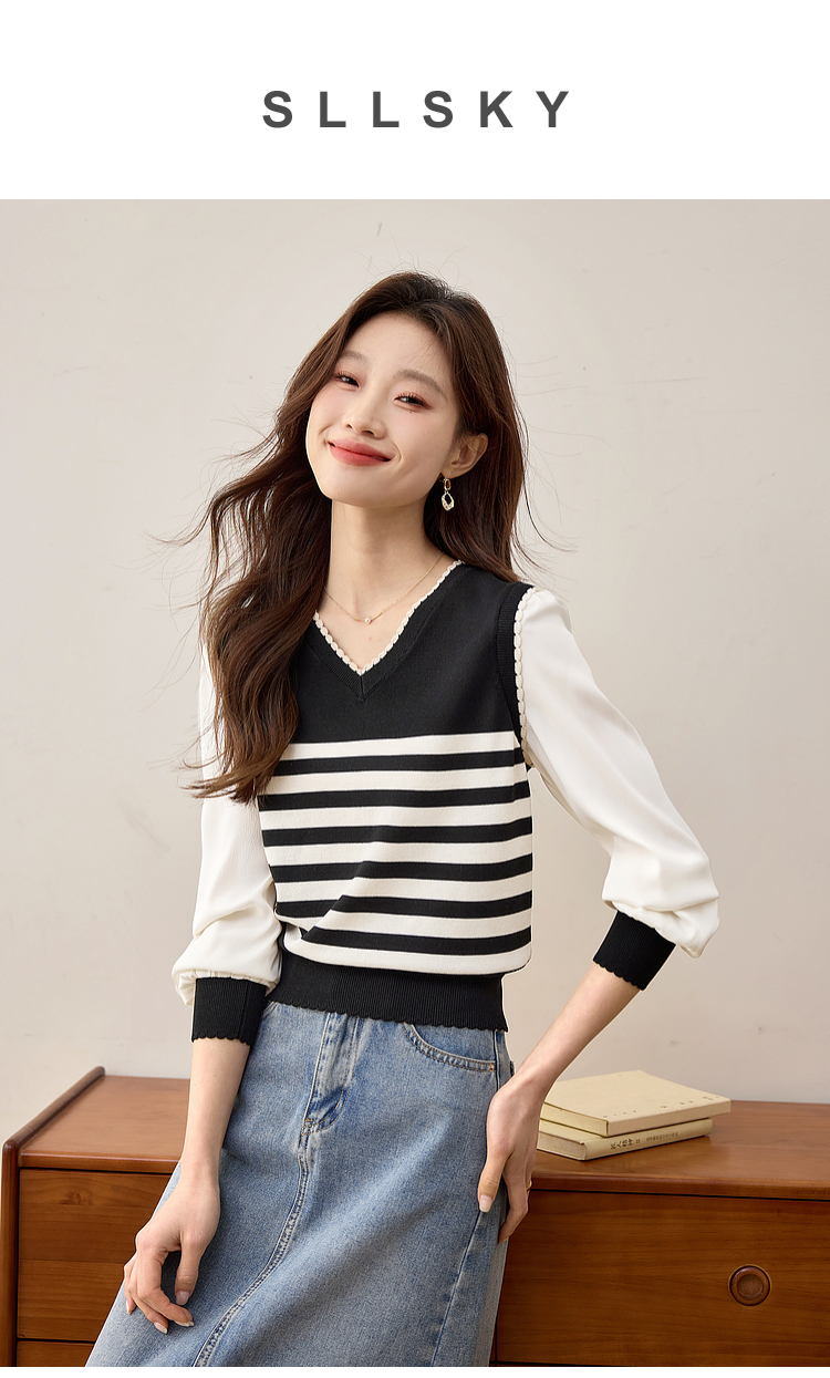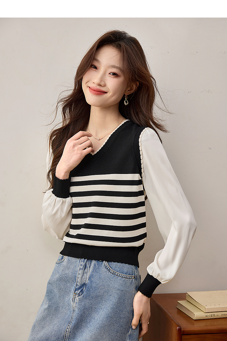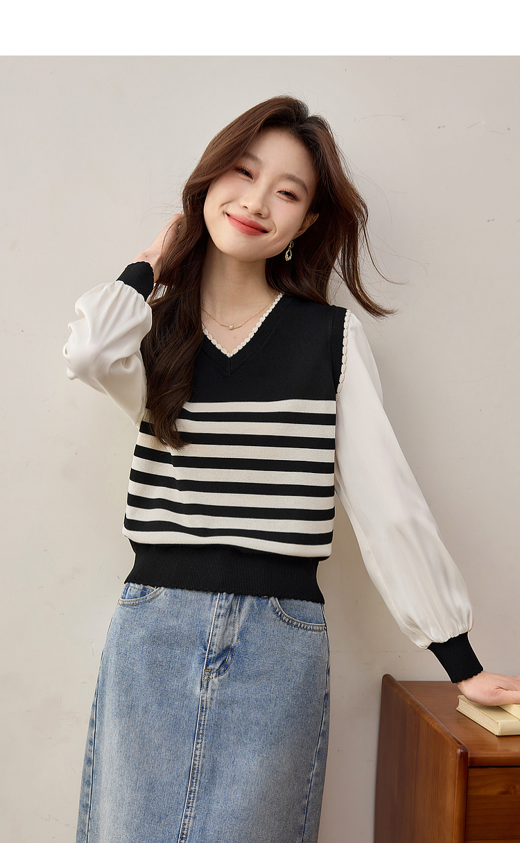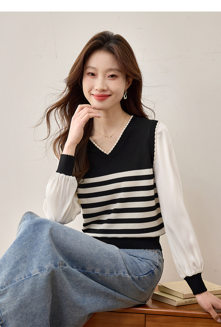 【专属特价】熙世界2025春新款假两件长袖拼接条纹针织衫女设计感套头V领上衣