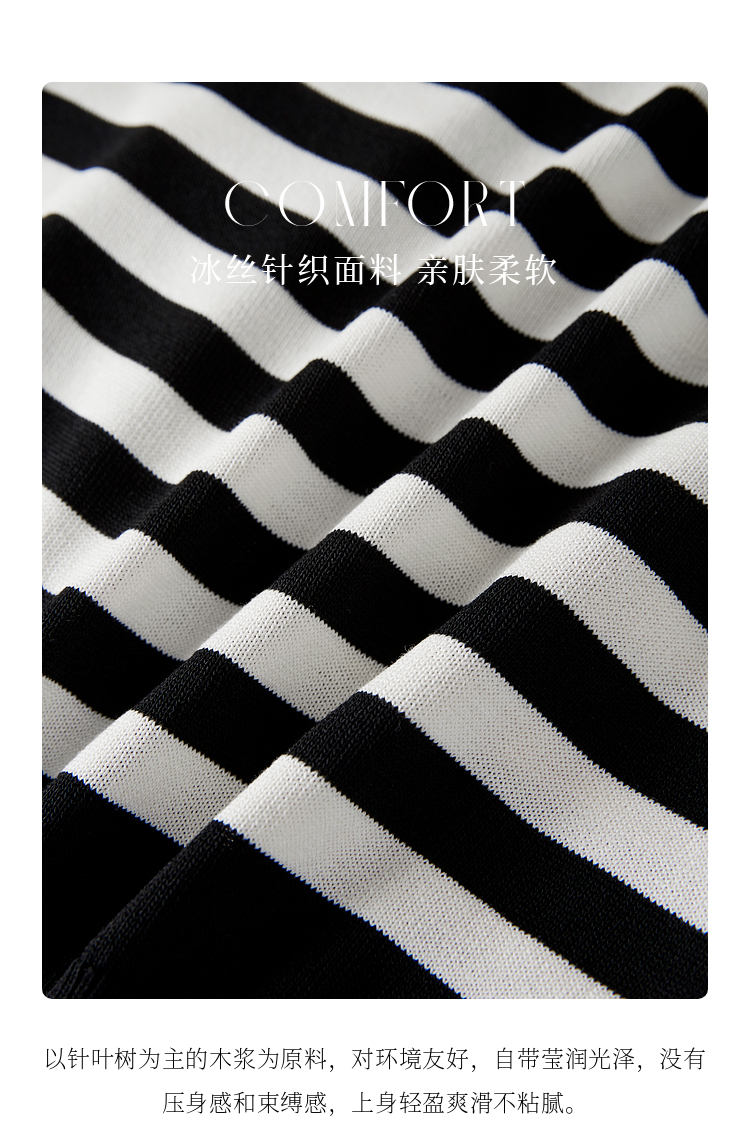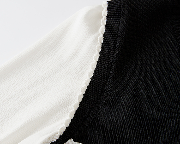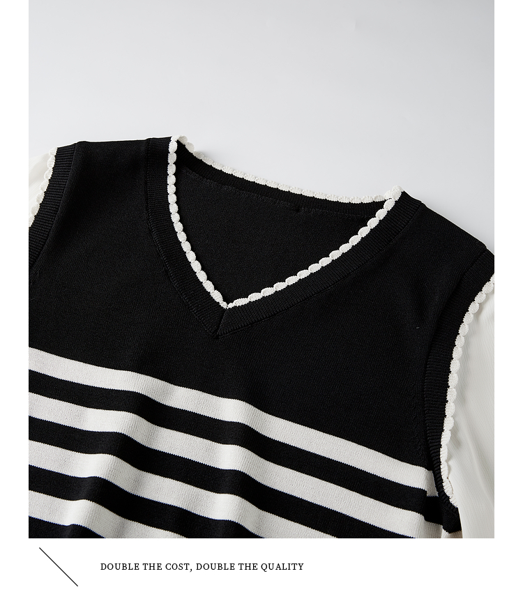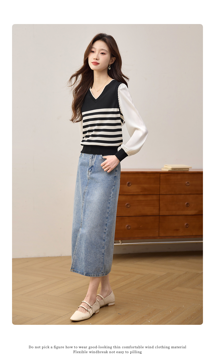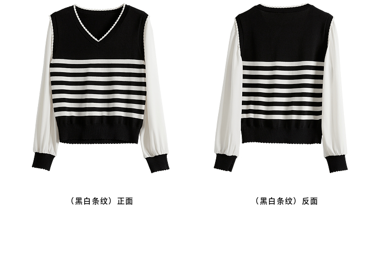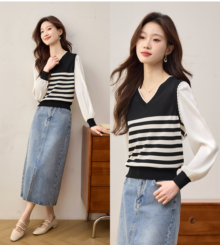 【专属特价】熙世界2025春新款假两件长袖拼接条纹针织衫女设计感套头V领上衣