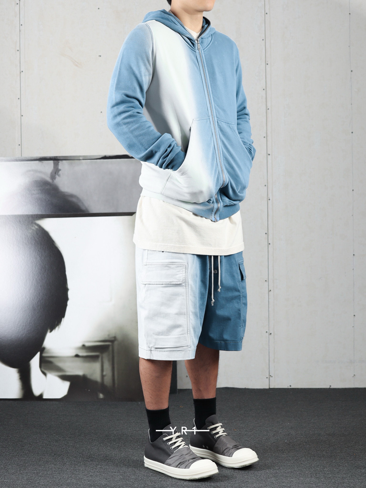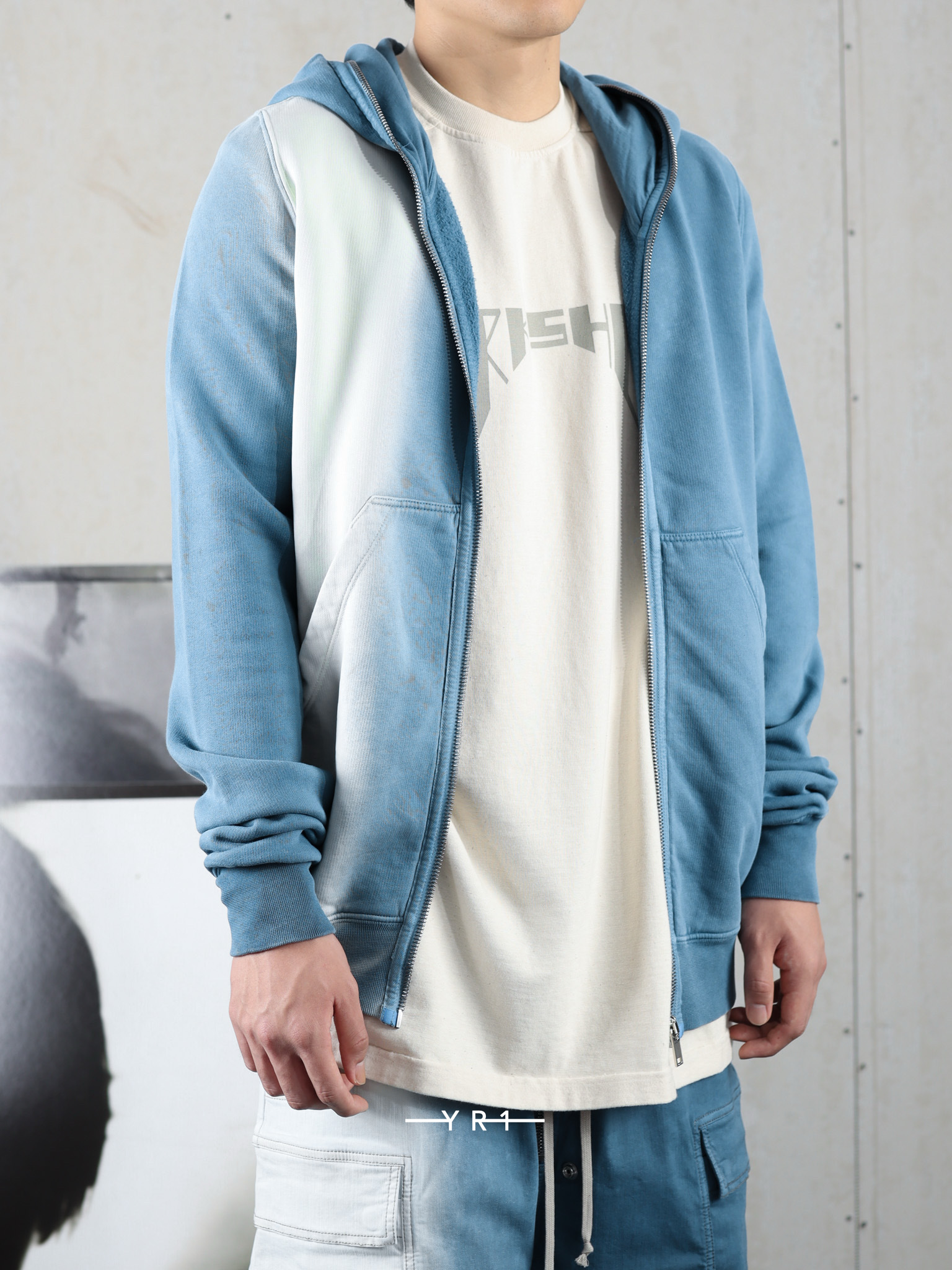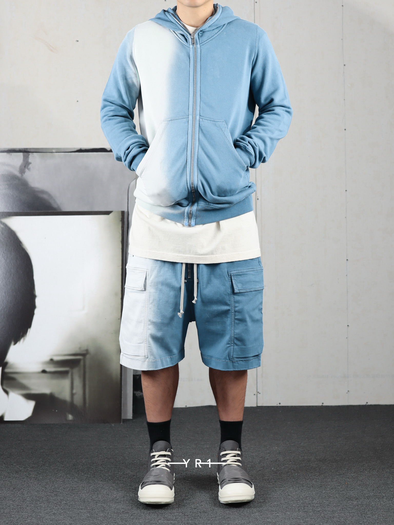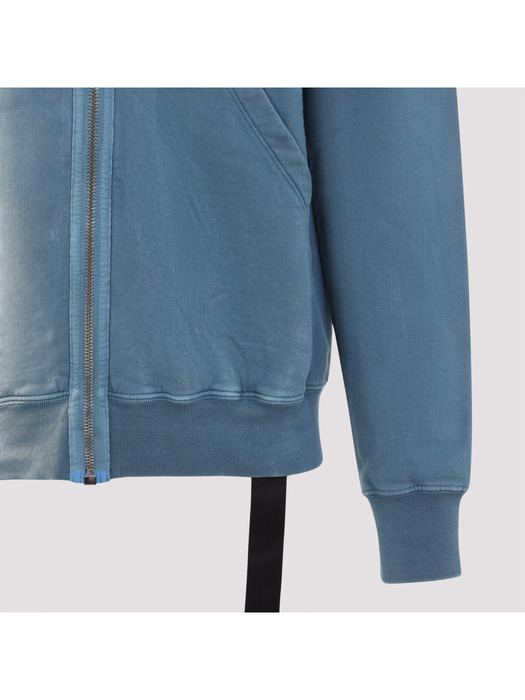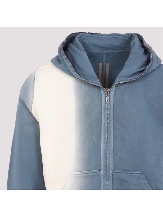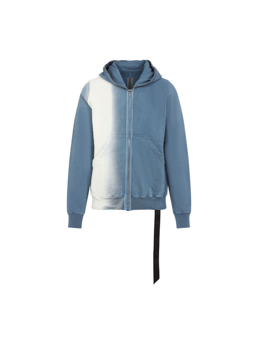 这件衣服前面有拉链闭合,拉链带暴露在外,穿过帽檐,可以一直拉上盖住脸部。