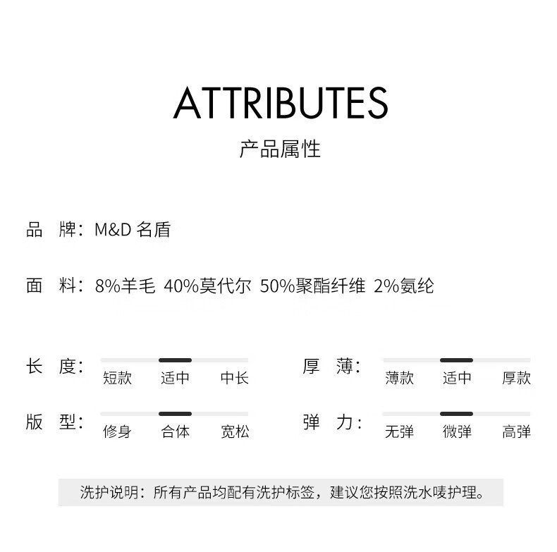| 版型: 标准型 | 材质: 羊毛8%,莫代尔40%,涤纶(聚酯纤维)50%,氨纶(聚氨酯弹性纤维)2% |