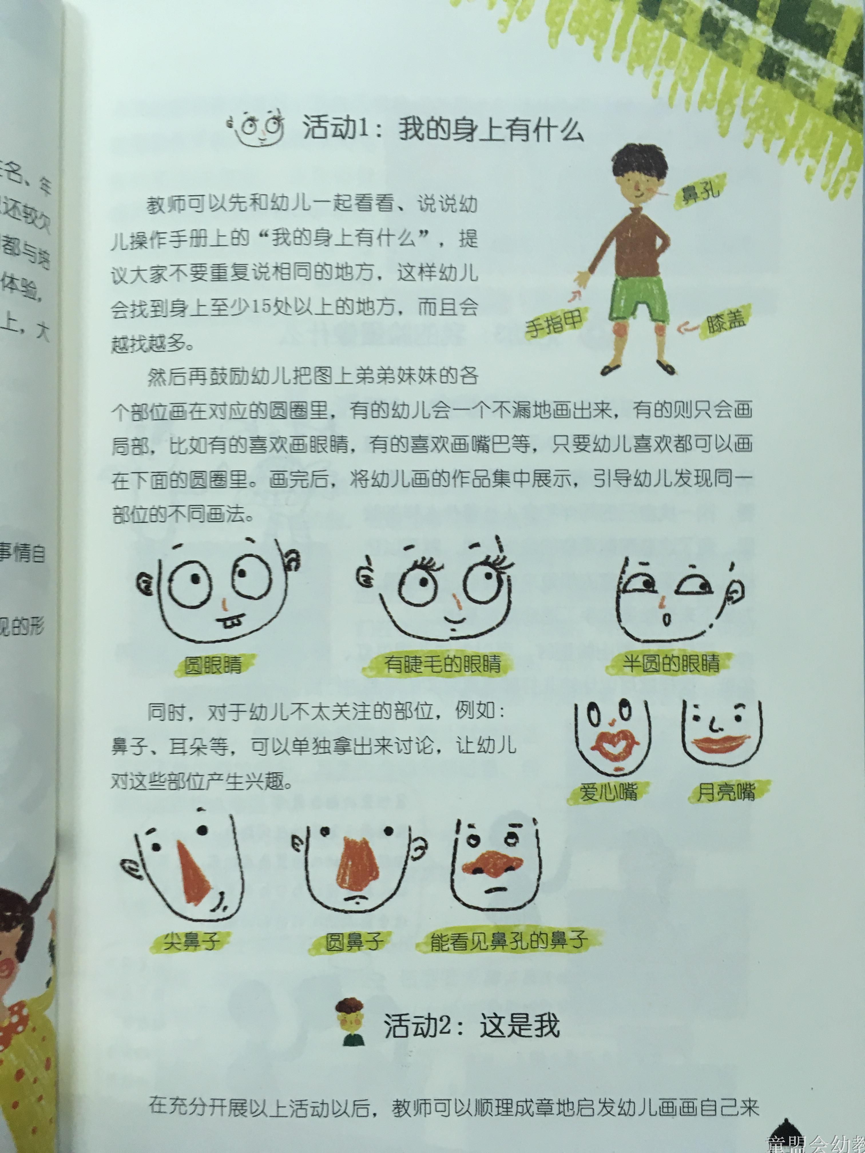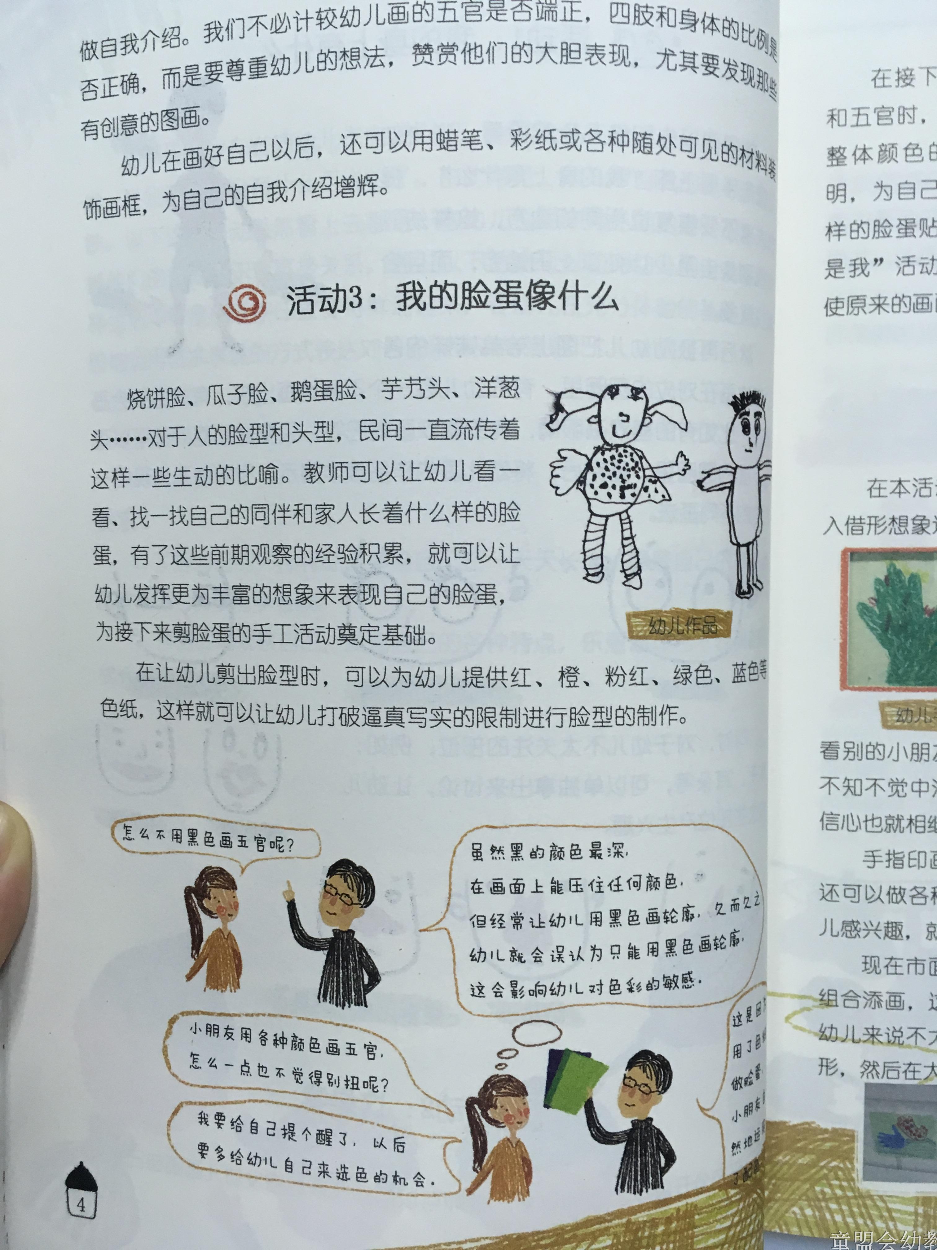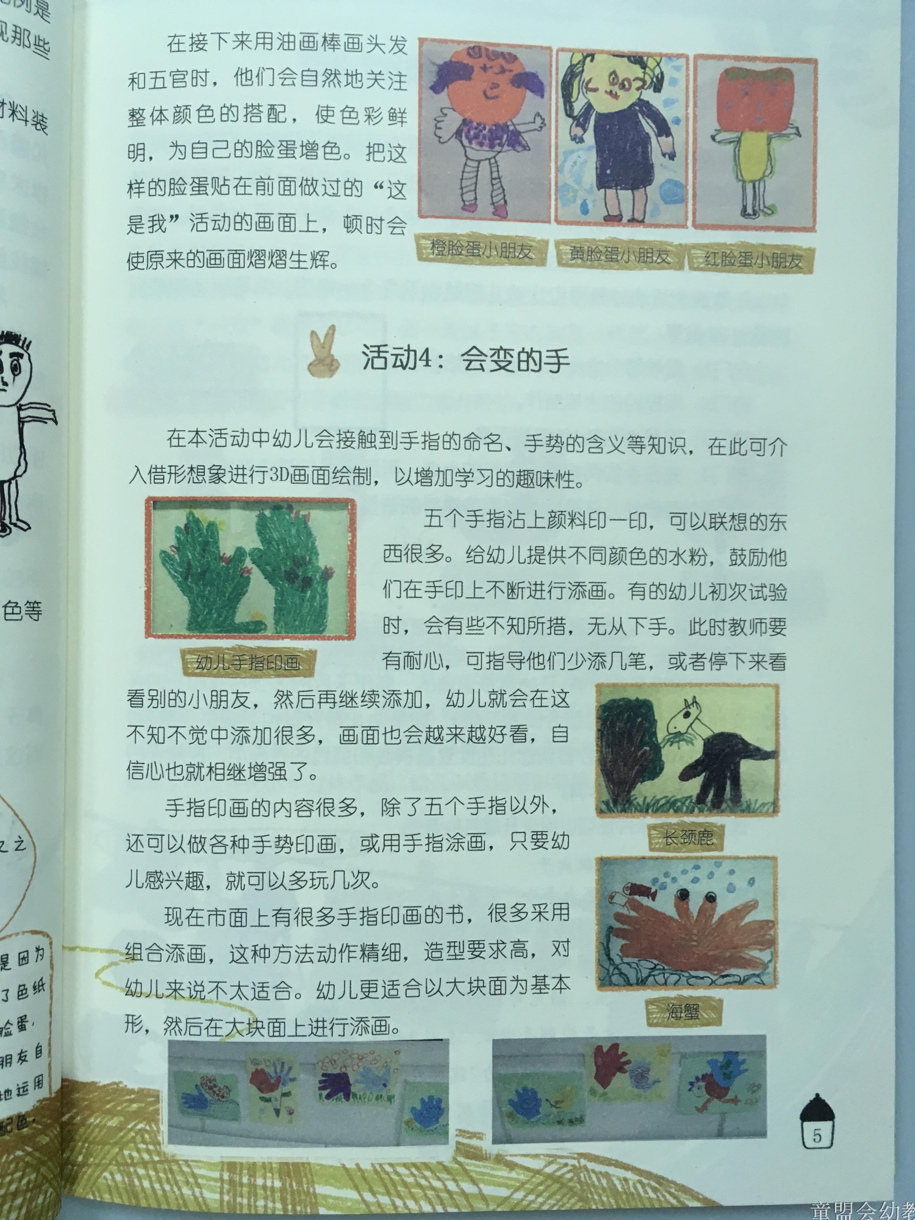幼儿操作手册以落实活动教学、关注活动过程中每一个幼儿美术创意的生成为落点。没有太多的理论讲述,更多的是让幼儿学习美术时增强信心、保护创意;从生活中挖掘题材,不直接让幼儿机械地模仿技法,而是将美术技法教学融于主题活动当中;探究与主题融合的美术教学活动的设计与实施。