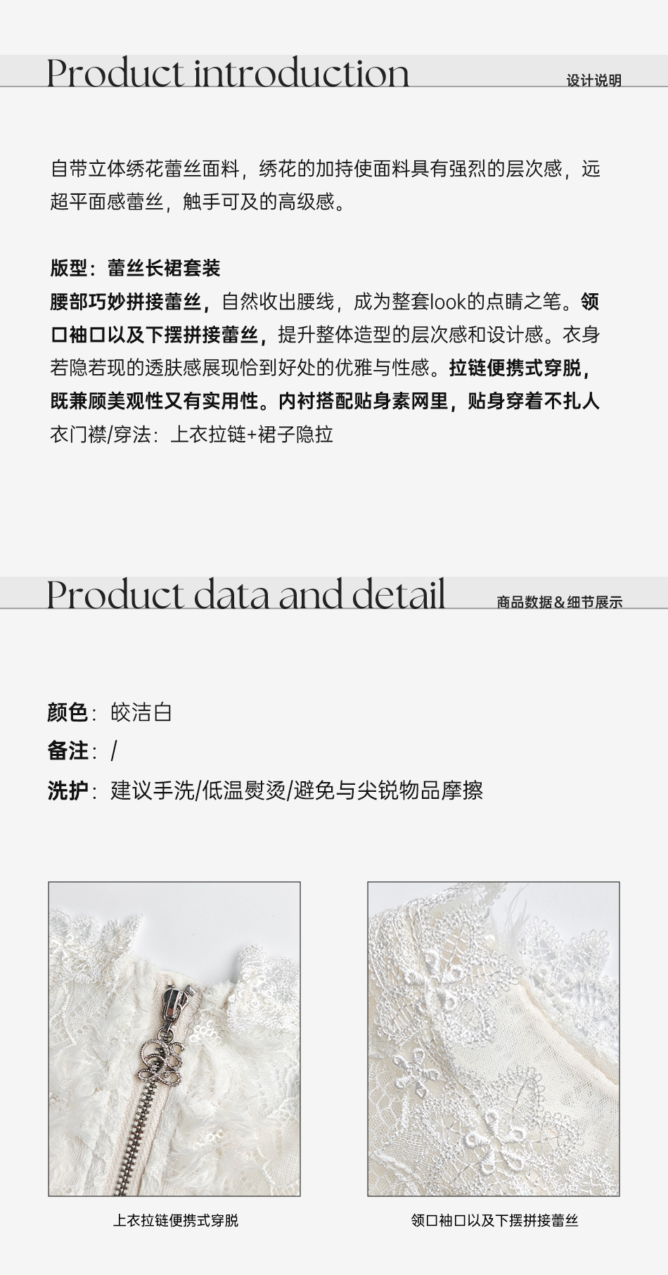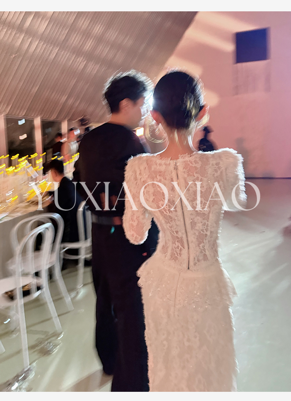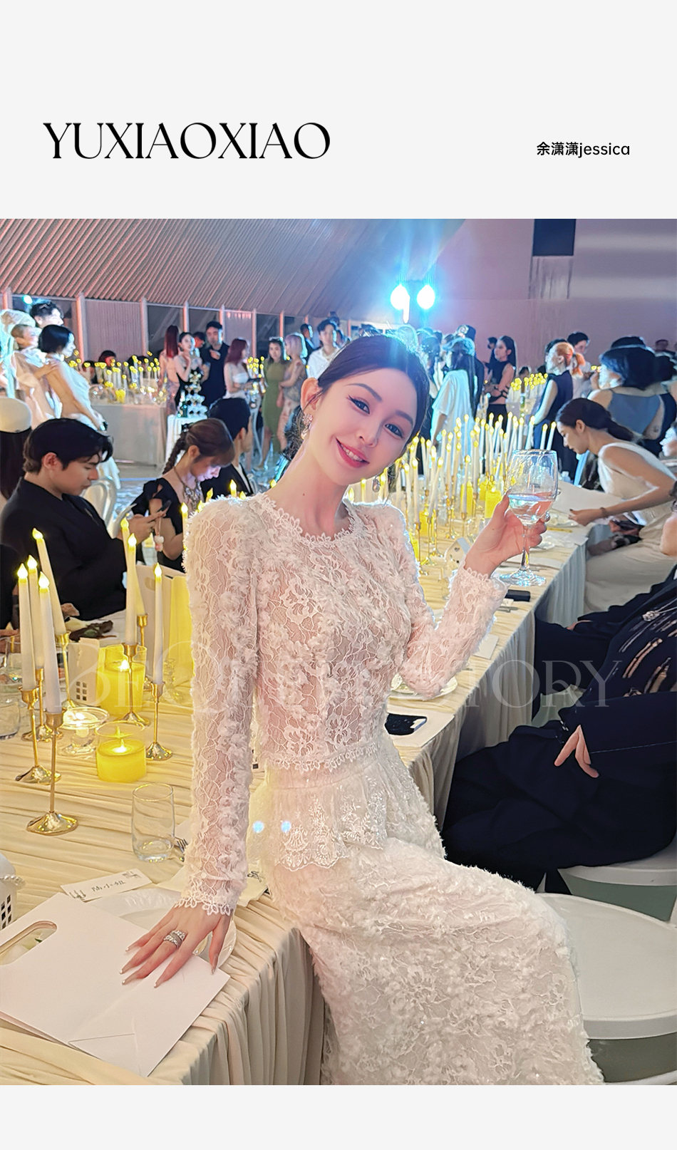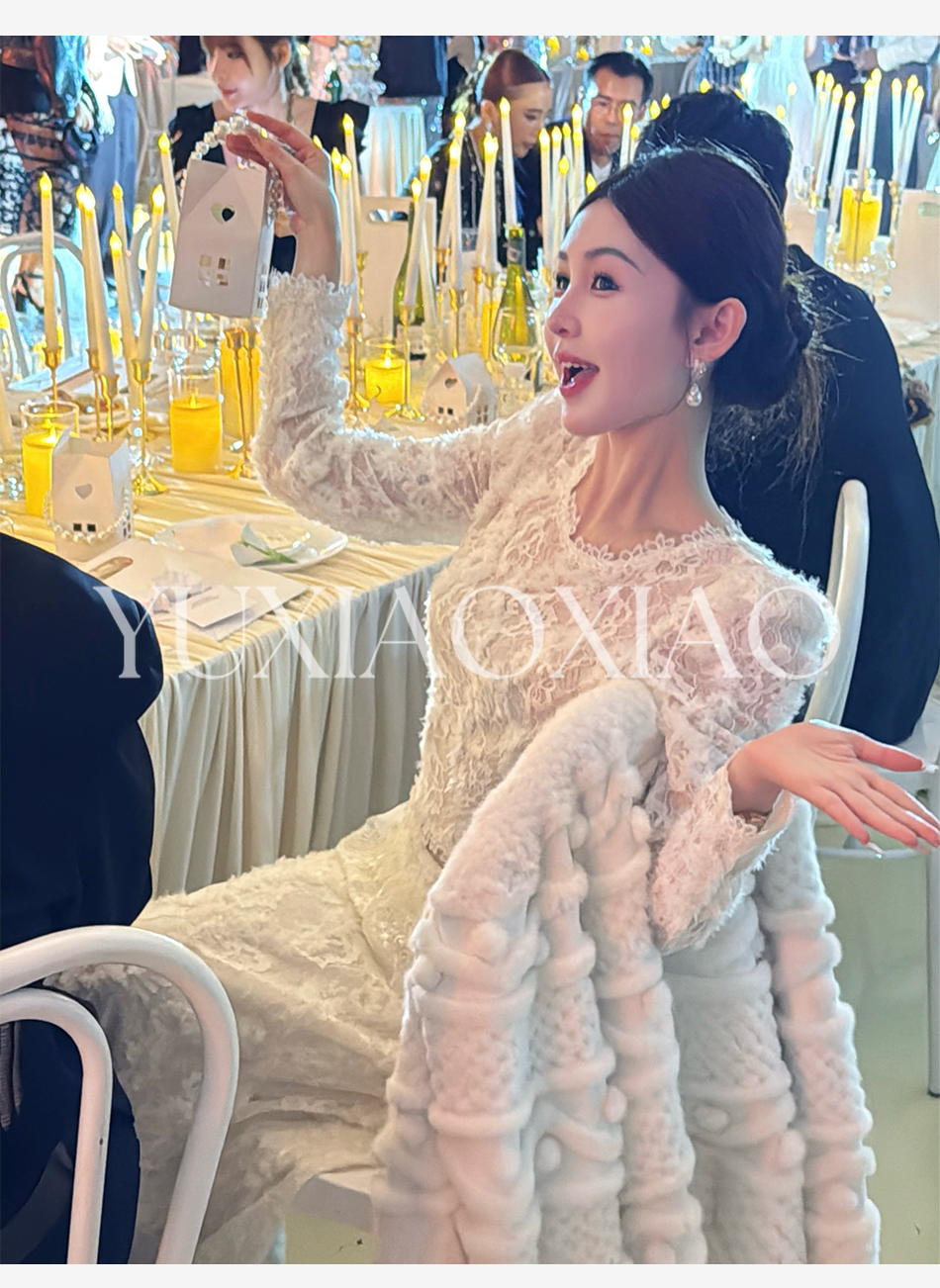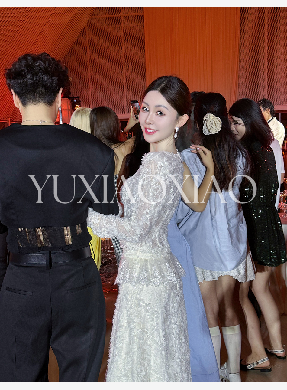 余潇潇【深情告白】法式轻熟重工圆领绣花蕾丝上衣&隐拉长裙套装