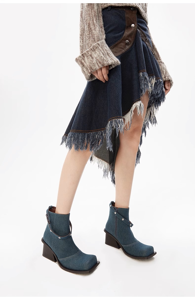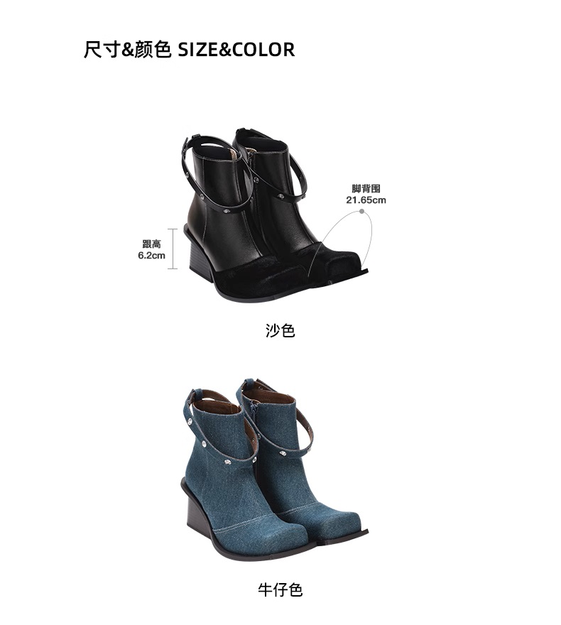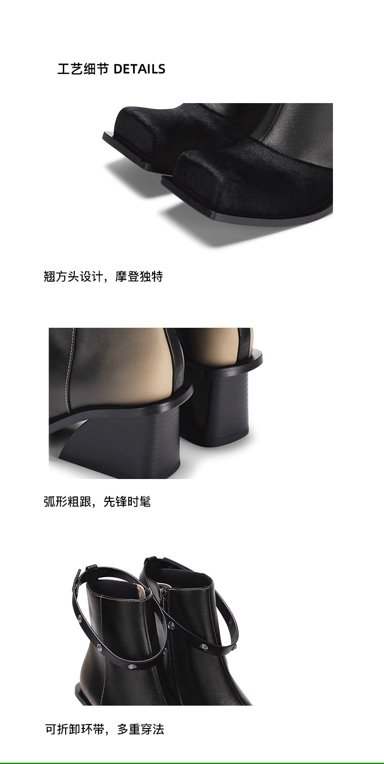 lost in echo设计师品牌小众设计感环带翘方头粗跟百搭短靴踝靴女