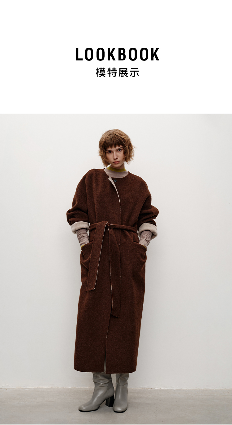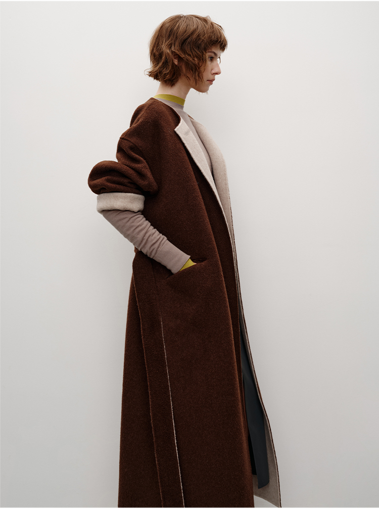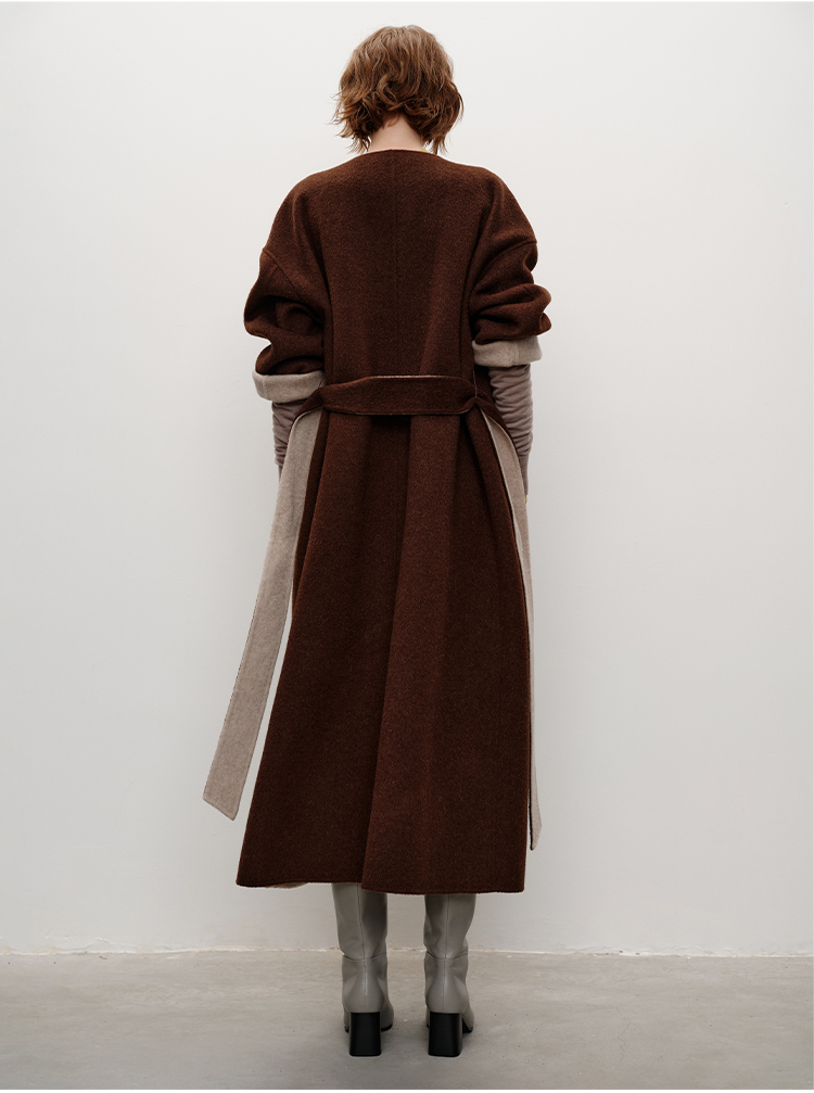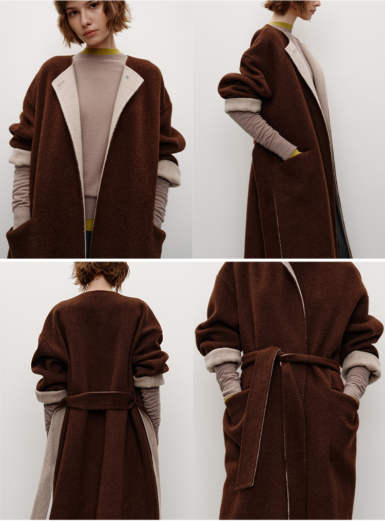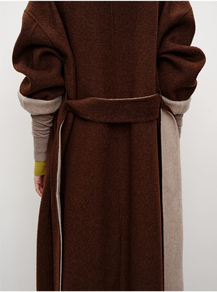 HIDEMI 进口美利奴羊毛撞色双面呢大衣圆领浴袍腰带长款外套 咖啡色撞燕麦米