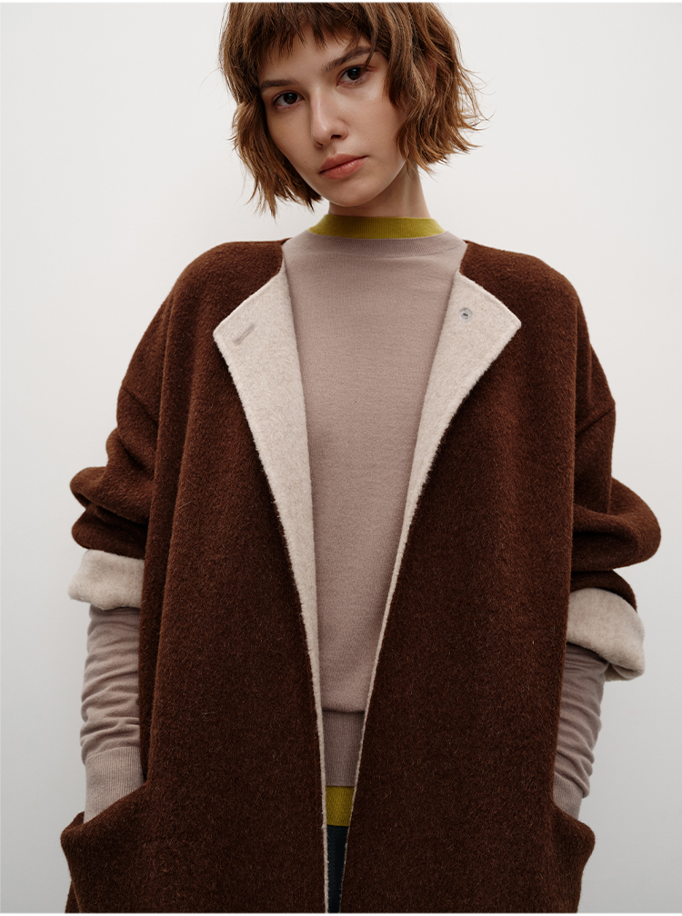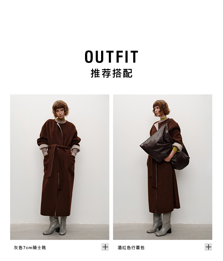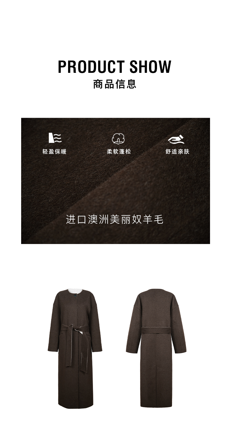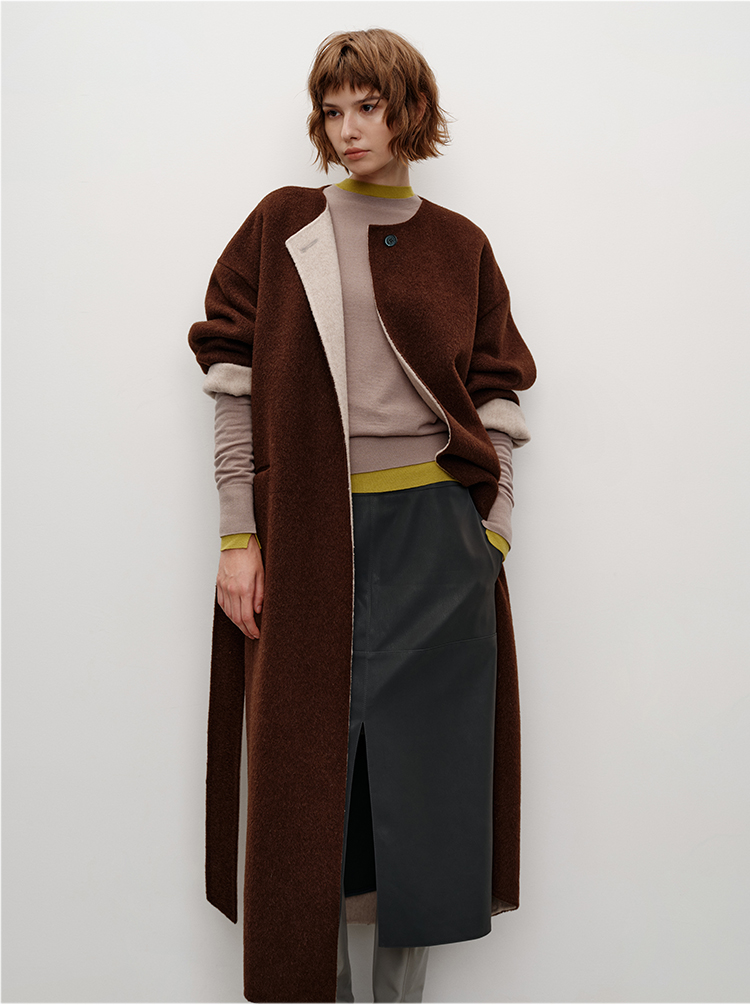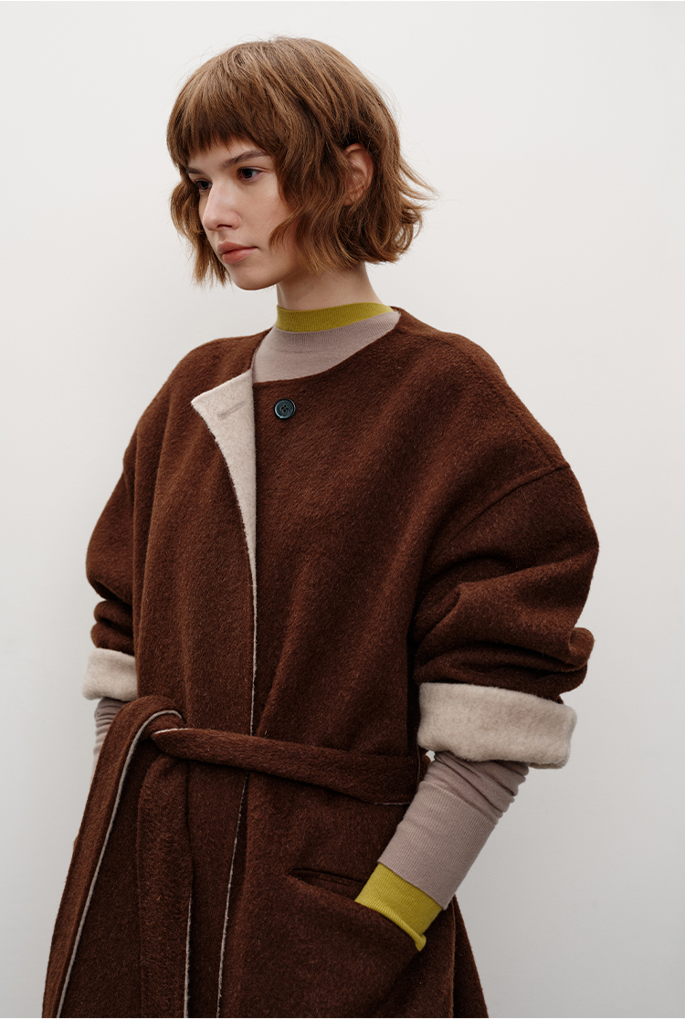 HIDEMI 进口美利奴羊毛撞色双面呢大衣圆领浴袍腰带长款外套 咖啡色撞燕麦米