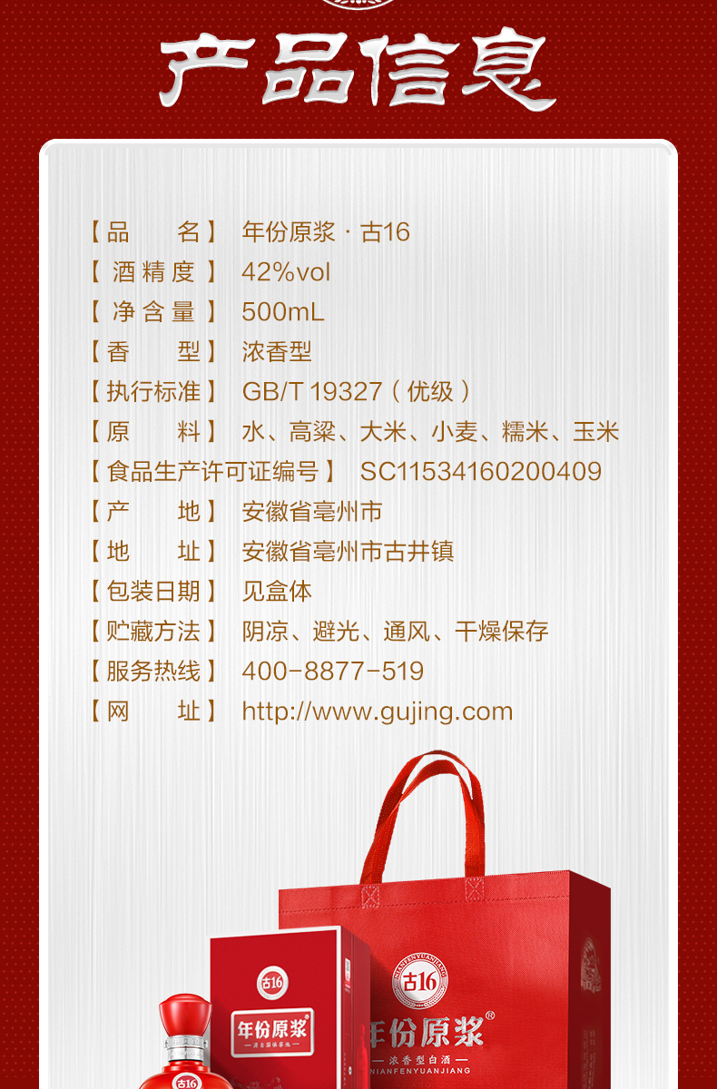 古井贡酒年份原浆古16 42度500ml*1浓香型白酒婚宴商务送礼