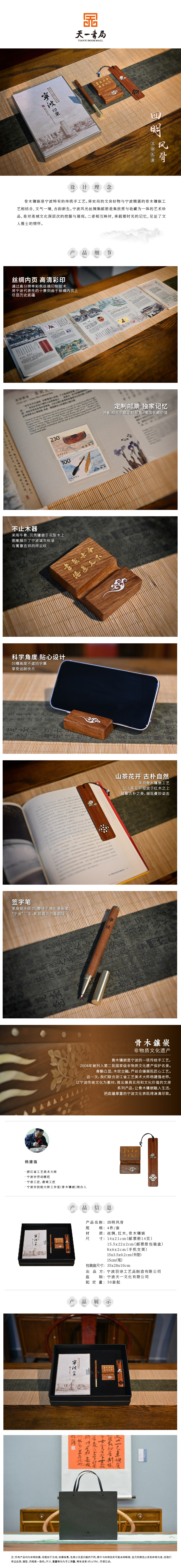 羽诗制造出品 四明风骨丝绸邮票珍藏册骨木镶嵌手机支架书签笔礼盒套装