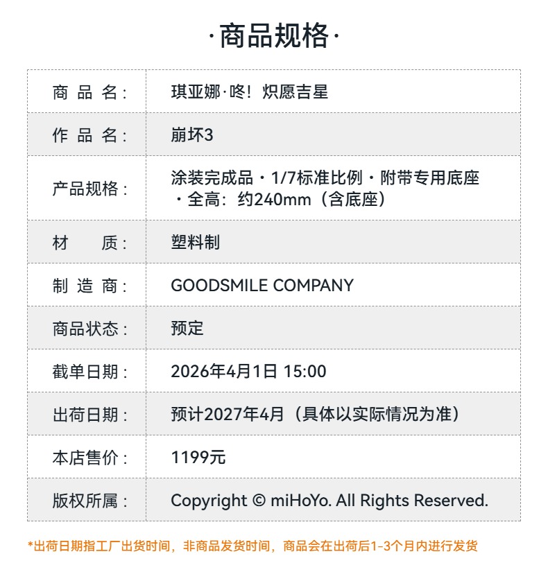 【GSC预售定金】1/7标准比例 琪亚娜·咚!炽愿吉星 附官方限定特典 官方限定 崩坏3