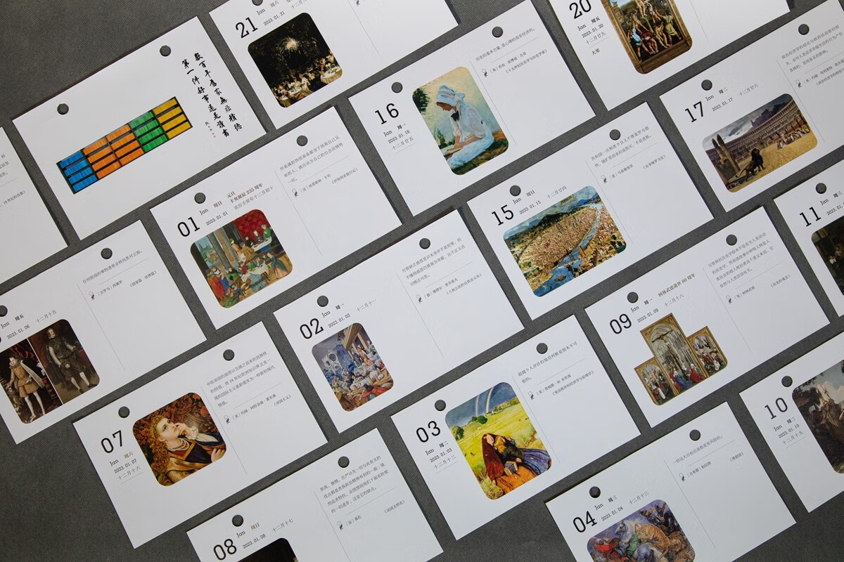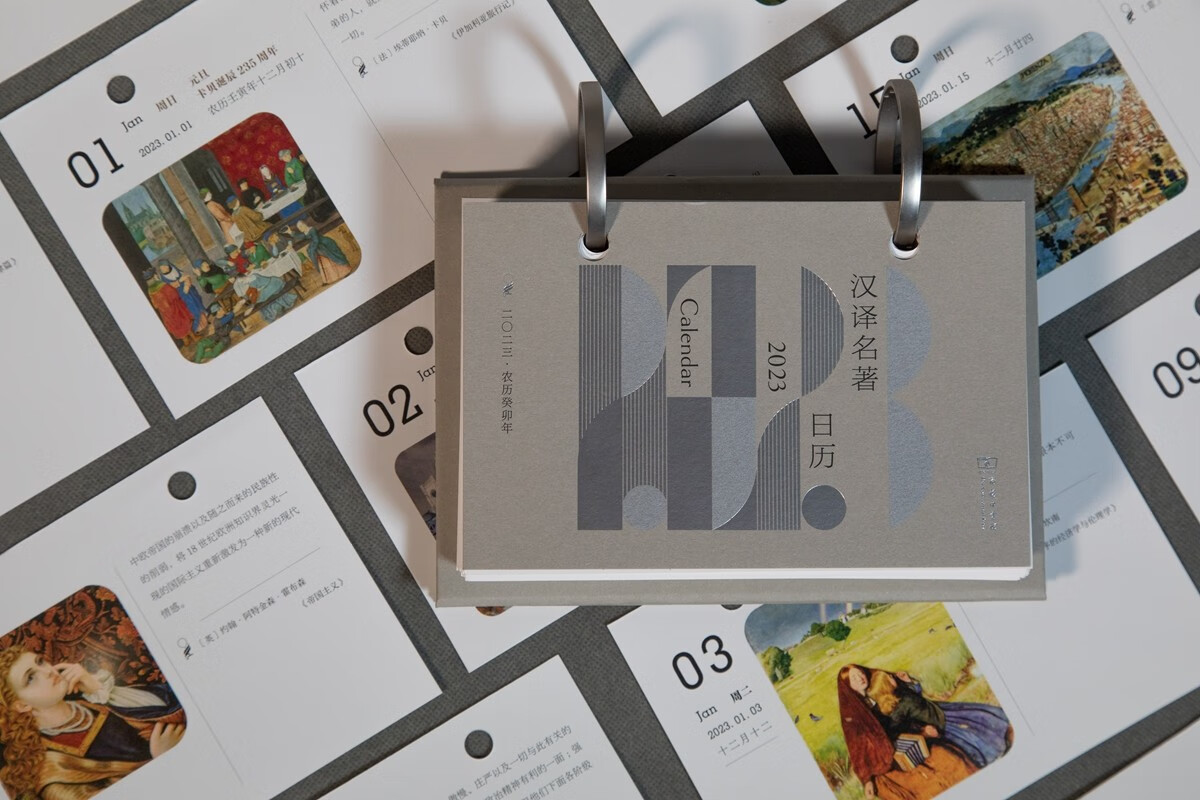 今年汉译名著日历采取横版双环格式,摆放更稳固,外包装盒形状方正,哑光石灰色配以烫银工艺,并以书底变形数字呈现2023,整体造型更加雅致大气。