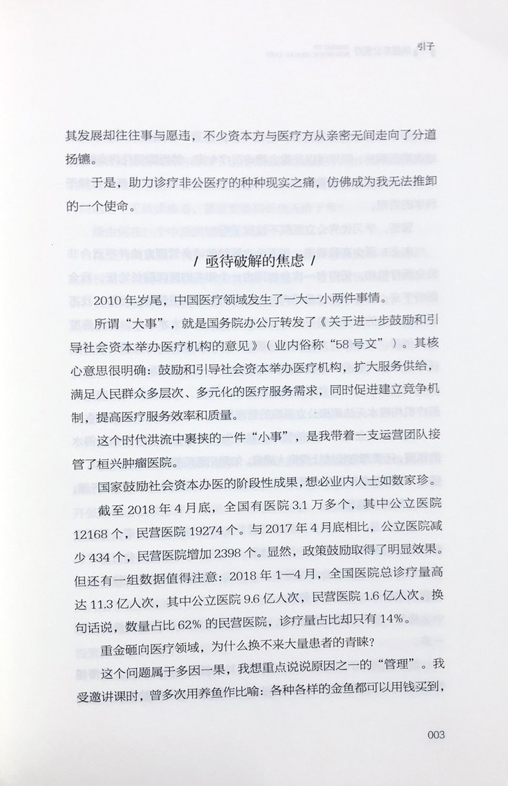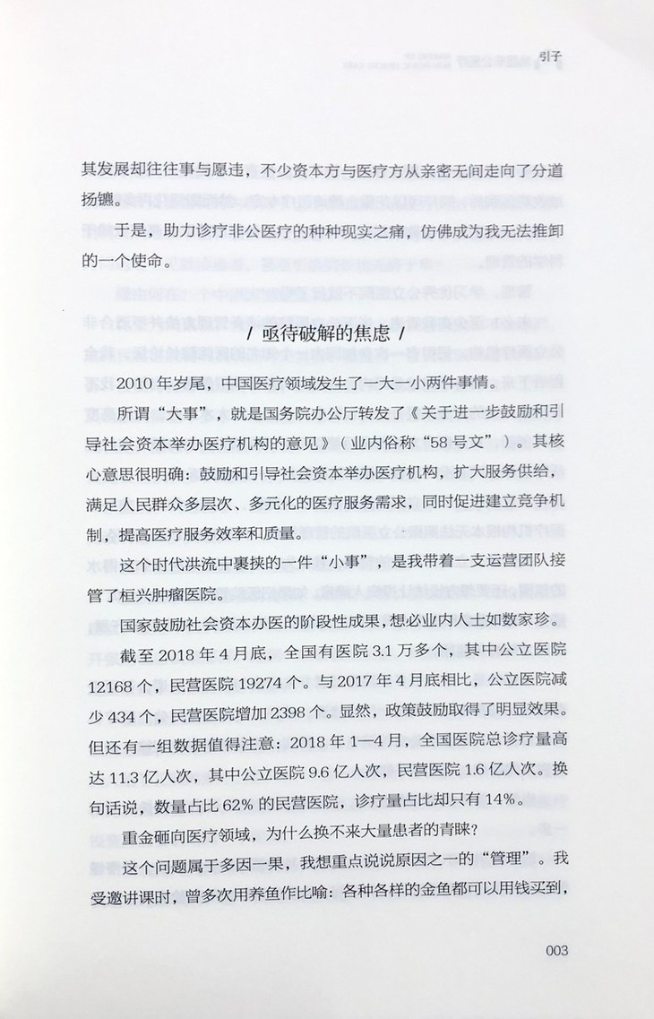 我希望通过丁剑院长这本书,“唤醒”非公立医疗机构的同道们进一步学习和理性思考,办好在数目上已经超过公立医疗机构的民营医疗机构,与公立医疗机构互补,为保证我国广大人民健康和实现健康中国大业贡献力量。