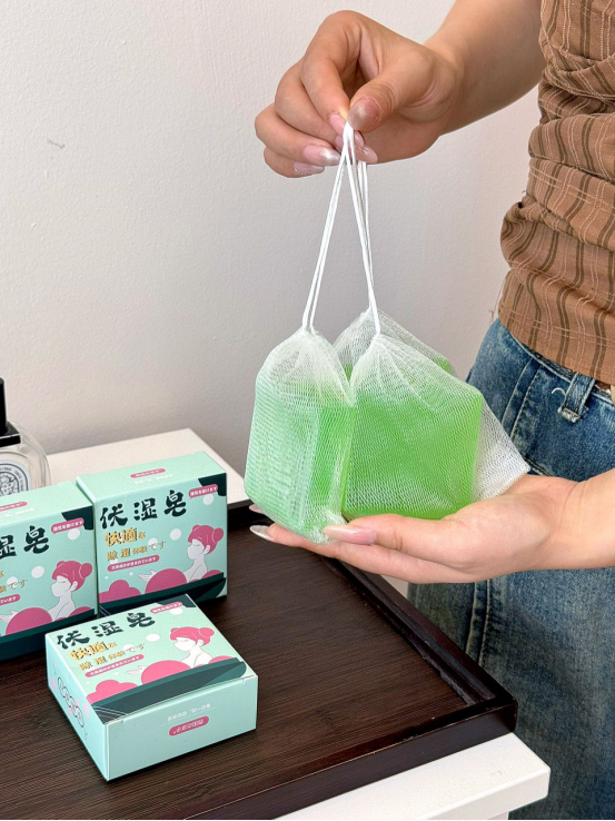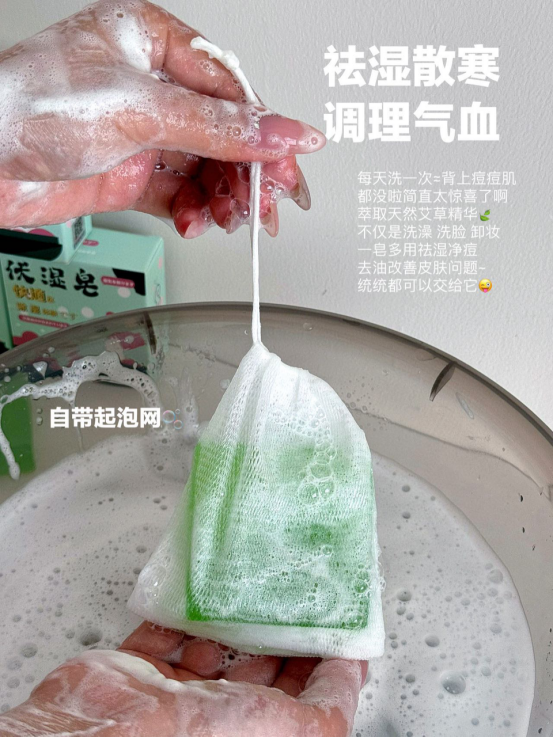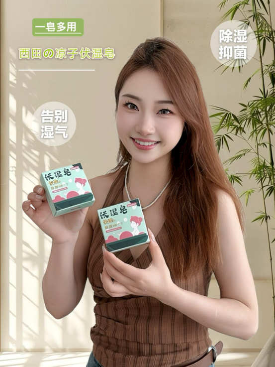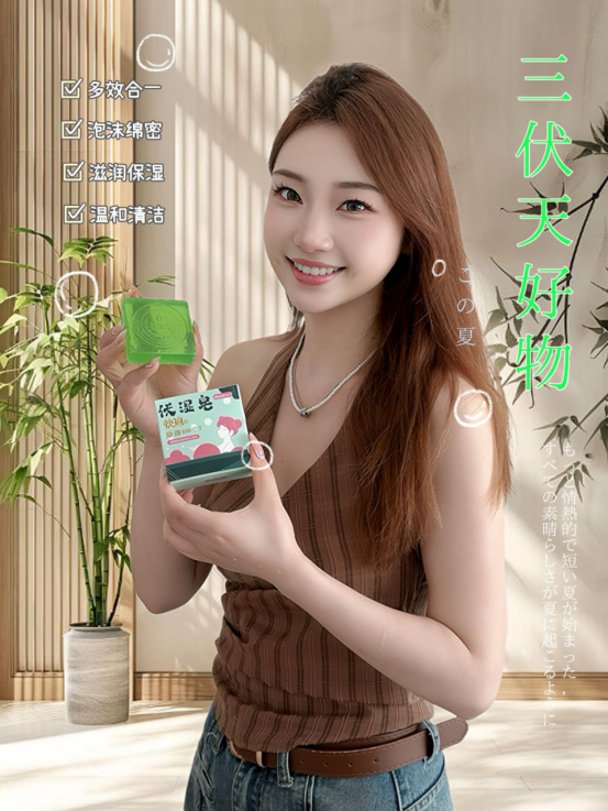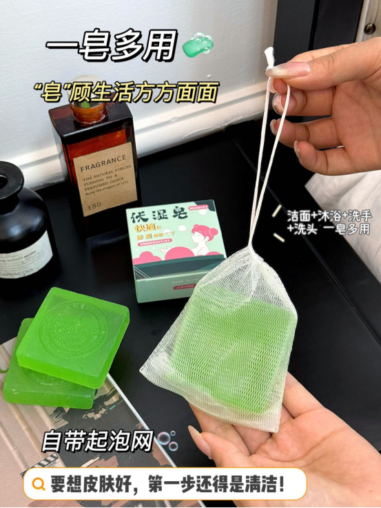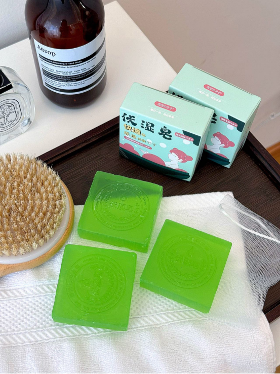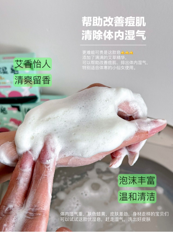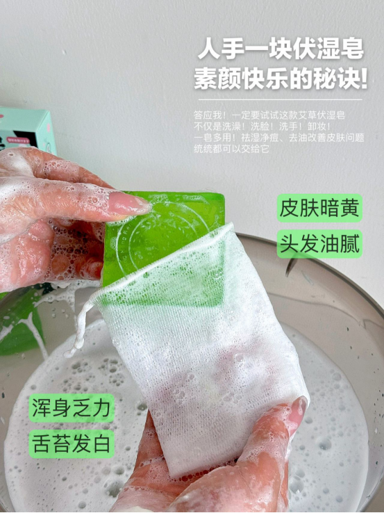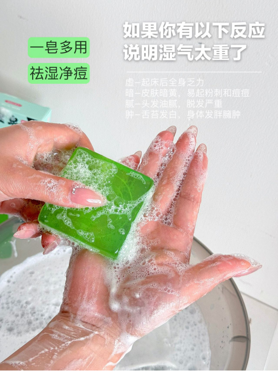 这款伏湿皂,在使用的过程中精华透过皮肤的表层、, 进入体内带走沉积的湿毒,赶走湿气 湿气少了,皮肤自然变好多重护肤植物精华,泡沫绵密丰富 柔软的泡沫深入毛孔底部 带走多余的油脂和污垢 使你的肌肤变得干净又舒适