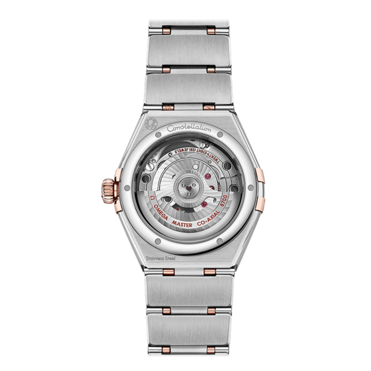 镜面材质 | 蓝宝石水晶玻璃 | 表盘 | 精钢-Sedna®18K金,表圈铺镶钻石,星座系列特有的“托爪”设计。 蓝色砂金石玻璃表盘饰有钻石小时刻度,6点钟位置设有日历窗口。指针、欧米茄品牌标识、星座徽标以及钻石托槽亦以Sedna® 18K金打造而成。 日期显示 透底 |