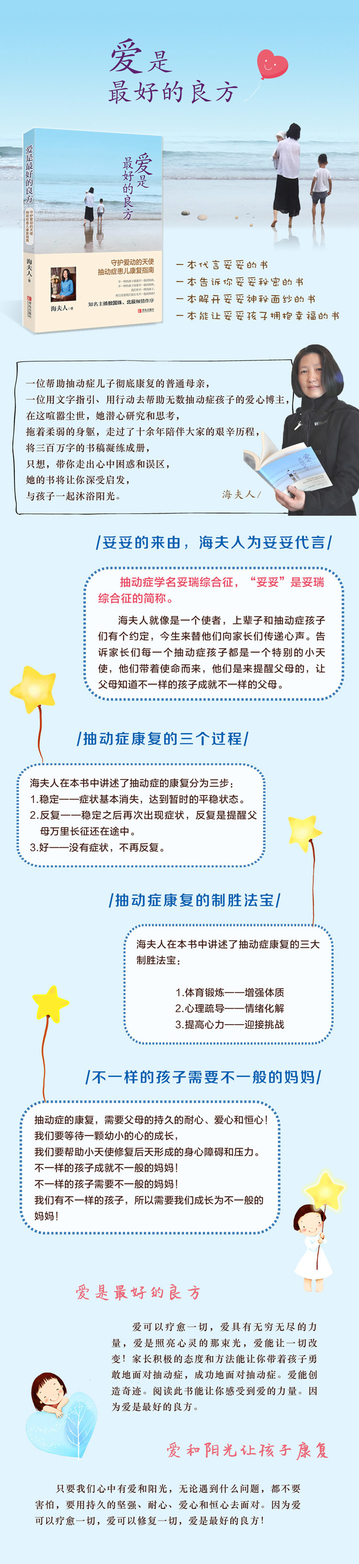 海夫人是全国知名的抽动症康复专家,通过多年探索实践,调好了自己孩子的抽动症,也摸索出系统有效的抽动症康复理念和方法。海夫人在网络上建立沐浴阳光qq群和海夫人博客,分享经验心得近十年,已成为中国民间研究抽动症(妥瑞氏症)的先驱,享有很高的声誉和影响力。很多家长都迫切想买海夫人的书。