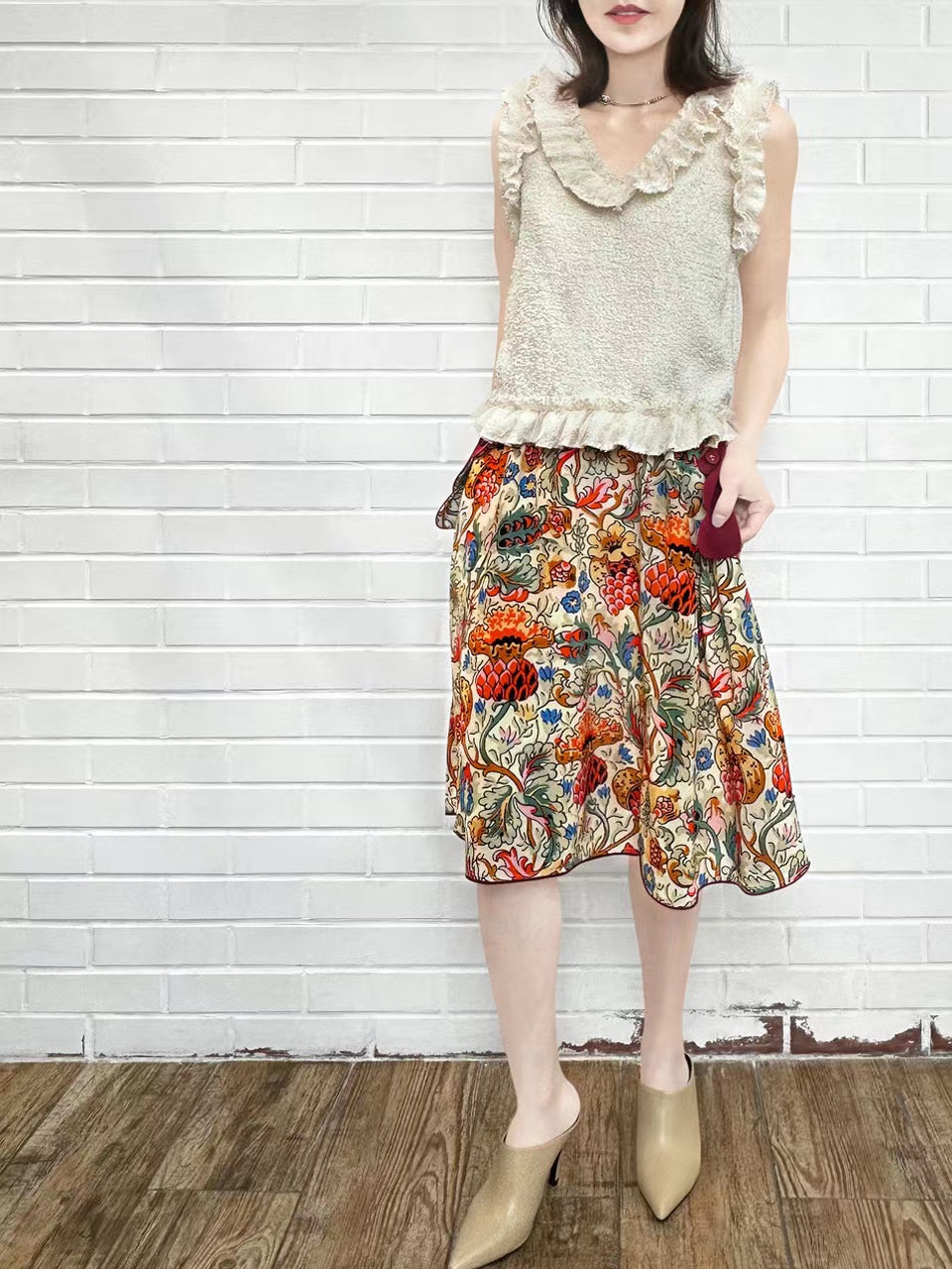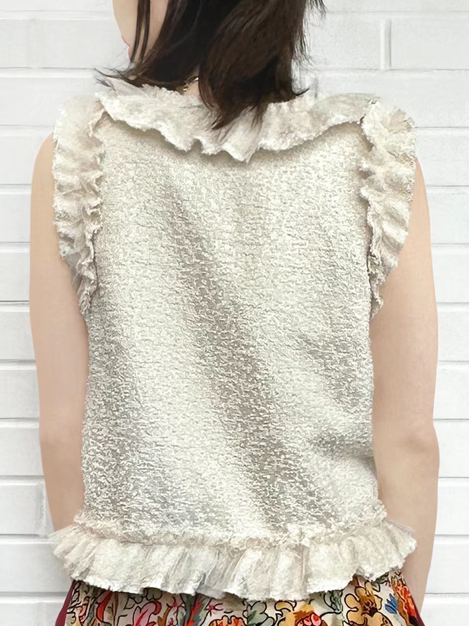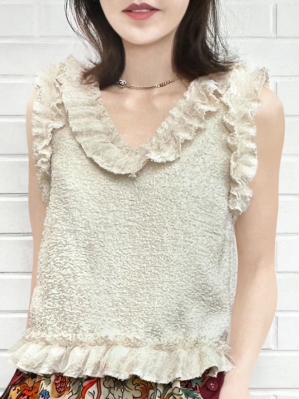 TYNVIE 拼纱花边V领背心-米黄色