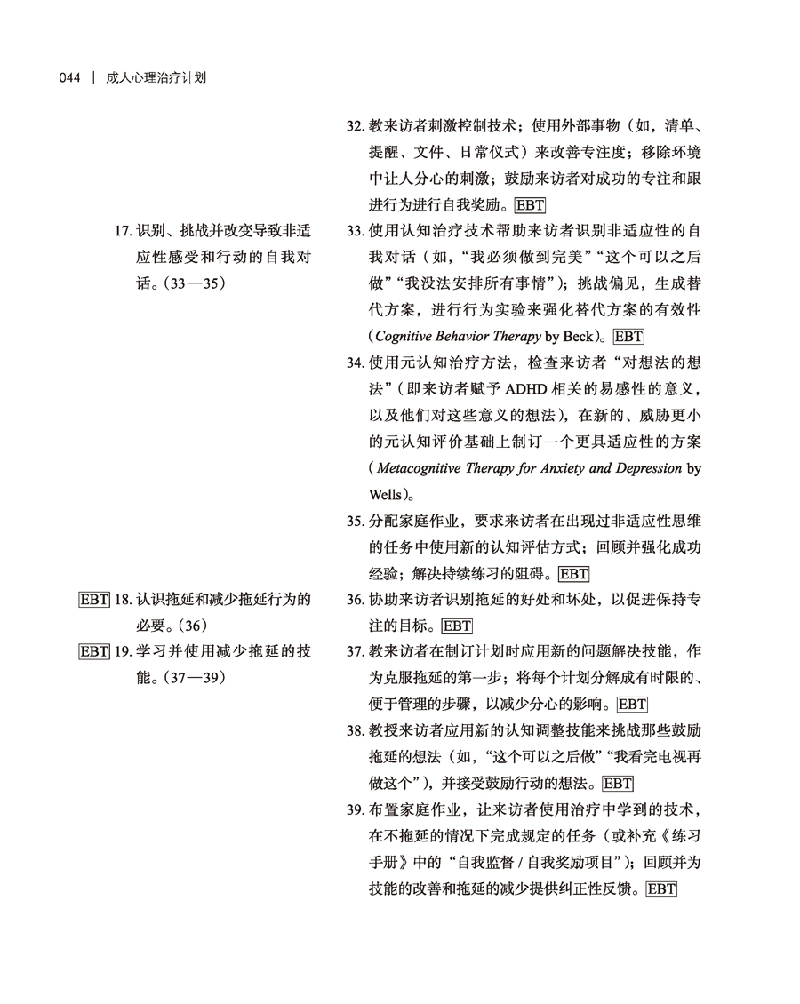 新手心理治疗师首次遇到某类心理问题时往往不知道如何应对,而针对性的治疗计划能够提高其处置能力。本书包含44种成人常见精神障碍和心理行为问题的治疗计划,且均有大量循证证据支持。本书是新手心理治疗师的案头参考书,适合广大心理治疗师和心理咨询师阅读。