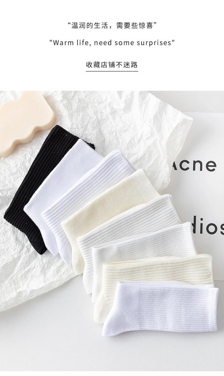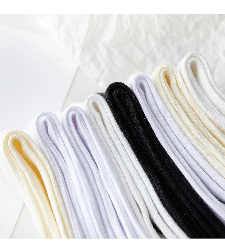都是白色系的袜子,但有纹理之分,比如:粗条纹、细条纹。它最大的特点在于,白色中还有纯白、本白、奶白之分。