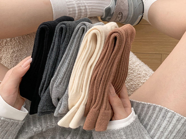 中筒袜的棉含量都在75%以上,每一组是一个系列,风格完全不同。
