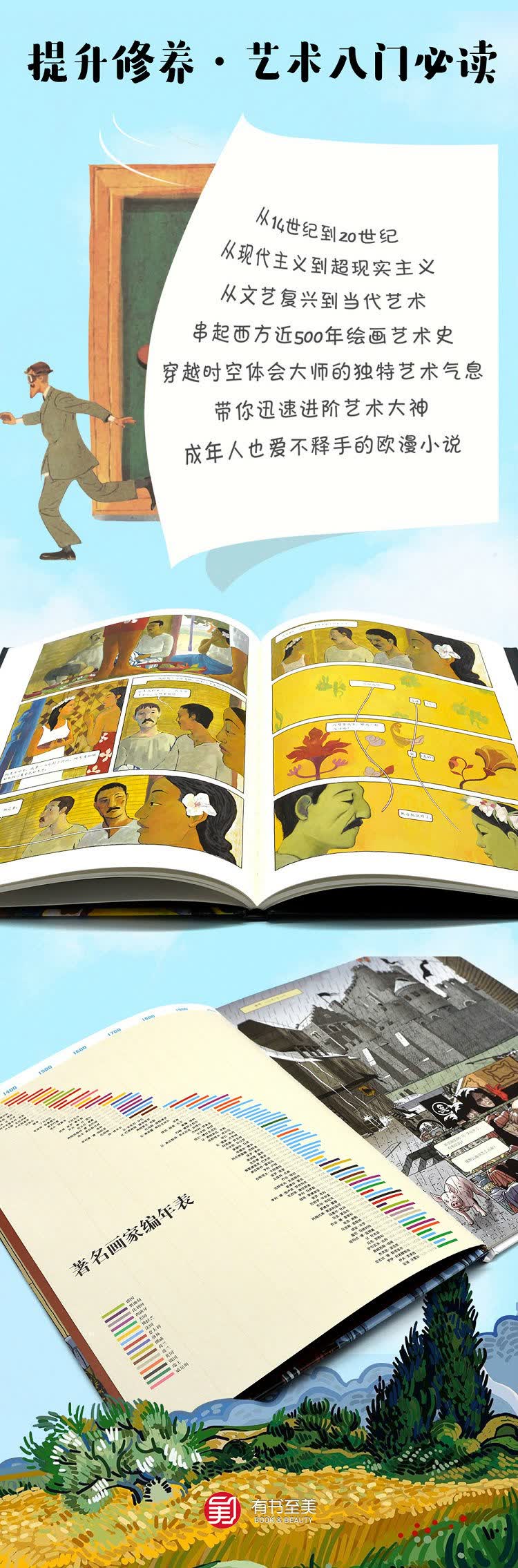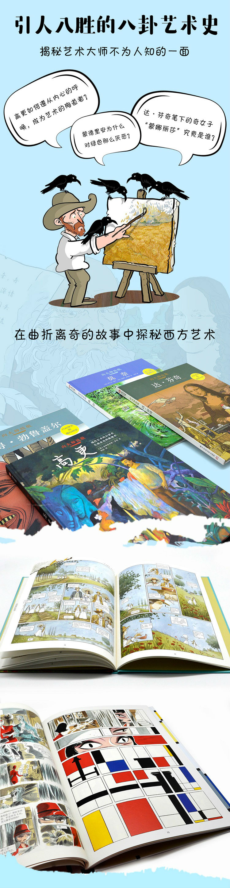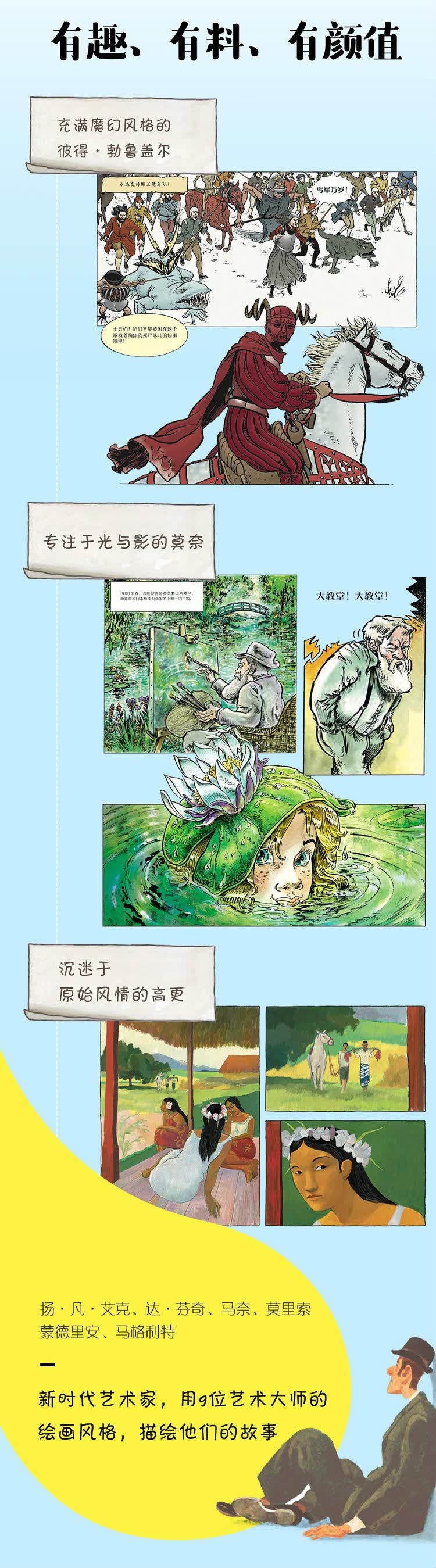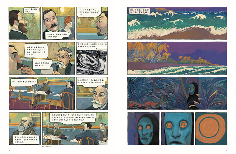 《趣味艺术漫画:半小时读懂艺术大师 高更》作者即以细腻诗意并且颇具高更本人艺术特色的画风,展现了高更如何遵从内心的呼唤,摒弃平凡幸福的生活,虽经受了困顿、病痛的折磨,也要找寻自己认为的生命和艺术的本真。