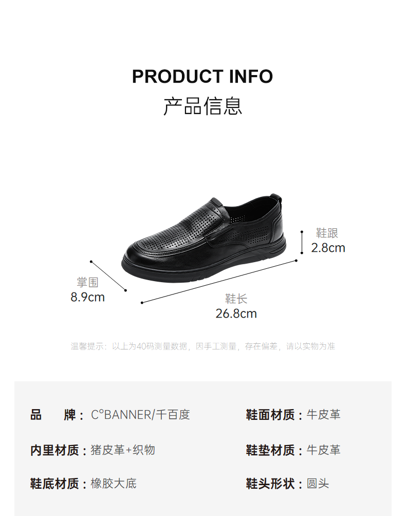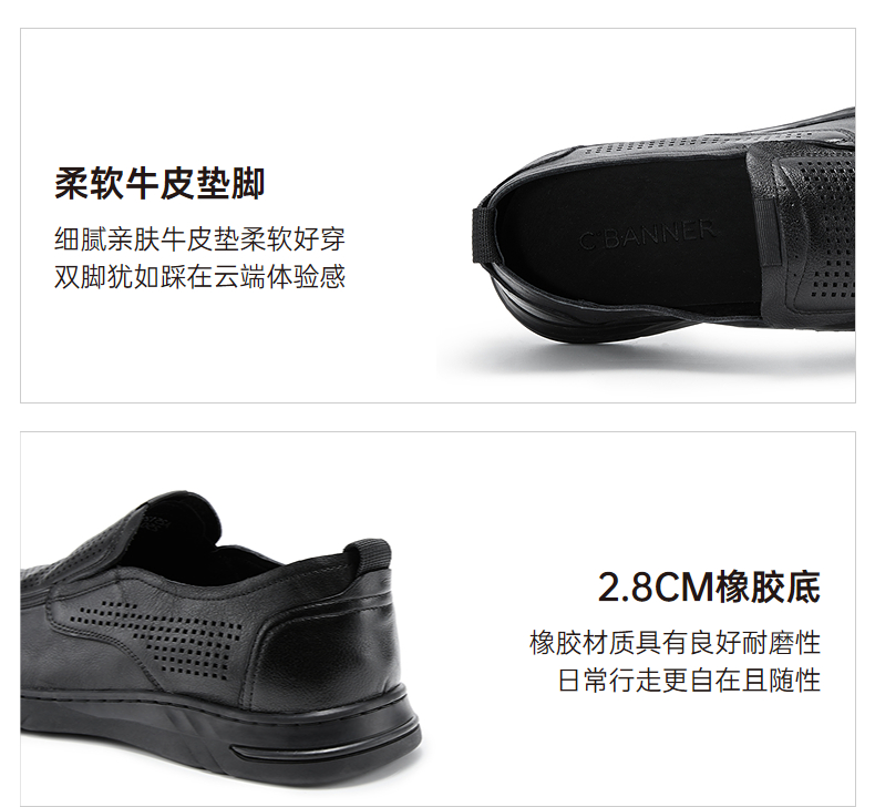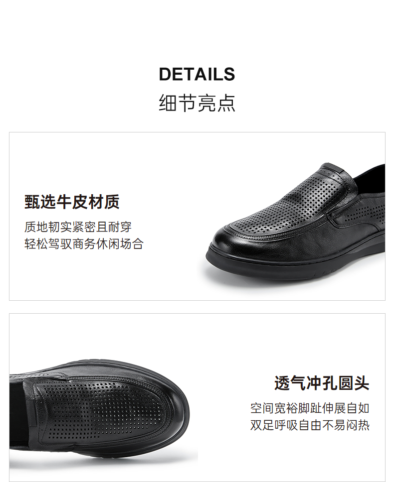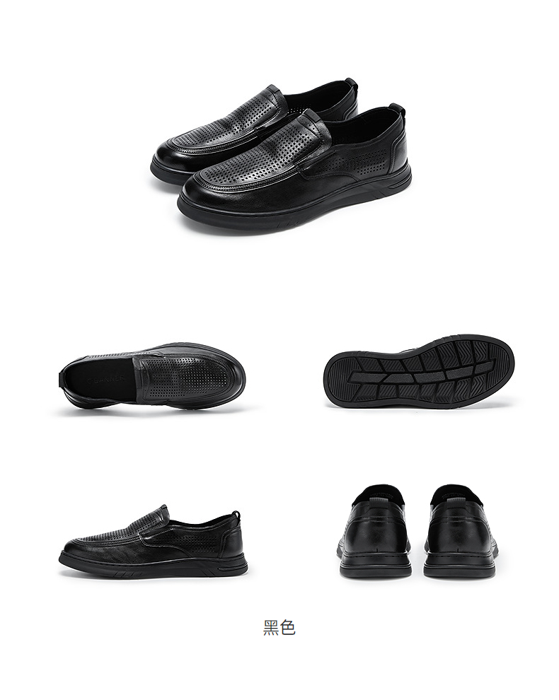 千百度男鞋透气冲孔圆头正装皮鞋黑色一脚蹬休闲皮鞋A25129531