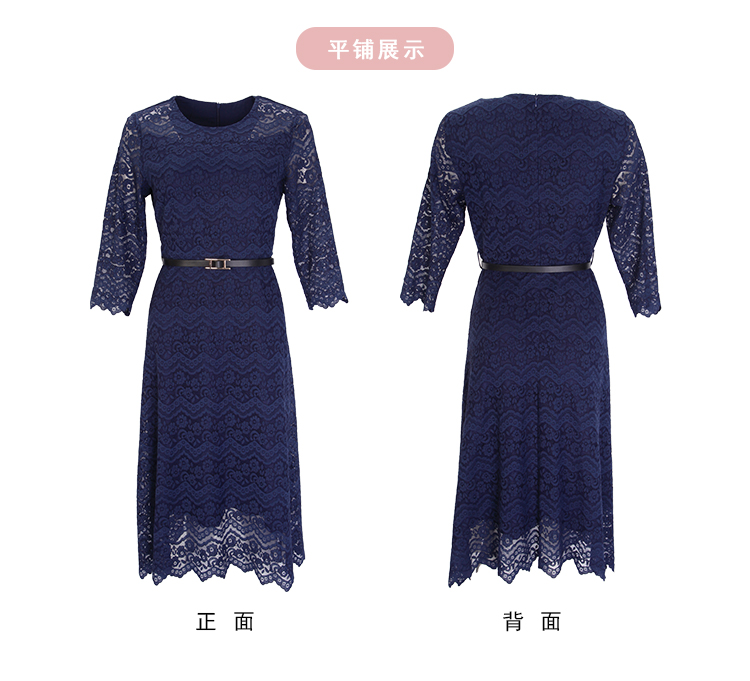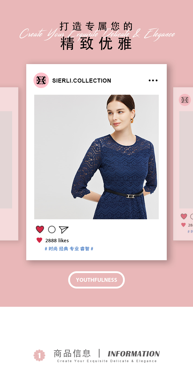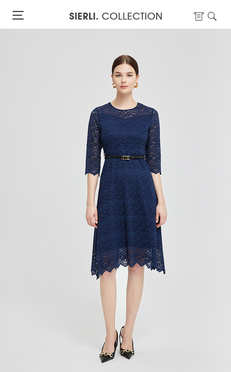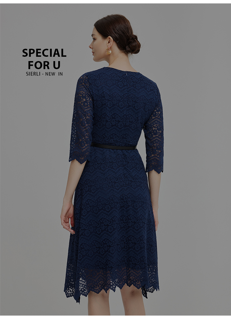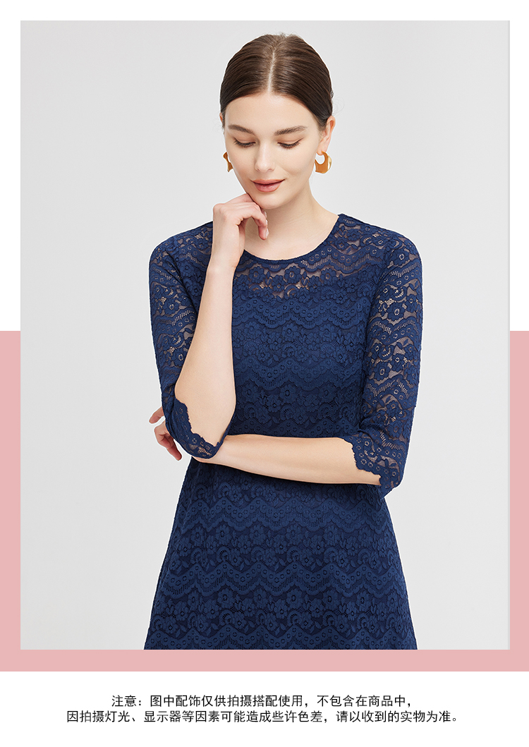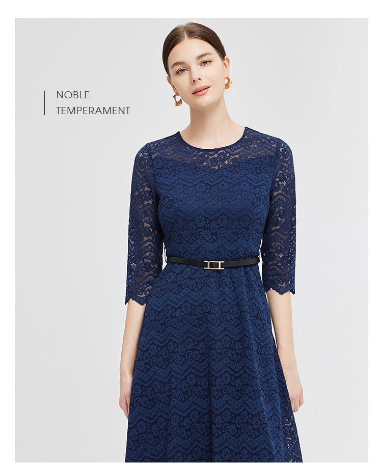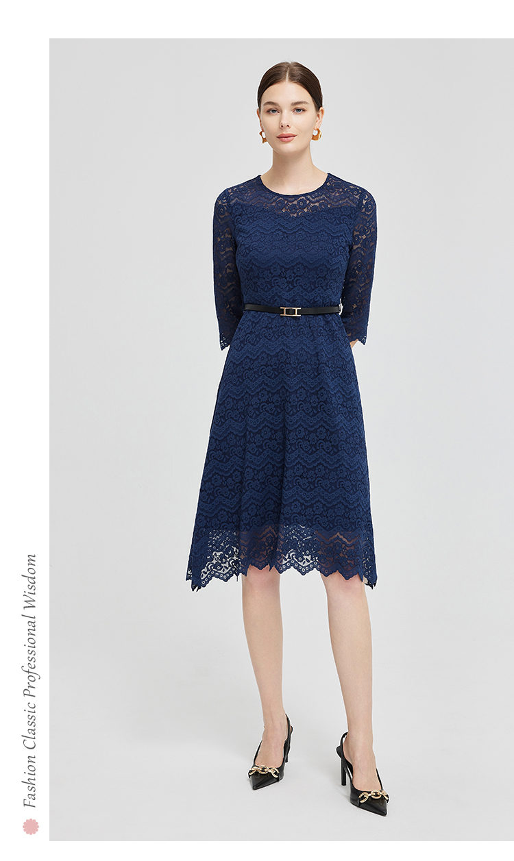NG831斯尔丽2023秋季新款蕾丝实穿修身A摆圆领连衣裙